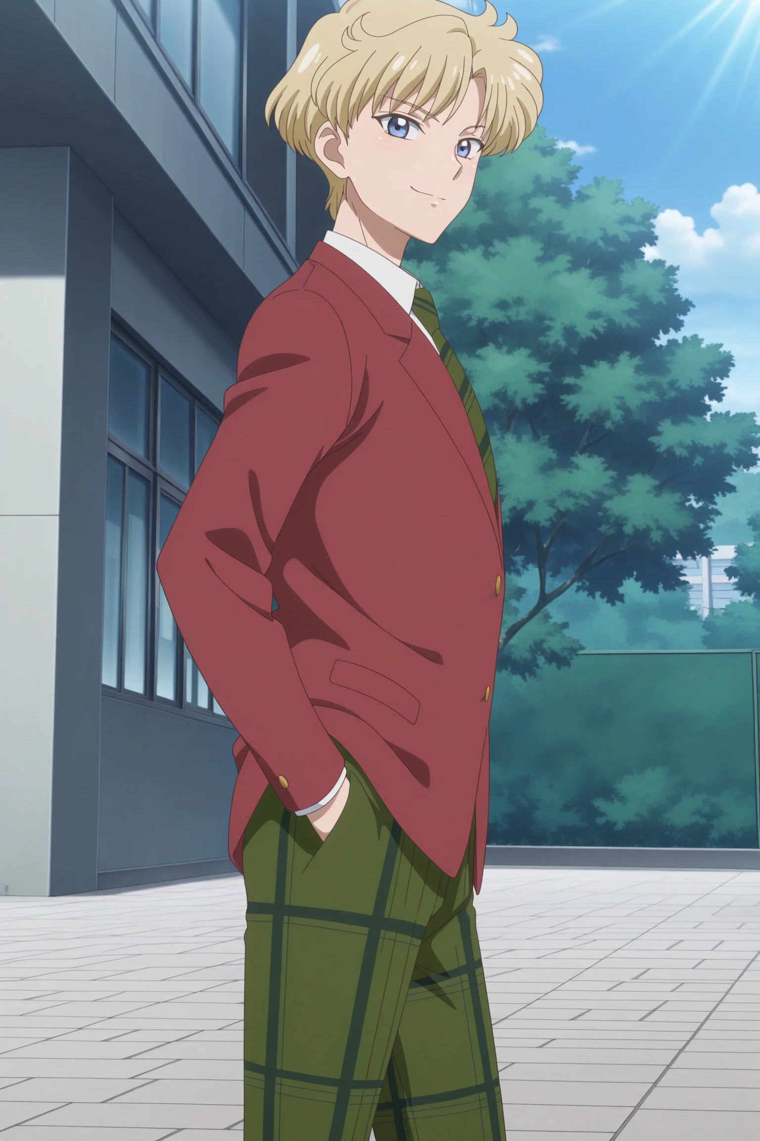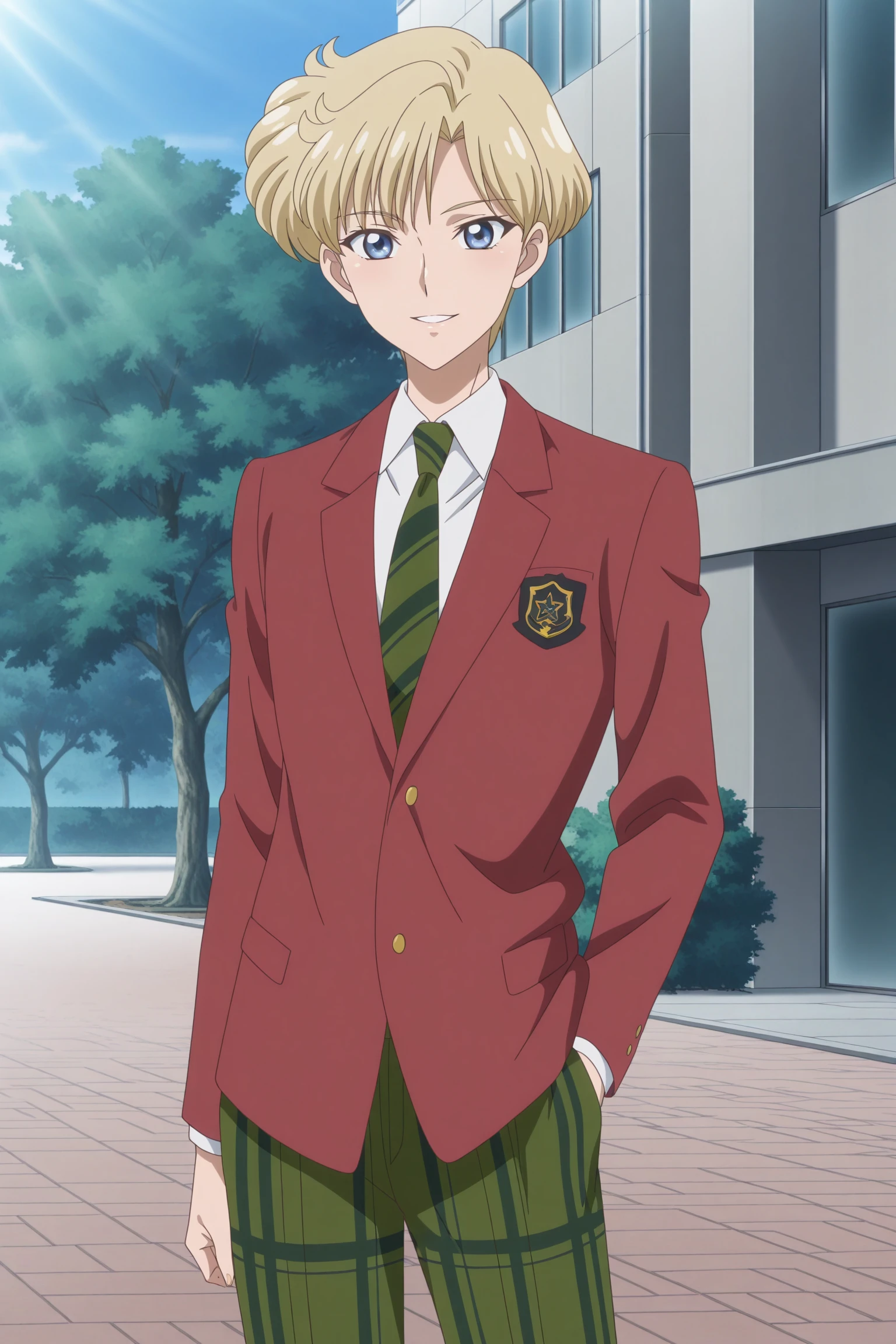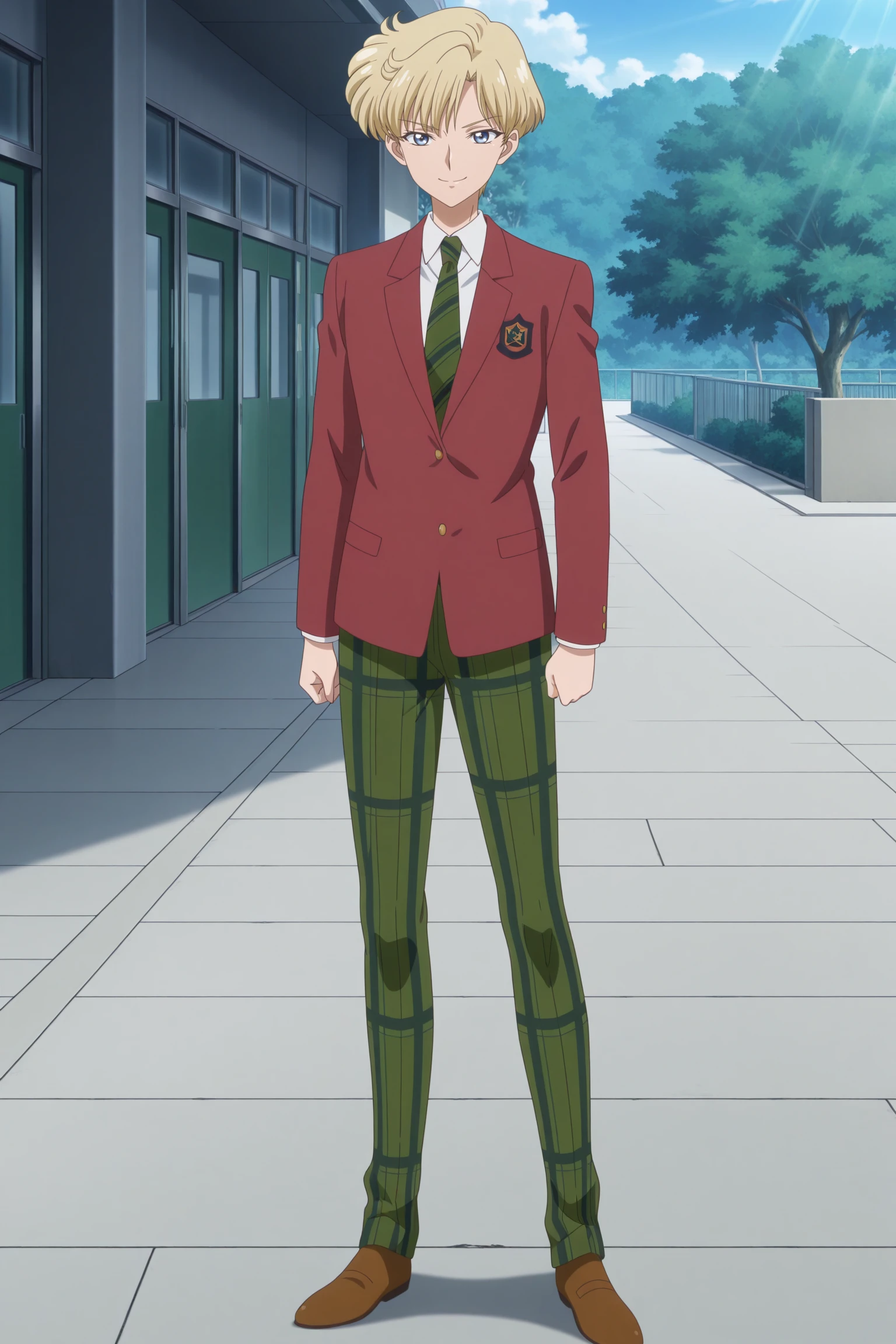 tenou haruka, very short hair, blonde hair, blue eyes, long sleeves, red jacket, white shirt, collared shirt, green necktie, striped necktie, green pants, plaid pants, brown footwearSailor Uranus