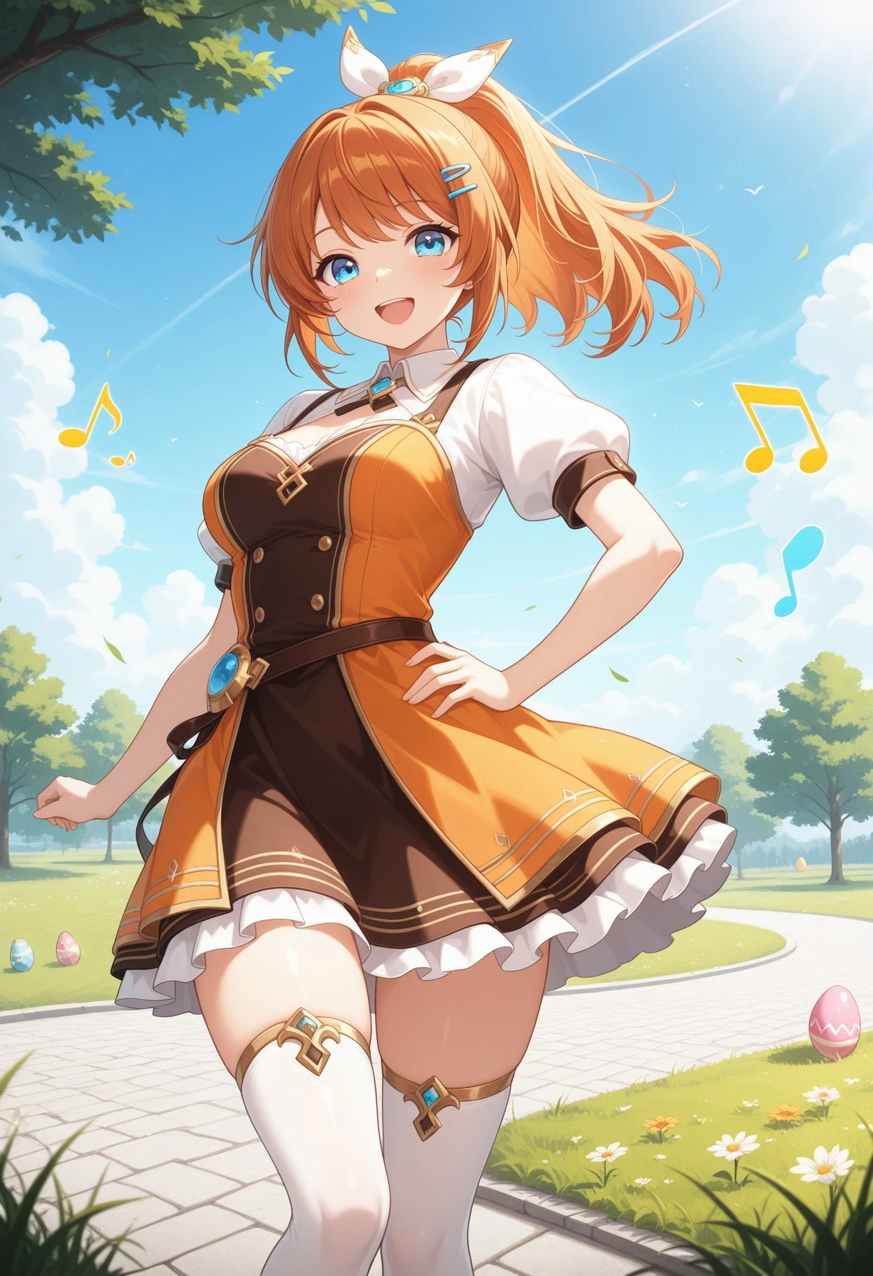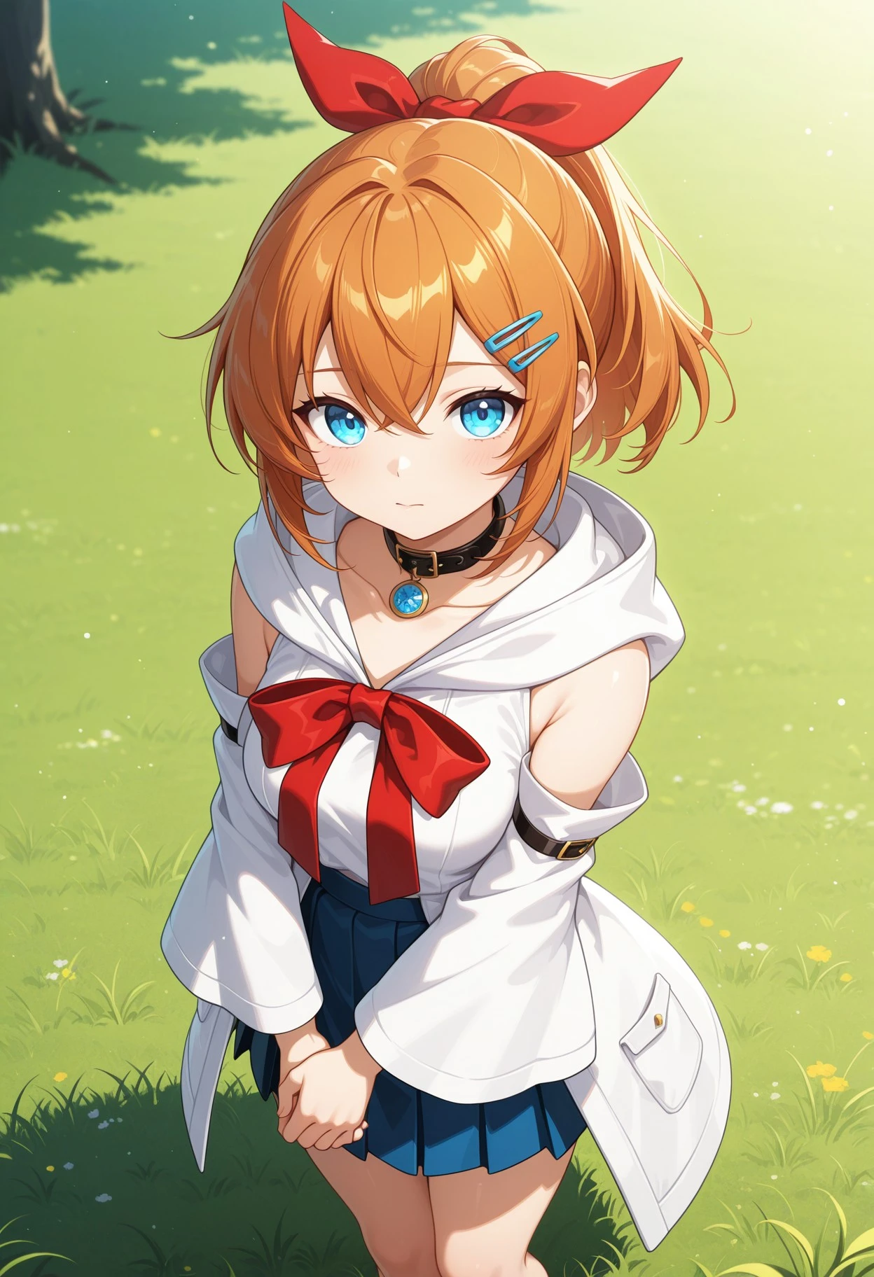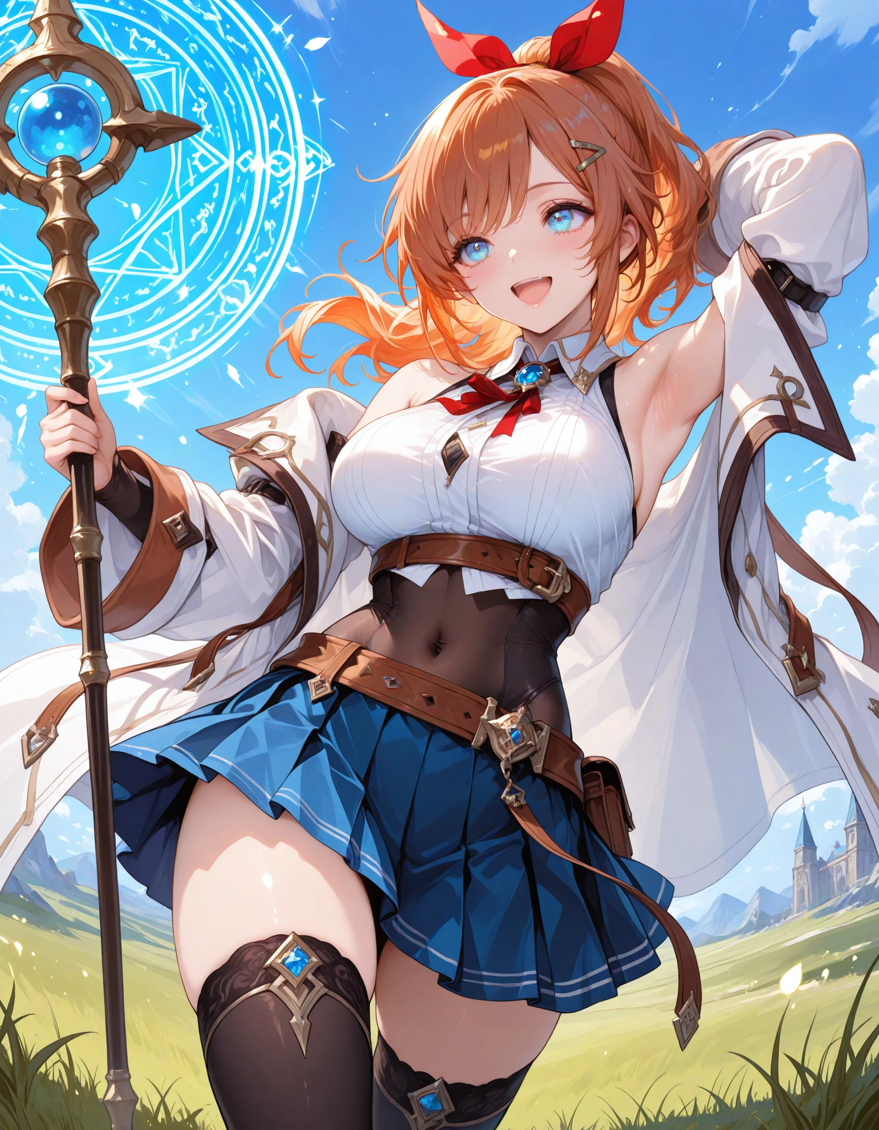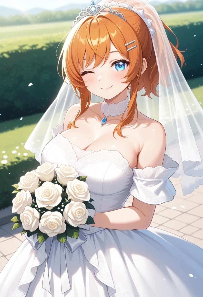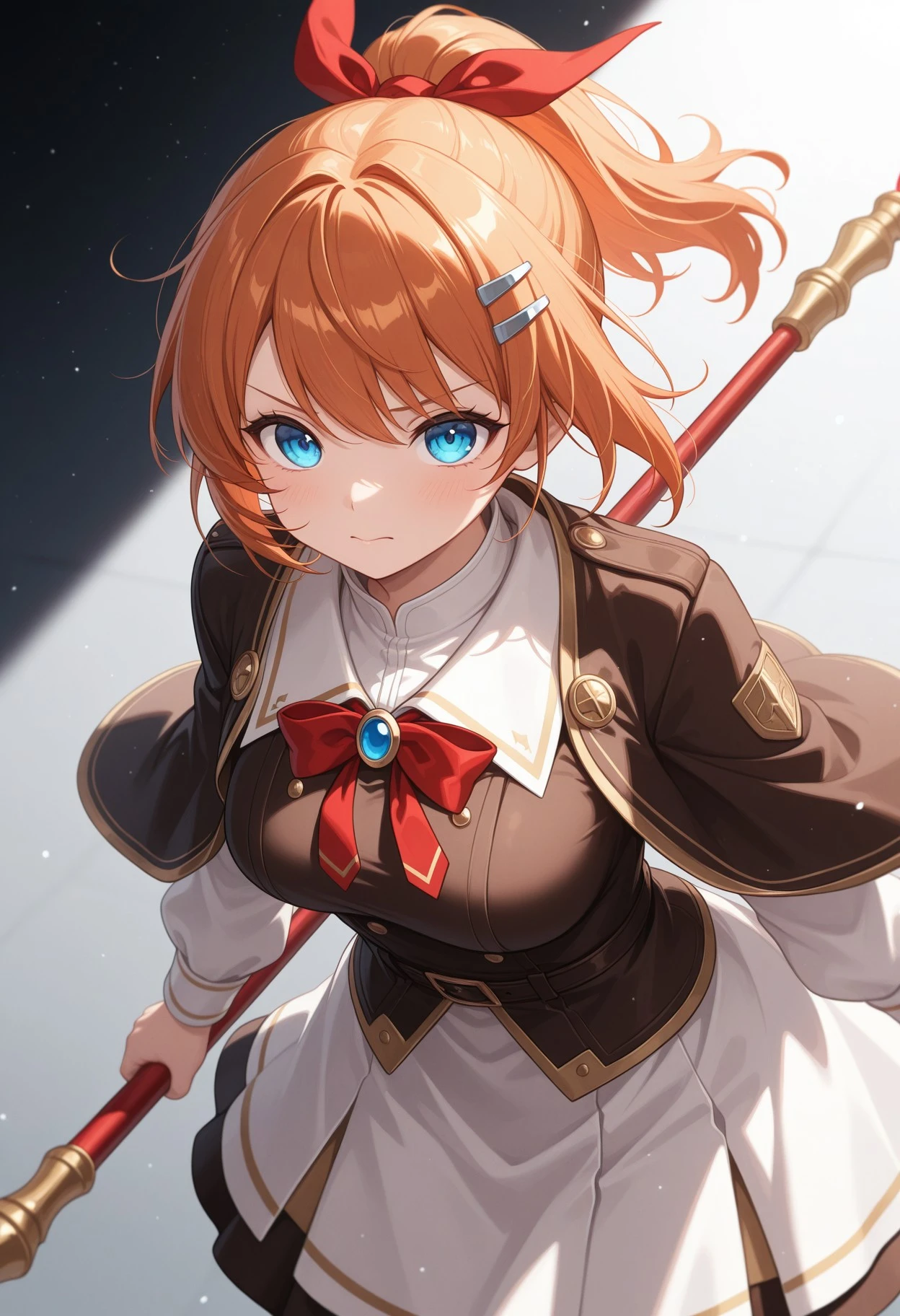 alyssa_kmhmpj, solo, long hair, brown hair, orange hair, blue eyes, large breasts, ponytail, hairclip