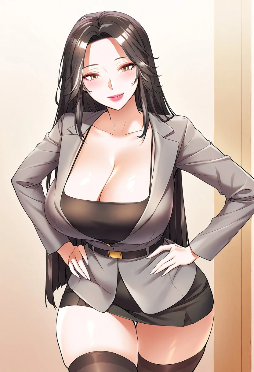 2. ((grey suit jacket with black belt, sexy short black camisole, obscene cleavage, huge cleavage, sexy short black pencil skirt, sexy sheer black thighhighs, )) necklace with small pendant, midriff, red latex luxury bag with gold chain straps, luxury black sunglasses,