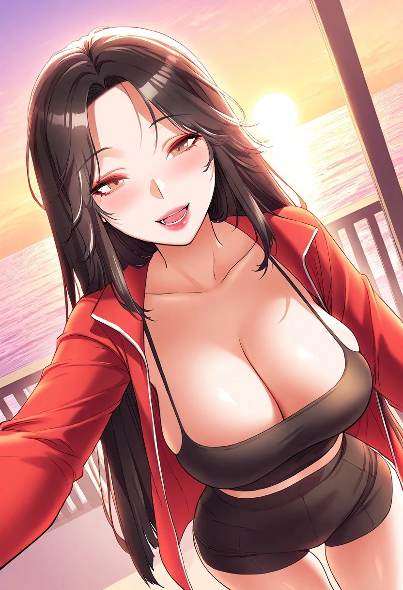10. ((open red sport jacket, black camisole, obscene cleavage, huge cleavage, black sport shorts, white sport shoes, )) sexy white bra, sexy white panties,