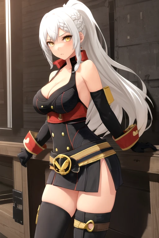 ReiOnechanbara, 1girl, solo, long hair, large breasts, thighhighs, elbow gloves, cleavage, bare shoulders, yellow eyes, ponytail, braid, white hair, belt, black dress, side slit, miniskirt