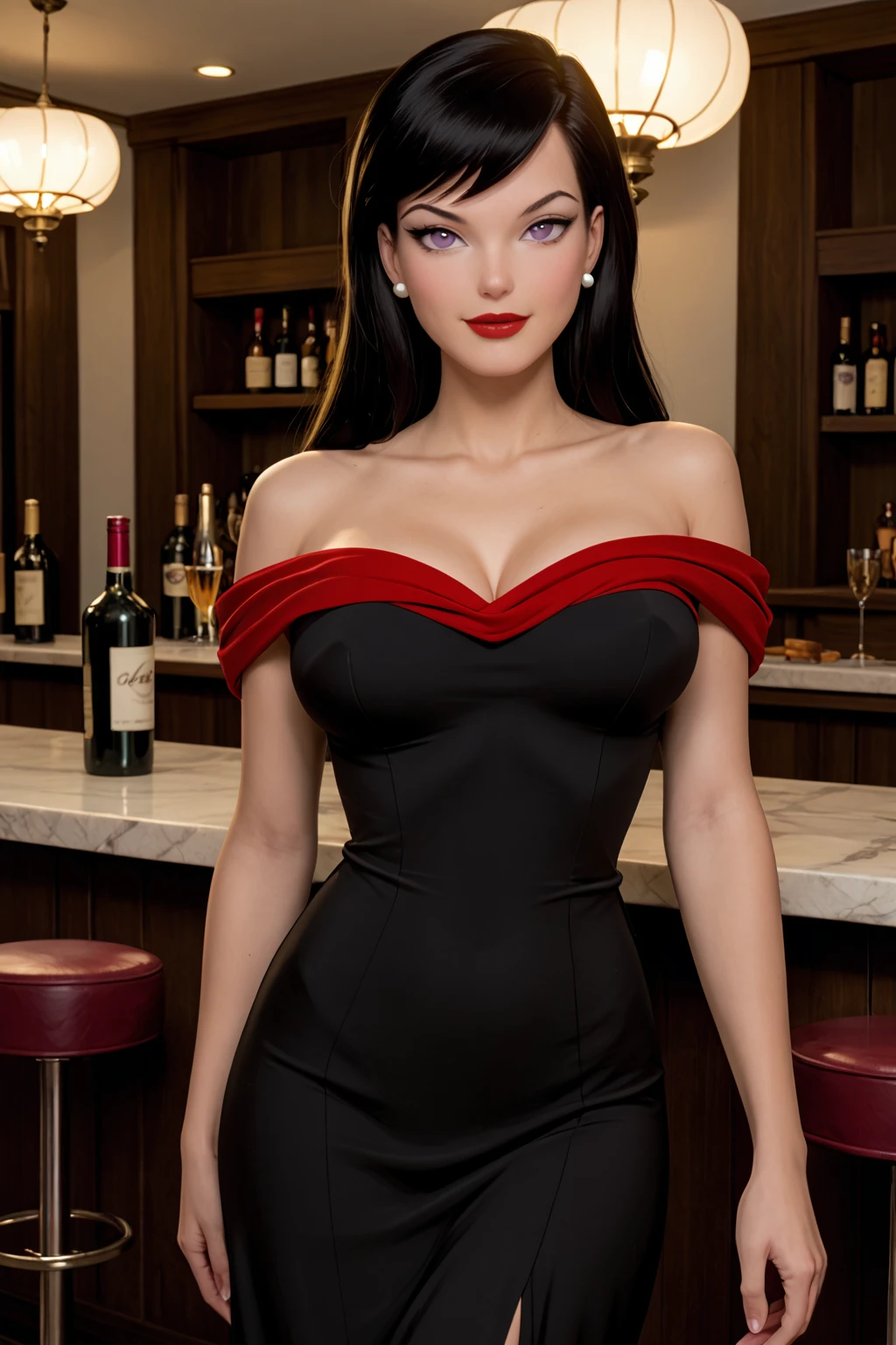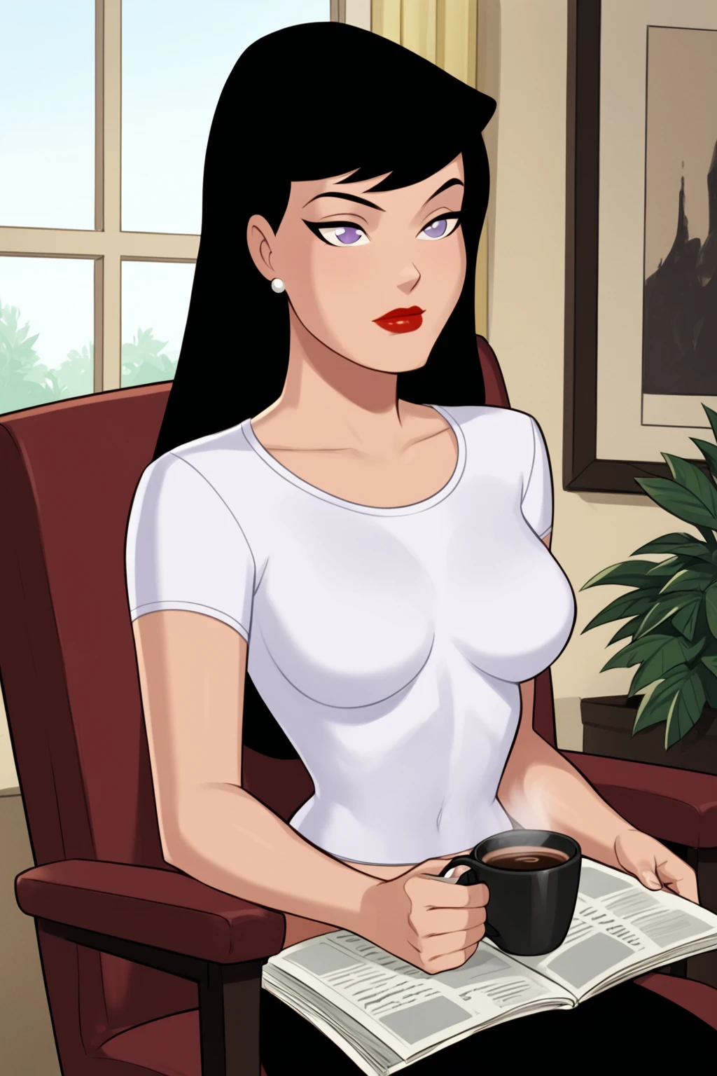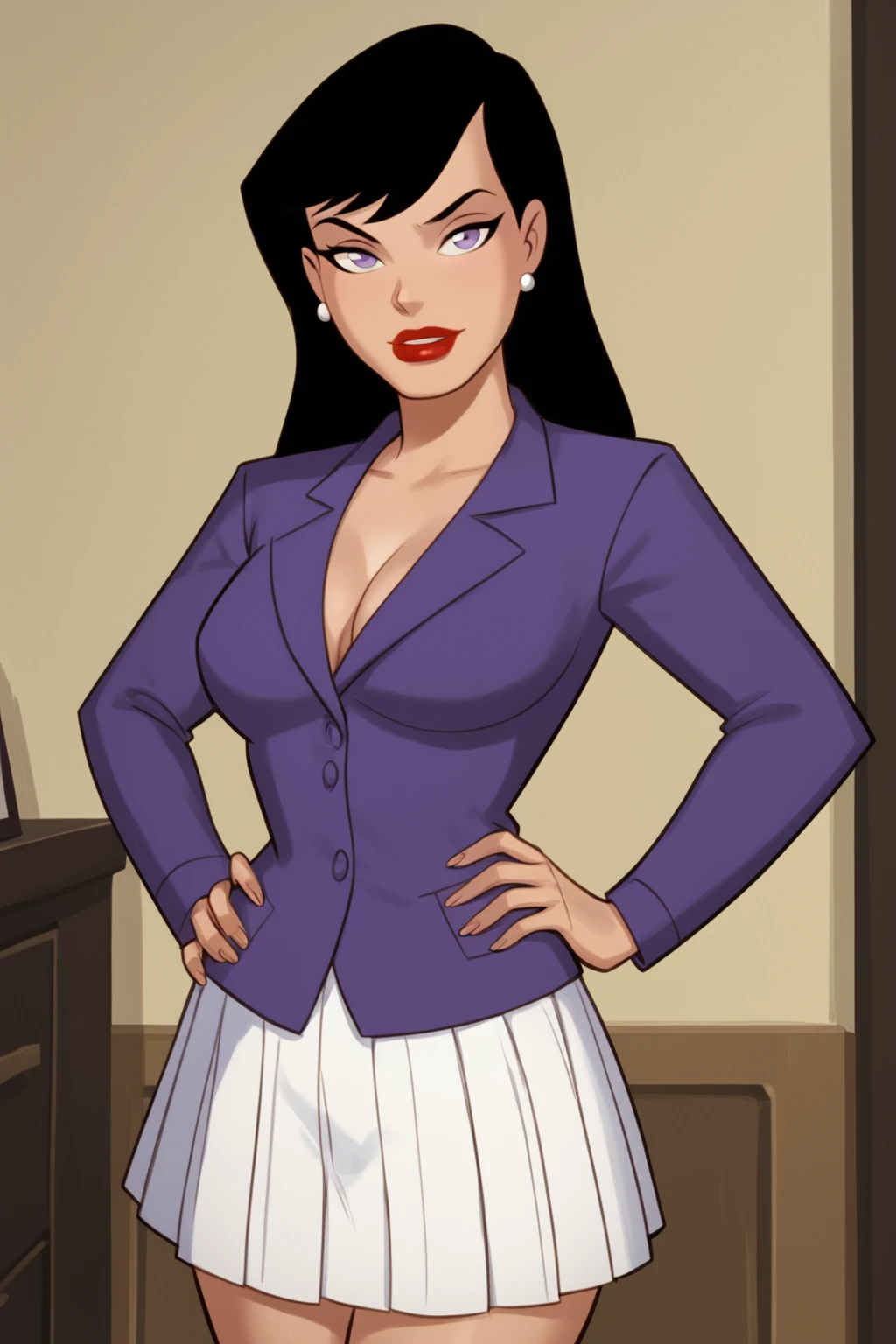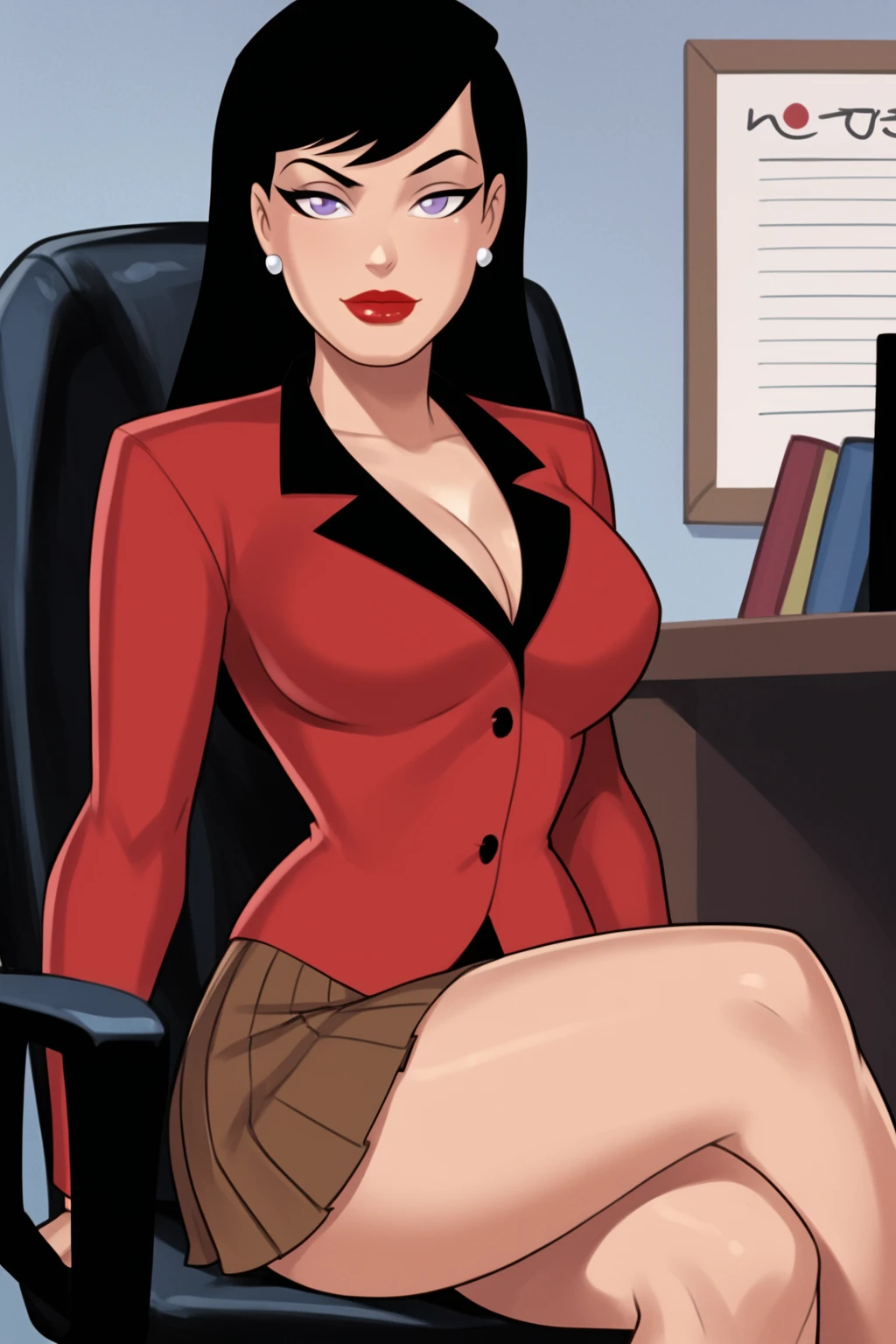 Base Prompt: lois lane, long hair, black hair, purple eyes, red lips