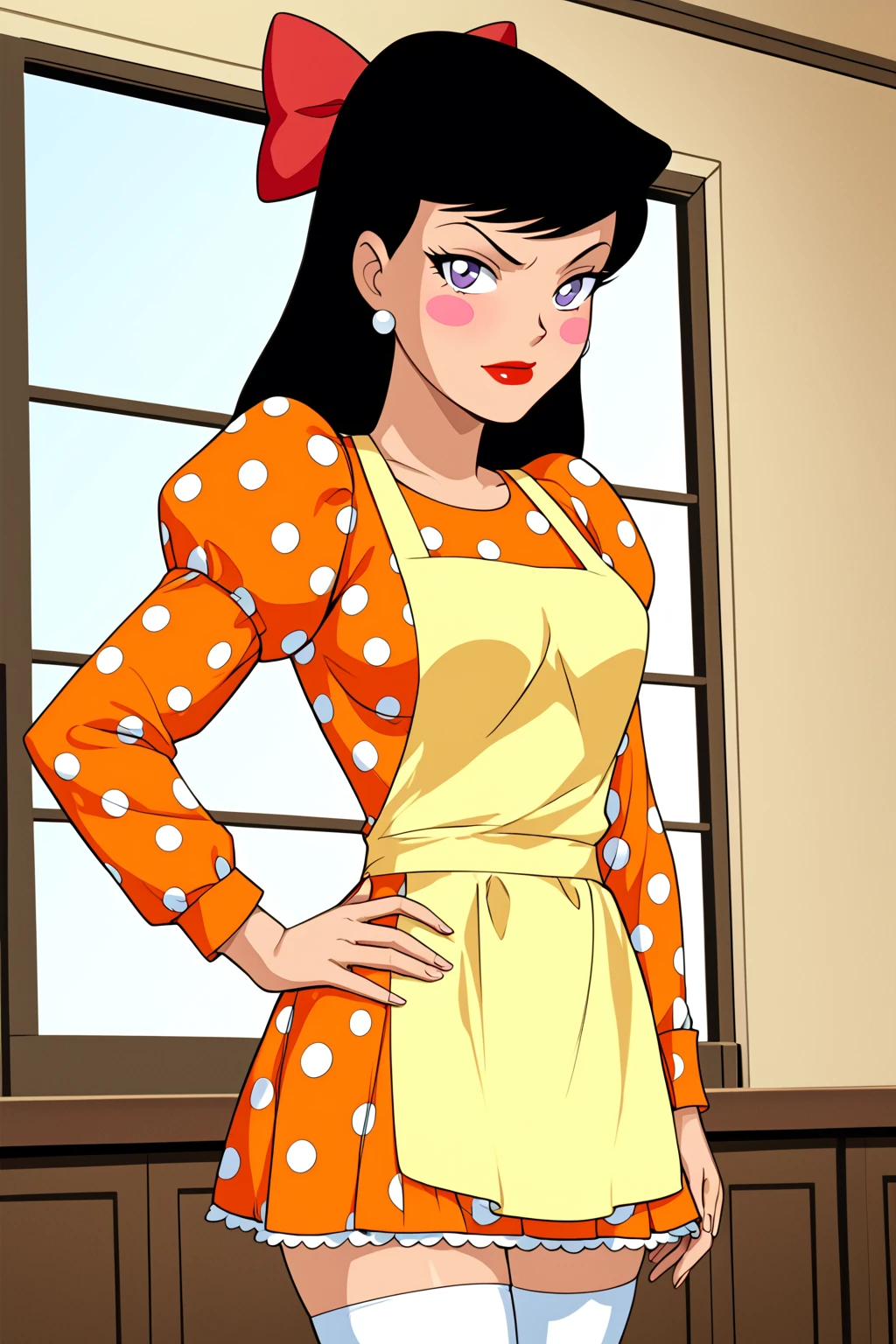 Toyman's Doll: hair bow, red bow, bow, blush stickers, makeup, polka dot, polka dot dress, orange dress, yellow apron, long sleeves, puffy sleeves, jewelry, earrings, skirt, thighhighs, heels