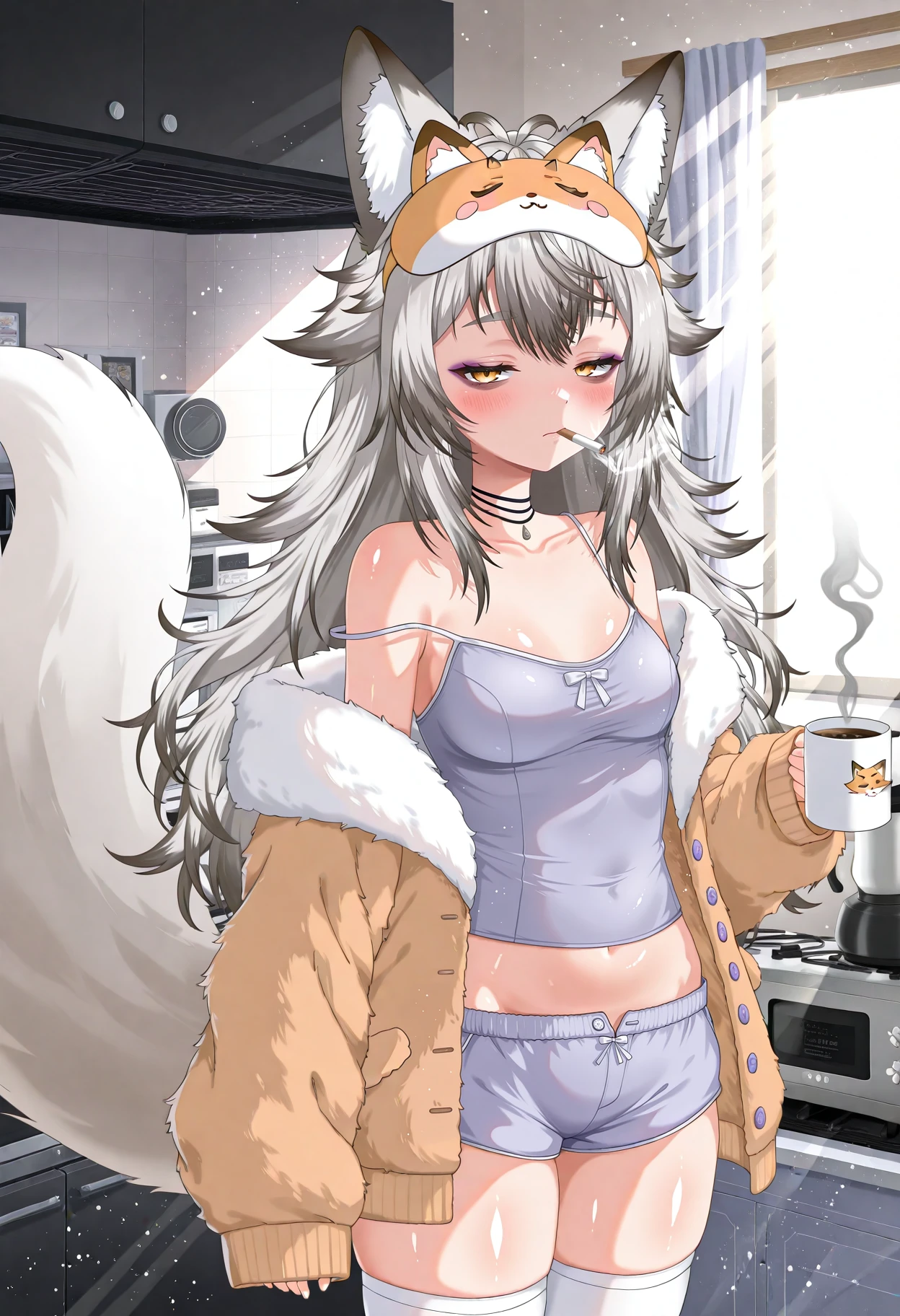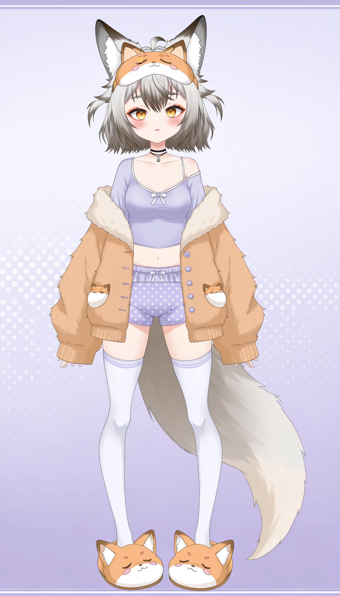 KitsuraNinesJammies, 1girl, animal ears, grey hair, multicolored hair, colored tips, yellow eyes, fox ears, tail, shorts, white thighhighs, virtual youtuber, animal slippers, animal ear fluff, sleeves past wrists, fur jacket with lavender colored buttons, off shoulder, crop top, blush, choker, black eyeliner, sleep mask,