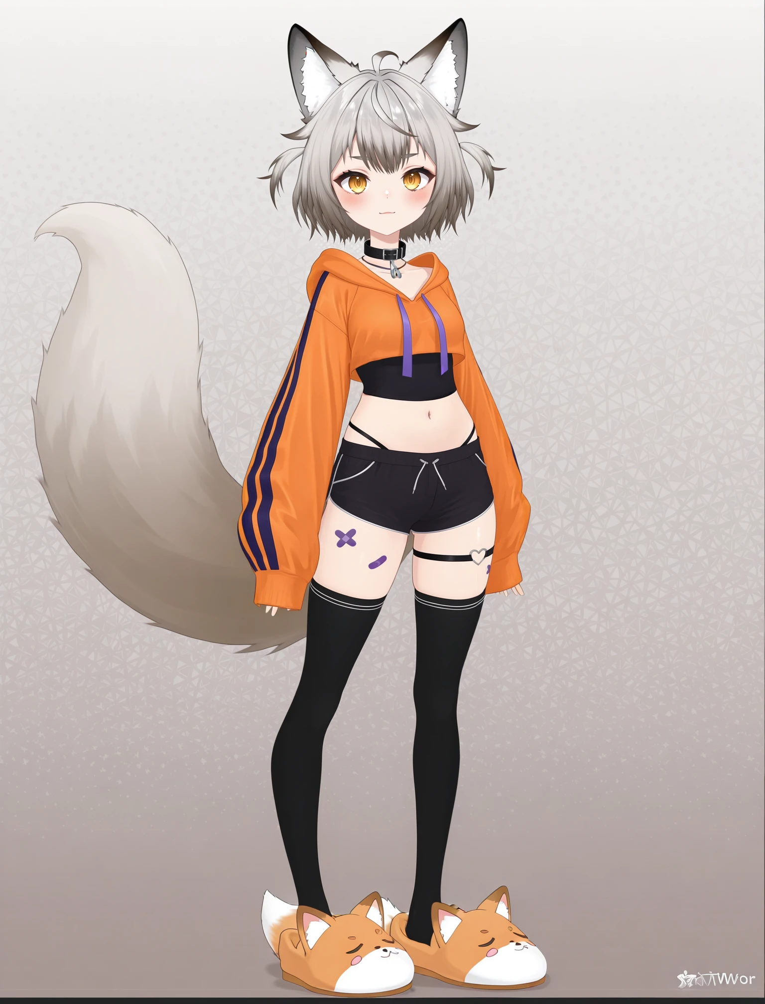 KitsuraNines, 1girl, animal ears, fox ears, tail, shorts, black thighhighs, virtual youtuber, black shorts, exposed thong, orange cropped hoodie, hood, animal slippers, grey hair, heart thigh strap, animal ear fluff, sleeves past wrists, collar, purple bandaids,