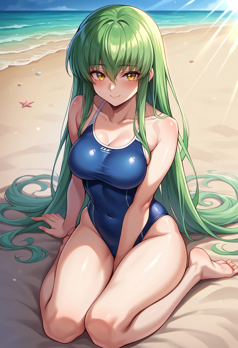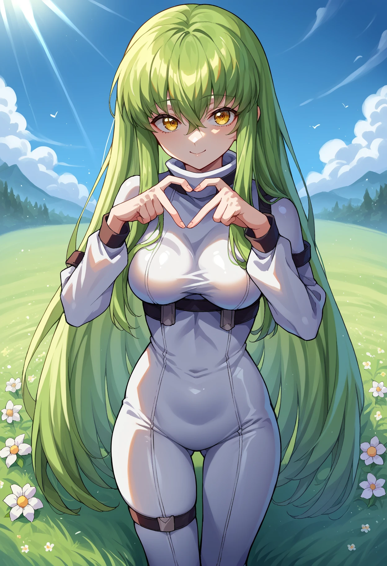 cc_def, yellow eyes, green hair, hair between eyes, long hair, straight hair, white bodysuit, long sleeves