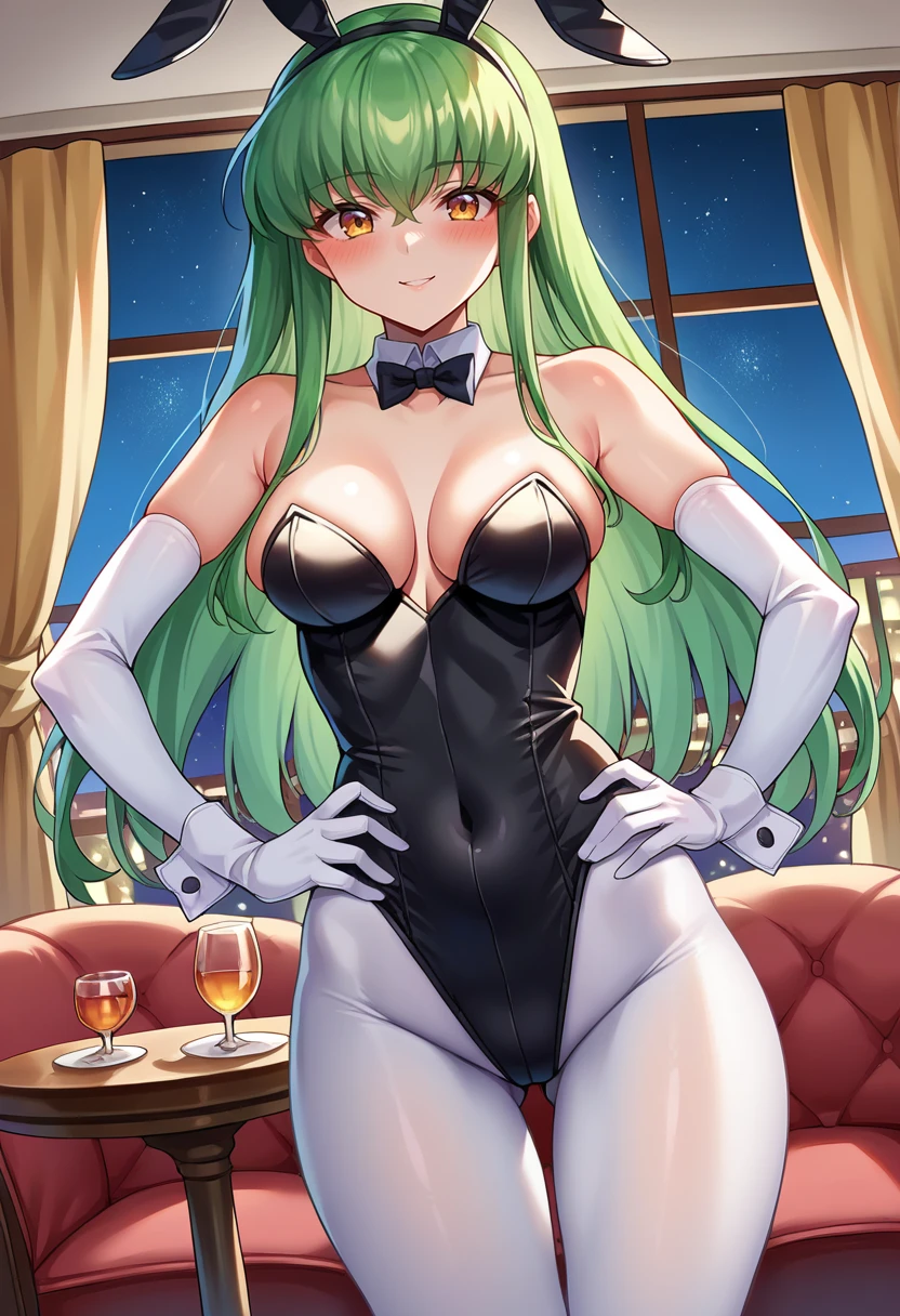 Outfit 1: ["cc_def, yellow eyes, green hair, hair between eyes, long hair, straight hair, white bodysuit, long sleeves"]