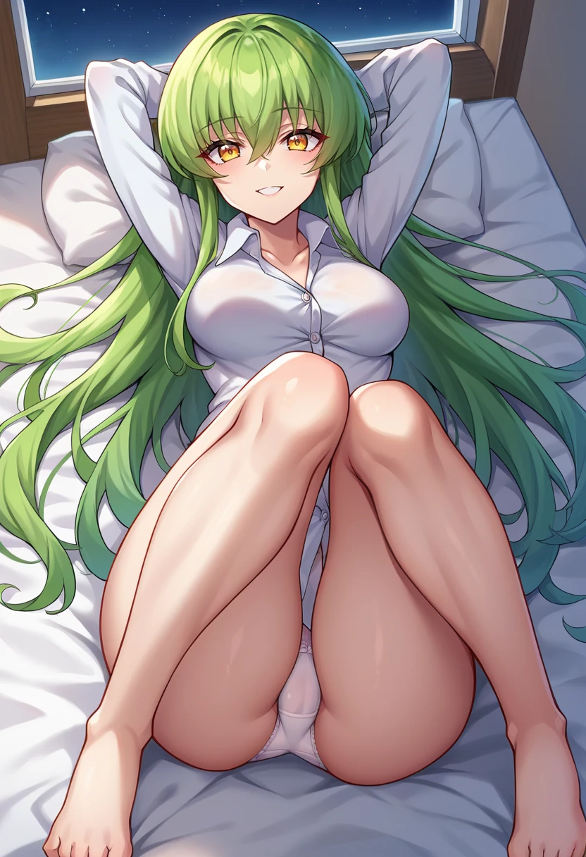 Outfit 2: ["cc_ws, yellow eyes, green hair, hair between eyes, very long hair, straight hair, medium breasts, white shirt, dress shirt, long sleeves, collared shirt, ????? shirt"]