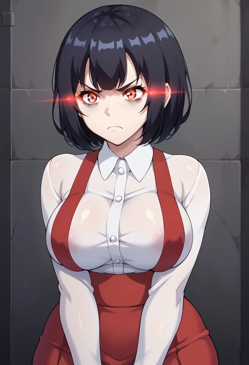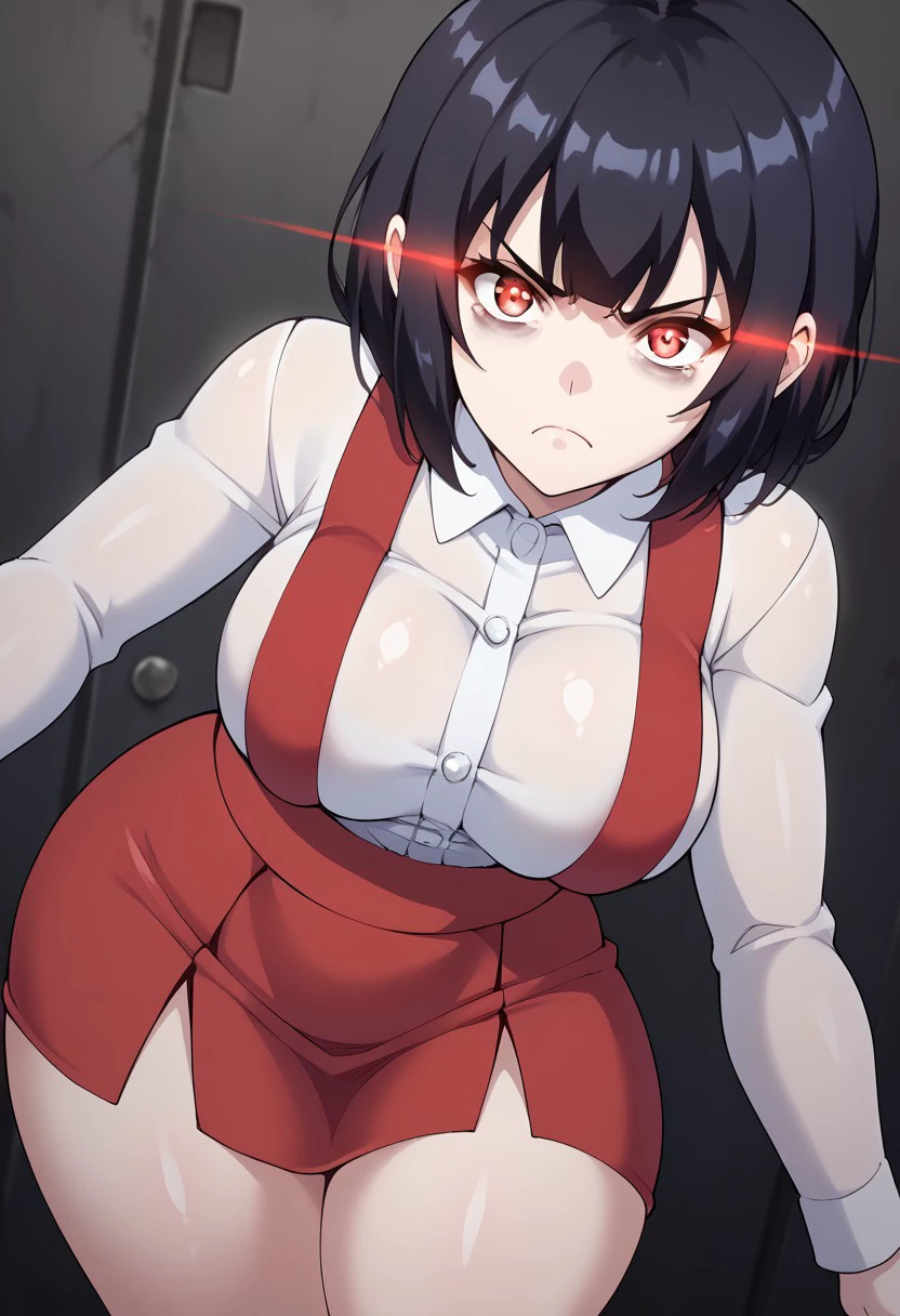 Hanako-san, 1girl, black hair, short hair, red eyes, bags under eyes, pale skin, glowing eyes, school uniform, white shirt, collared shirt, long sleeves, red skirt, suspenders, big breasts, white socks, loafers,