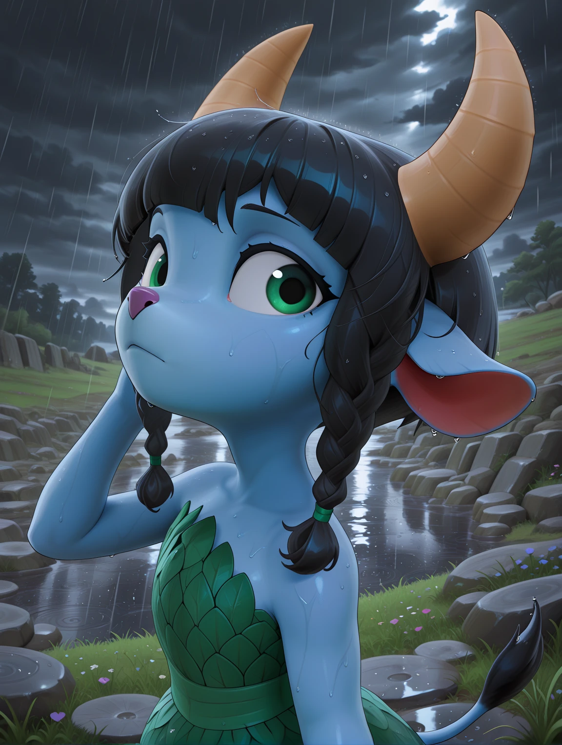 Additional tags: furry female, blue skin, green eyes, black hair, short hair, braided sidelocks, bone horns, animal ears, purple animal nose, animal feet, cow tail, hooves, green leaf dress,