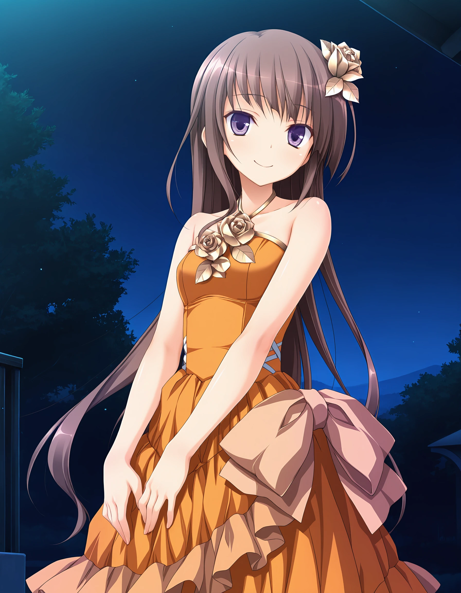 outfit04, dress, party dress, long dress, orange dress, frilled dress, large ribbon decollated dress, halter neck dress, rose accessory on dress, rose hair ornament,