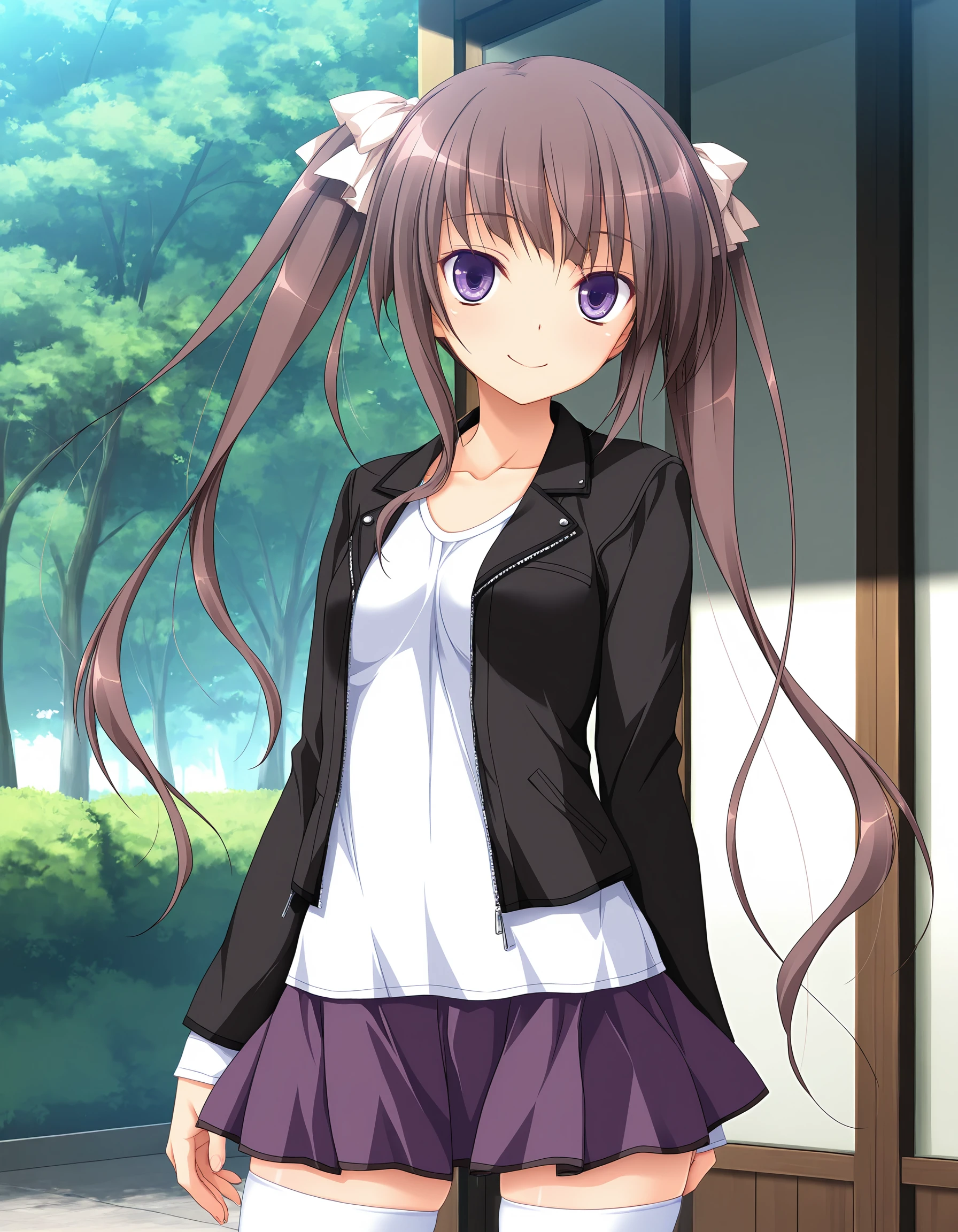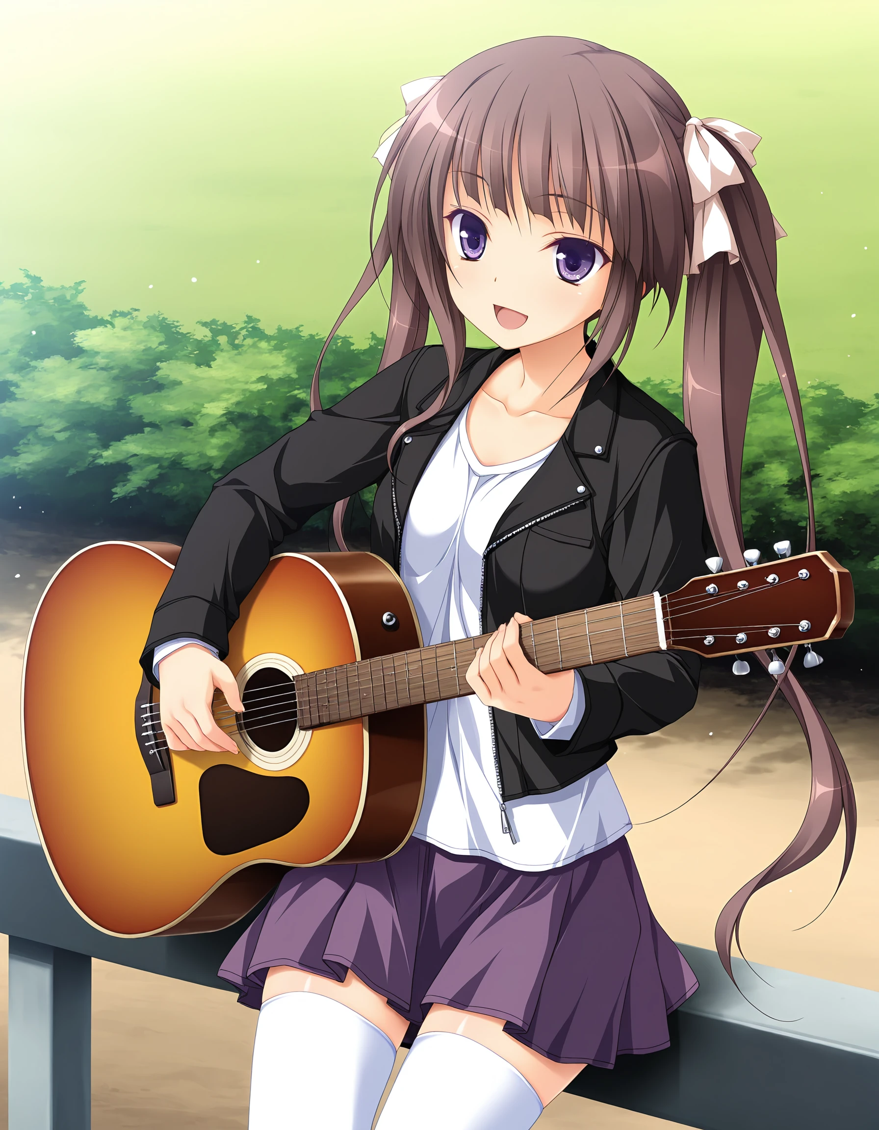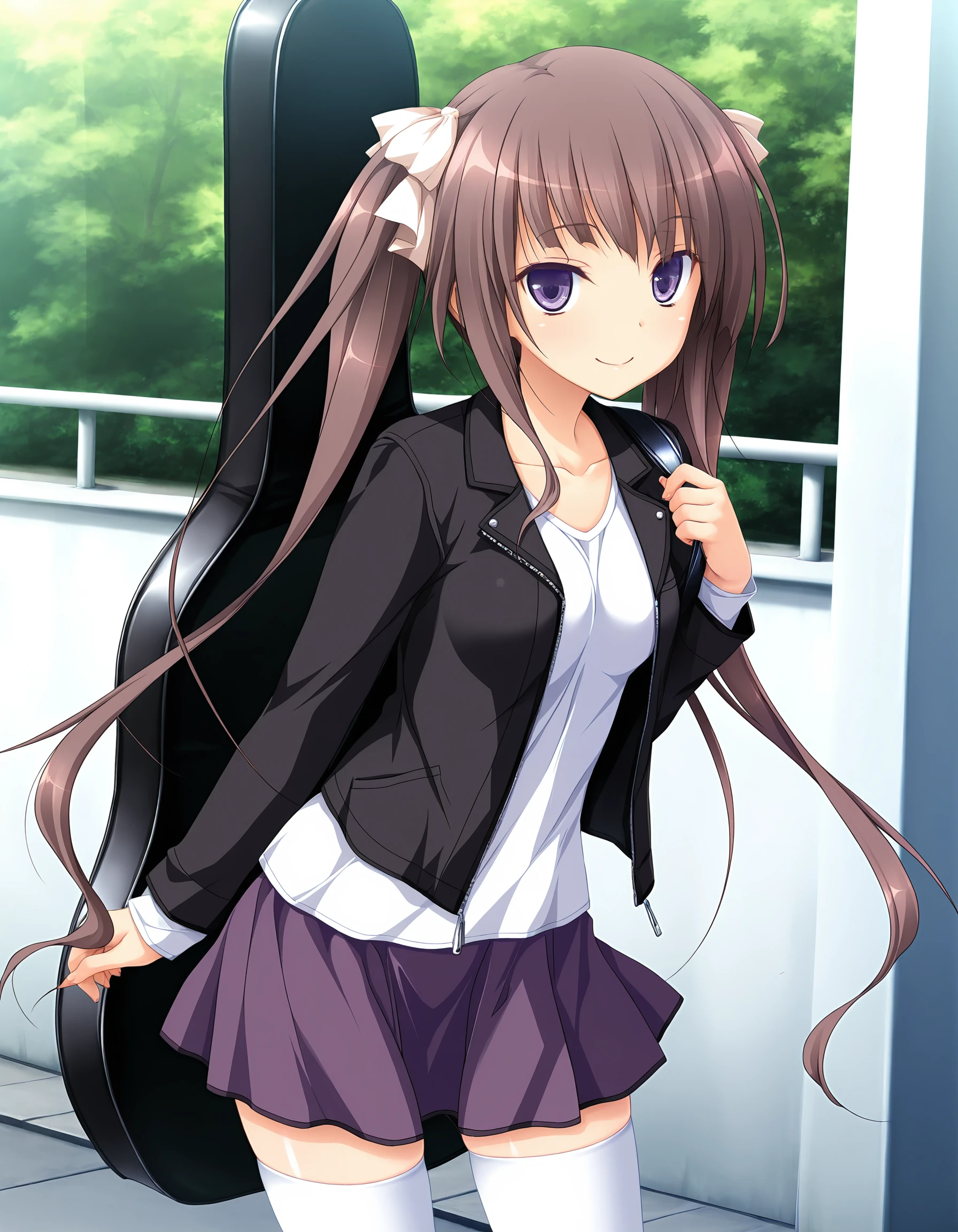 outfit02, jacket, black jacket, double rider's jacket, long sleeves, shirt, white shirt, skirt, flared skirt, purple skirt, tighhighs, white tighhighs, zettai ryouiki, collarbone, open clothes, open jacket, {guitar case, carry guitar case| acoustic guitar, playing guitar|}