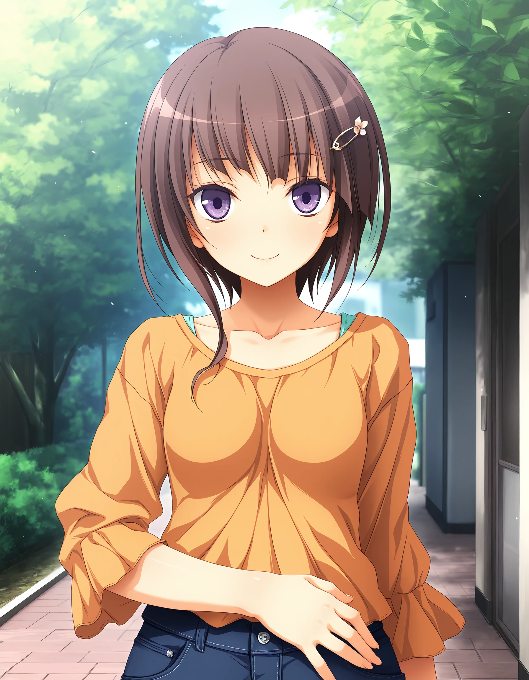 keiko-hirasaka, brown hair, eyebrows through bangs, purple eyes, medium breasts,