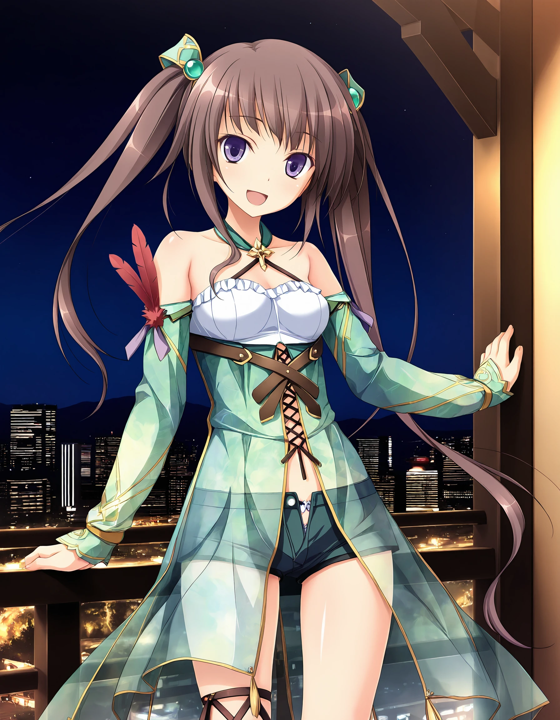 outfit03, hair ornaments, green ornaments, tube top, white tube top, frilled tube top, dress, green dress, cross halter neck dress, see-through dress, lace-up dress, detached sleeves, gold lines, leaf-like gradient pattern dress, feathers on sleeve, red feather, shorts, short shorts, pantie peak, legwear, lace-up legwear,