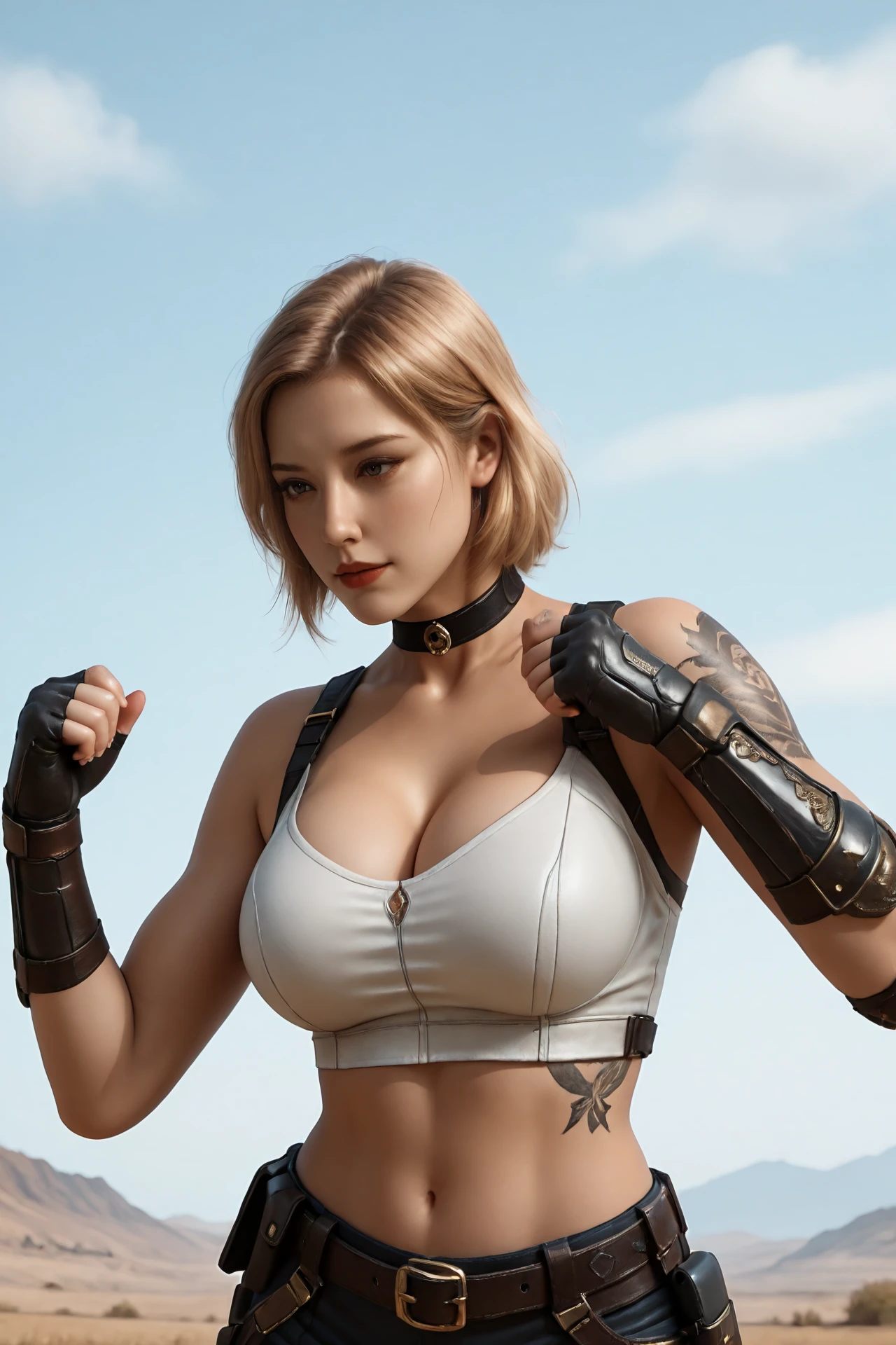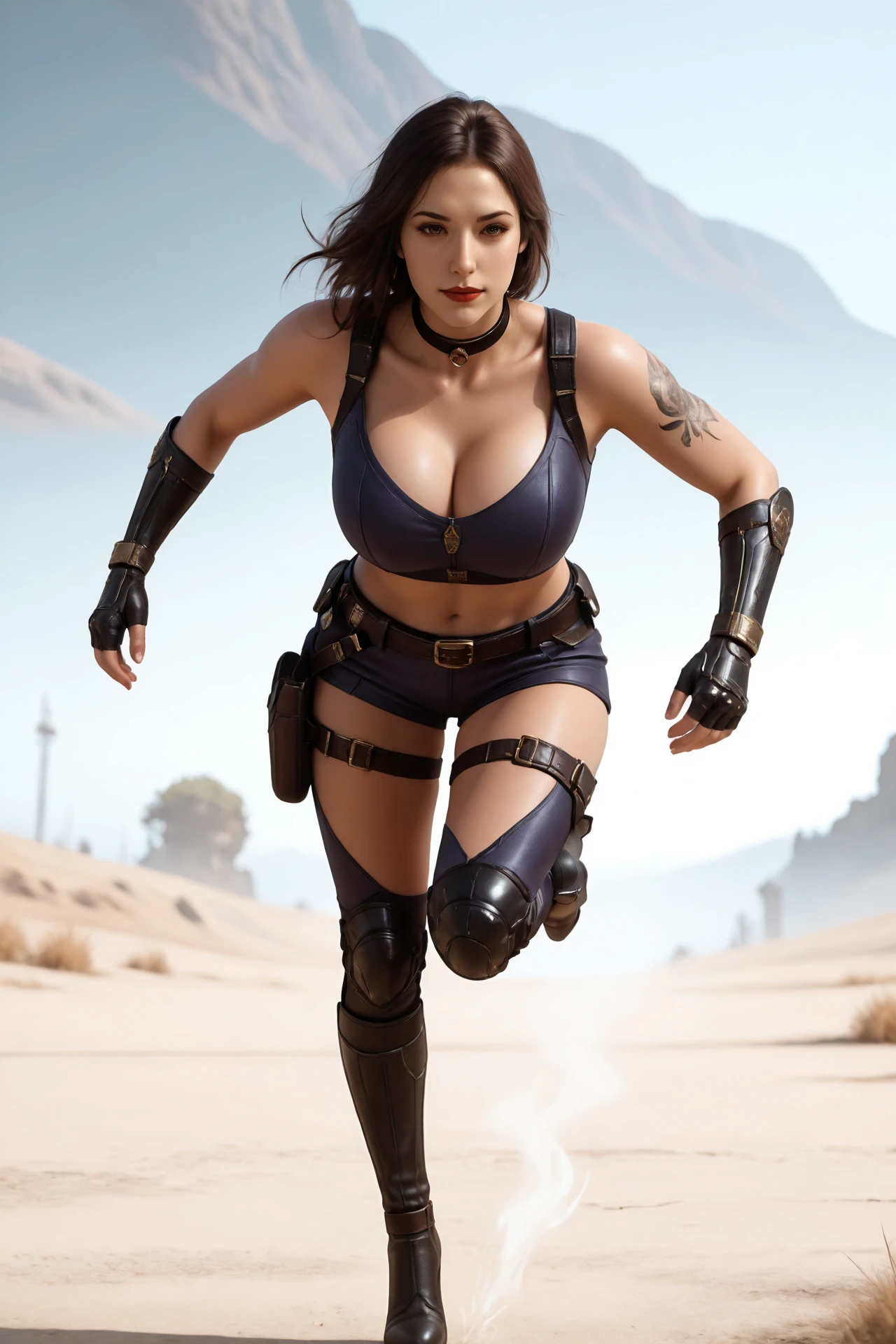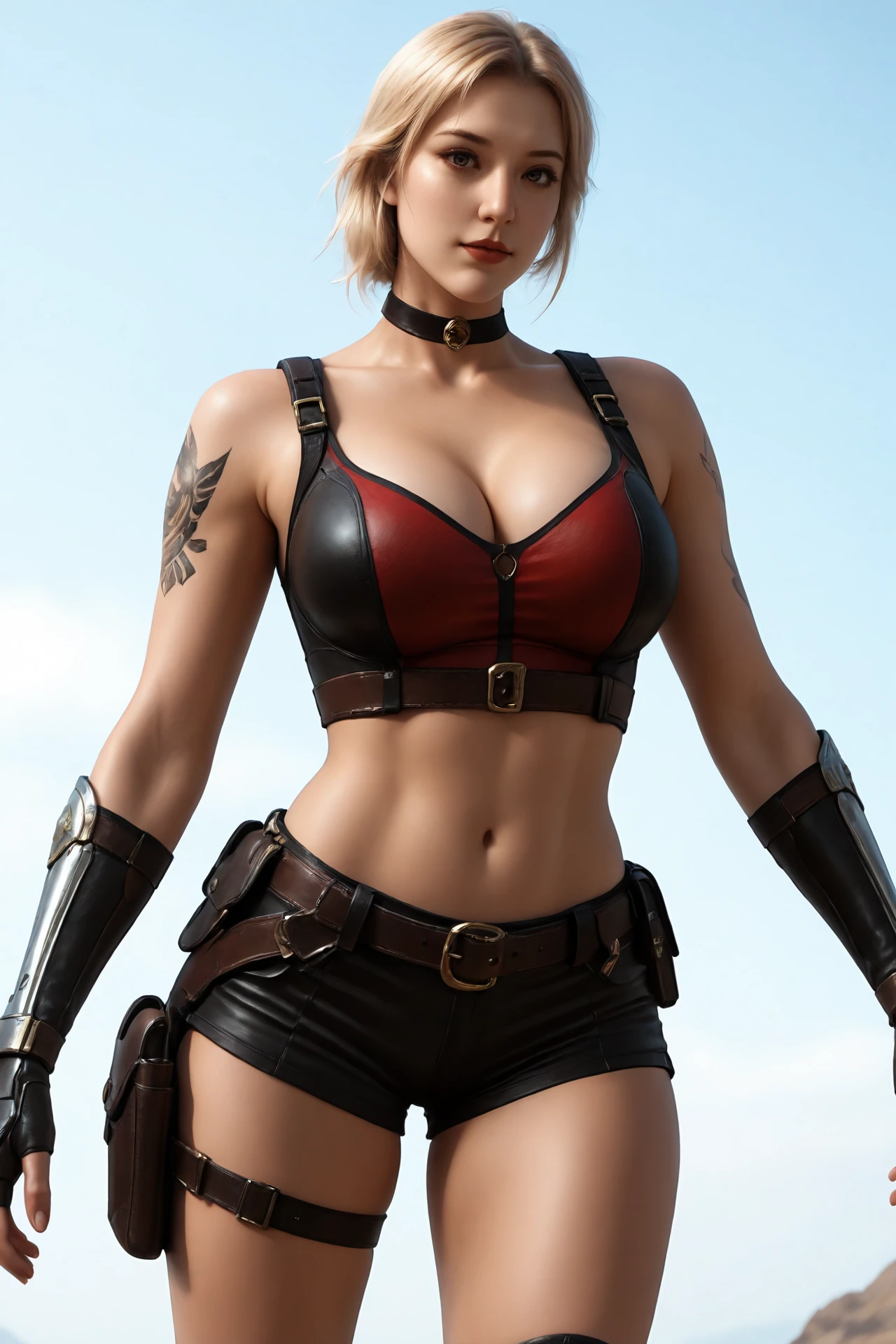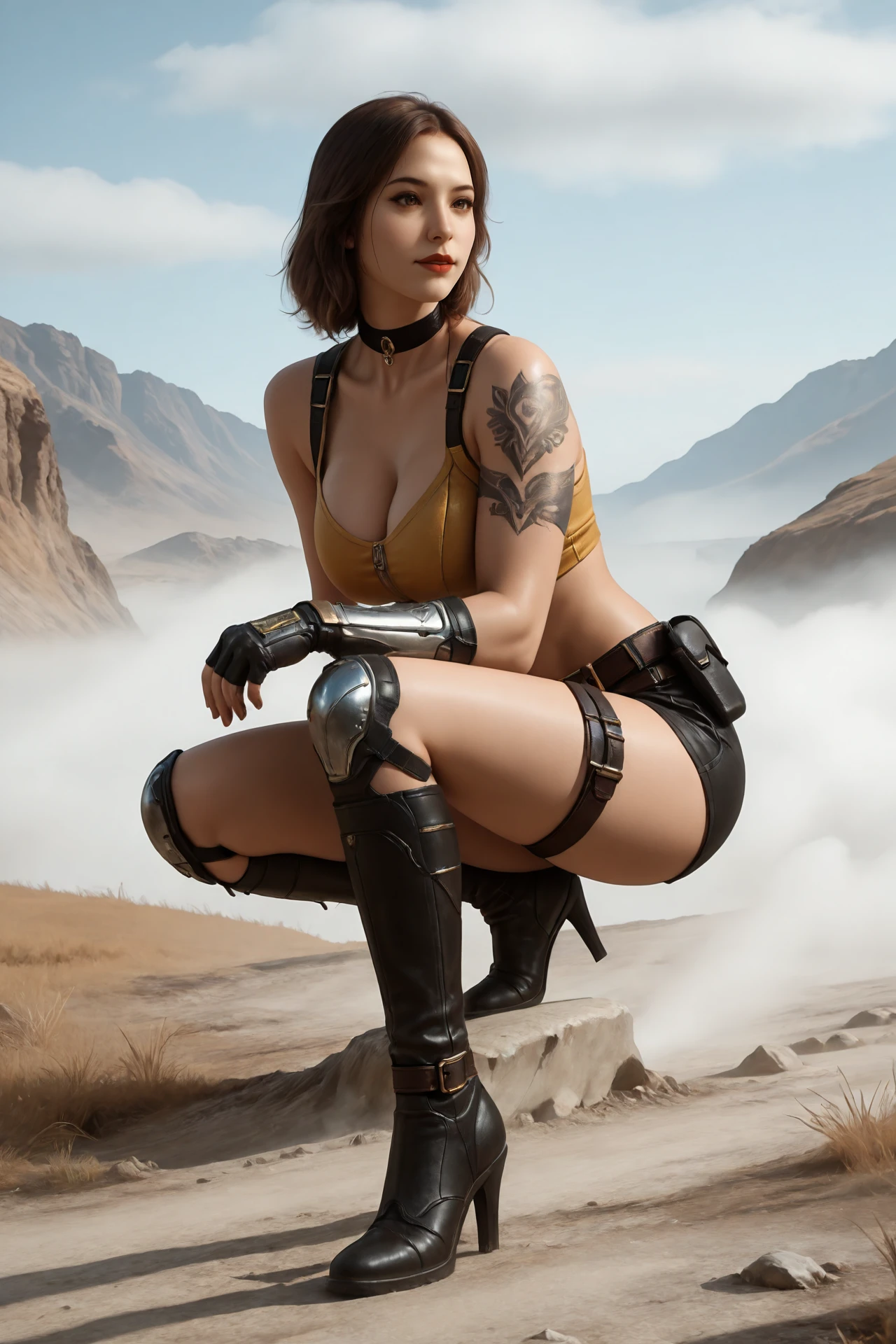 large_breasts,cleavage,midriff,tattoo,choker, crop_top,fingerless_gloves,gauntlets,belt,short_shorts,holster,thigh_belt, knee_boots,high_heels,knee_pads,