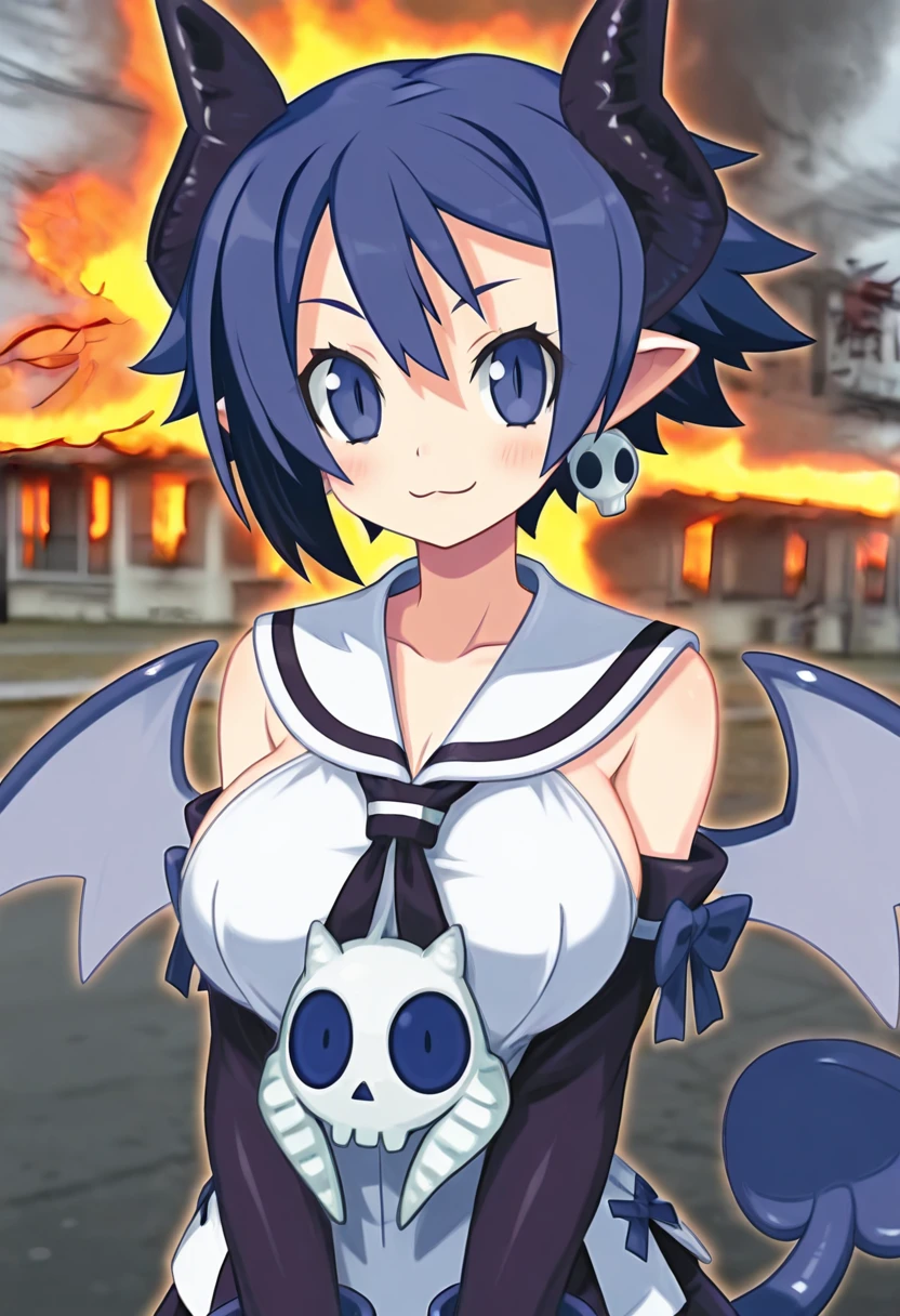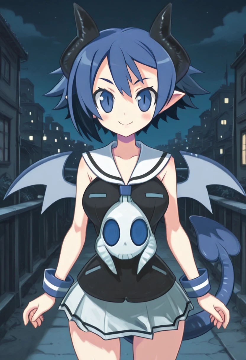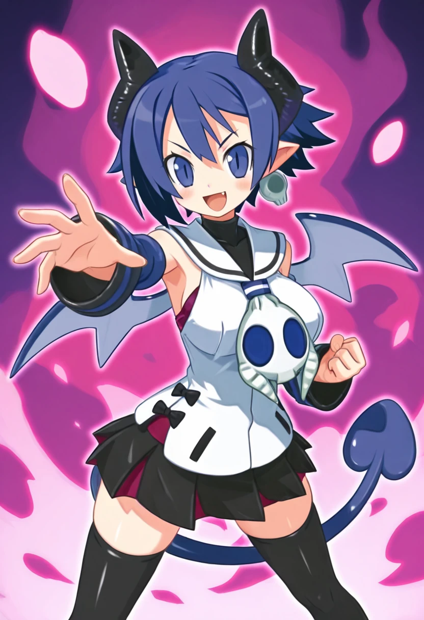 zzBlueberyl, blue eyes, blue hair, short hair, black horns, pointy ears, demon girl, white sailor collar, school uniform, skirt, demon wings, skull, tail,