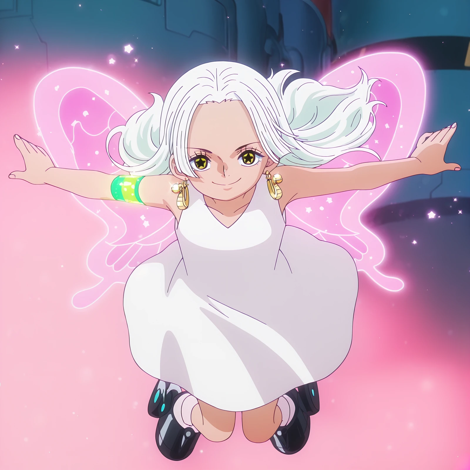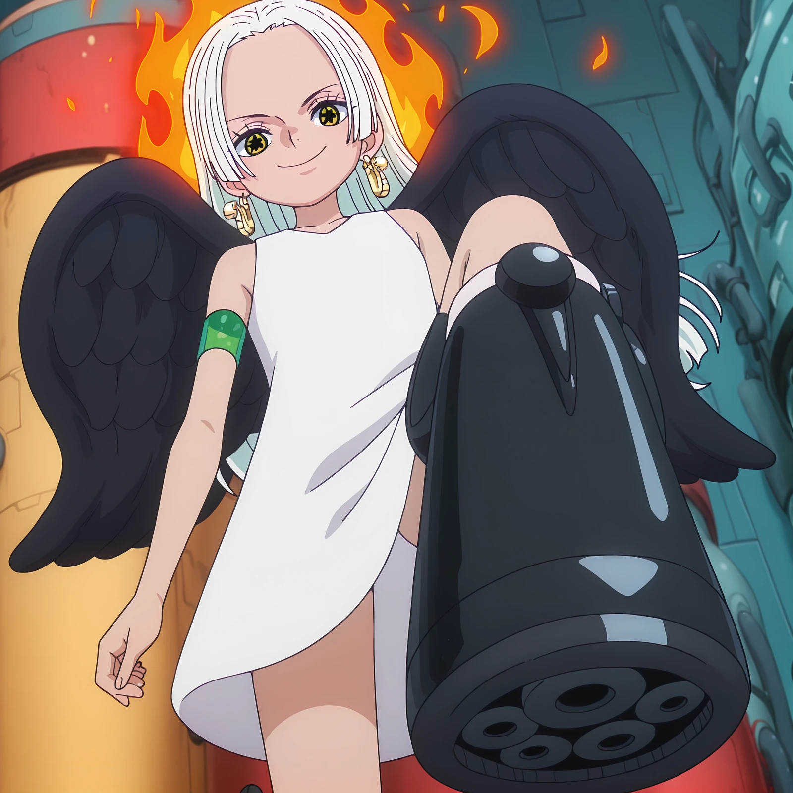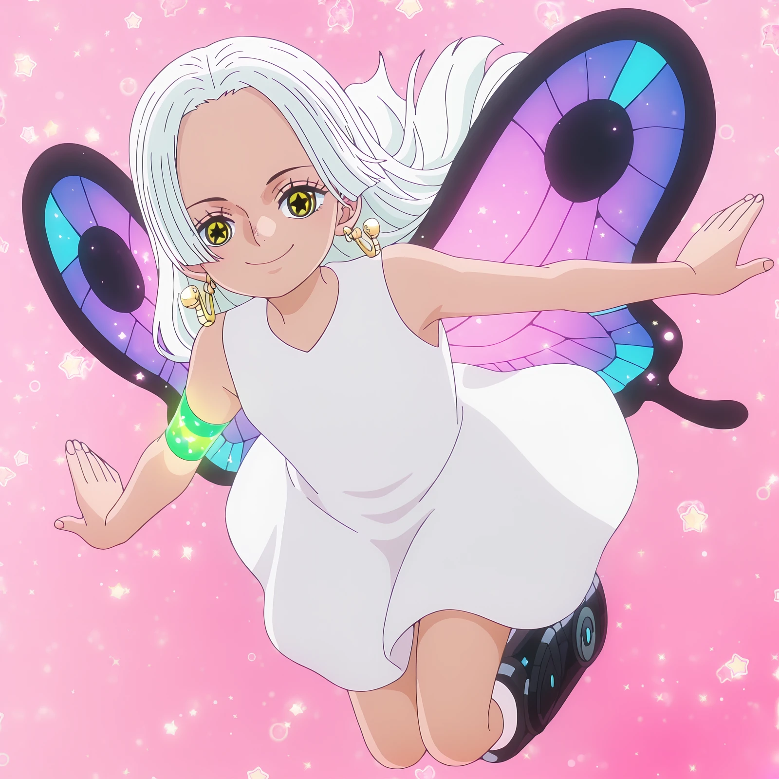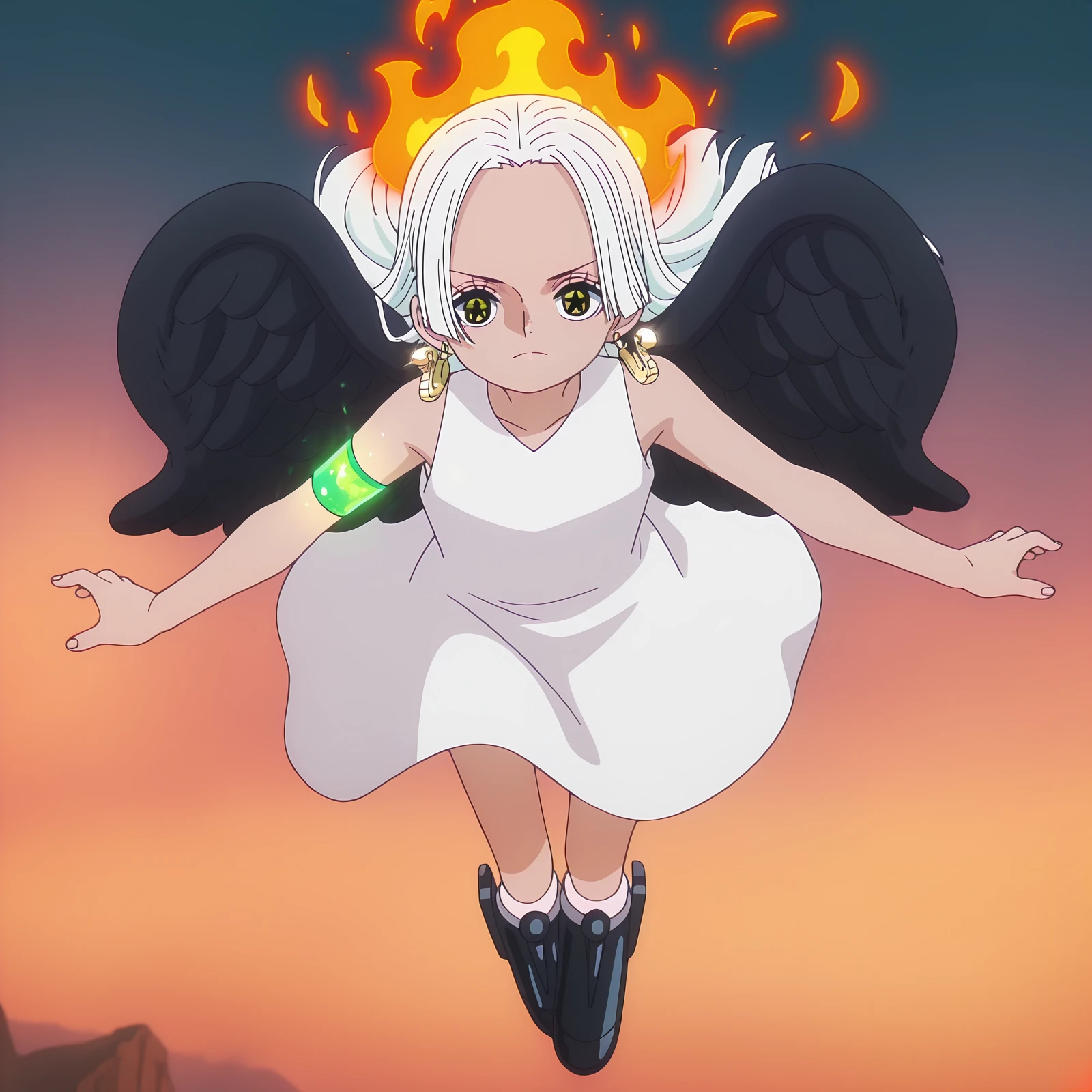 2. For Medium/Full Body: s-snake, star-shaped_pupils, white_hair, long_hair, glowing_green_arm_panel, white_dress, sleeveless_dress, black_wings, fire_on_back, egghead_boots, 1girl, solo
