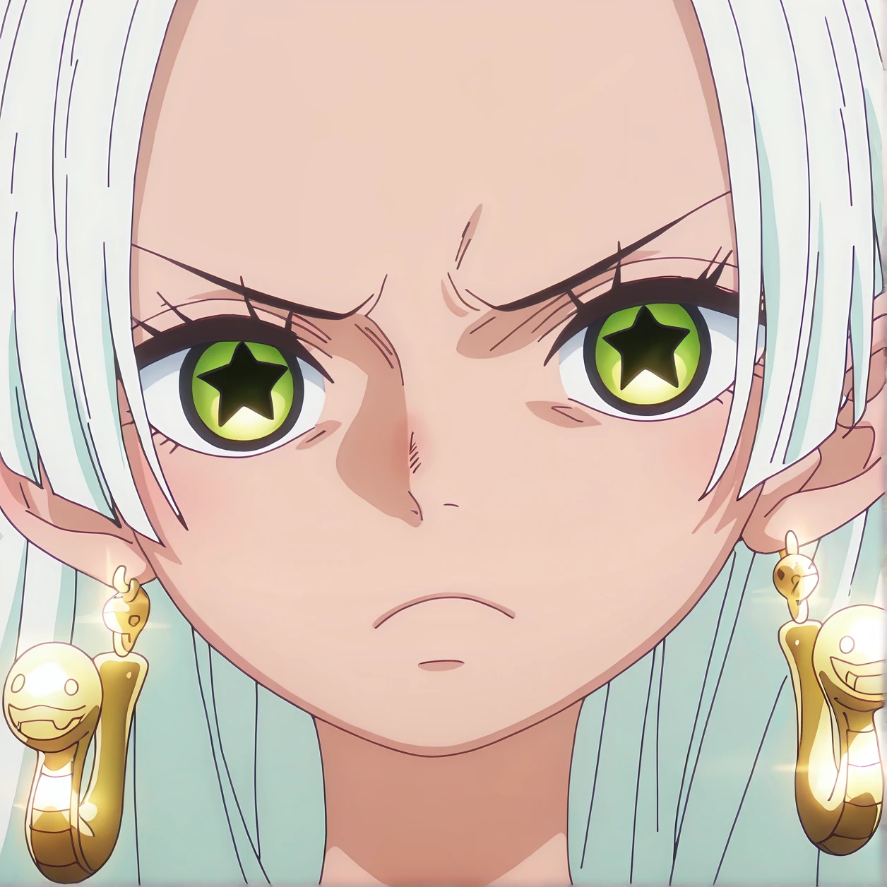 1. For Closeups (Perfect Focus): s-snake, star-shaped_pupils, gold_snake-shaped_earrings, headshot, face_focus, white_hair, long_hair