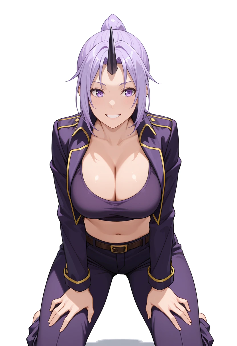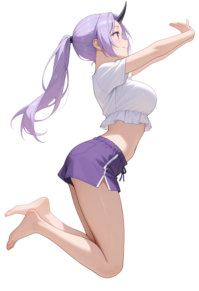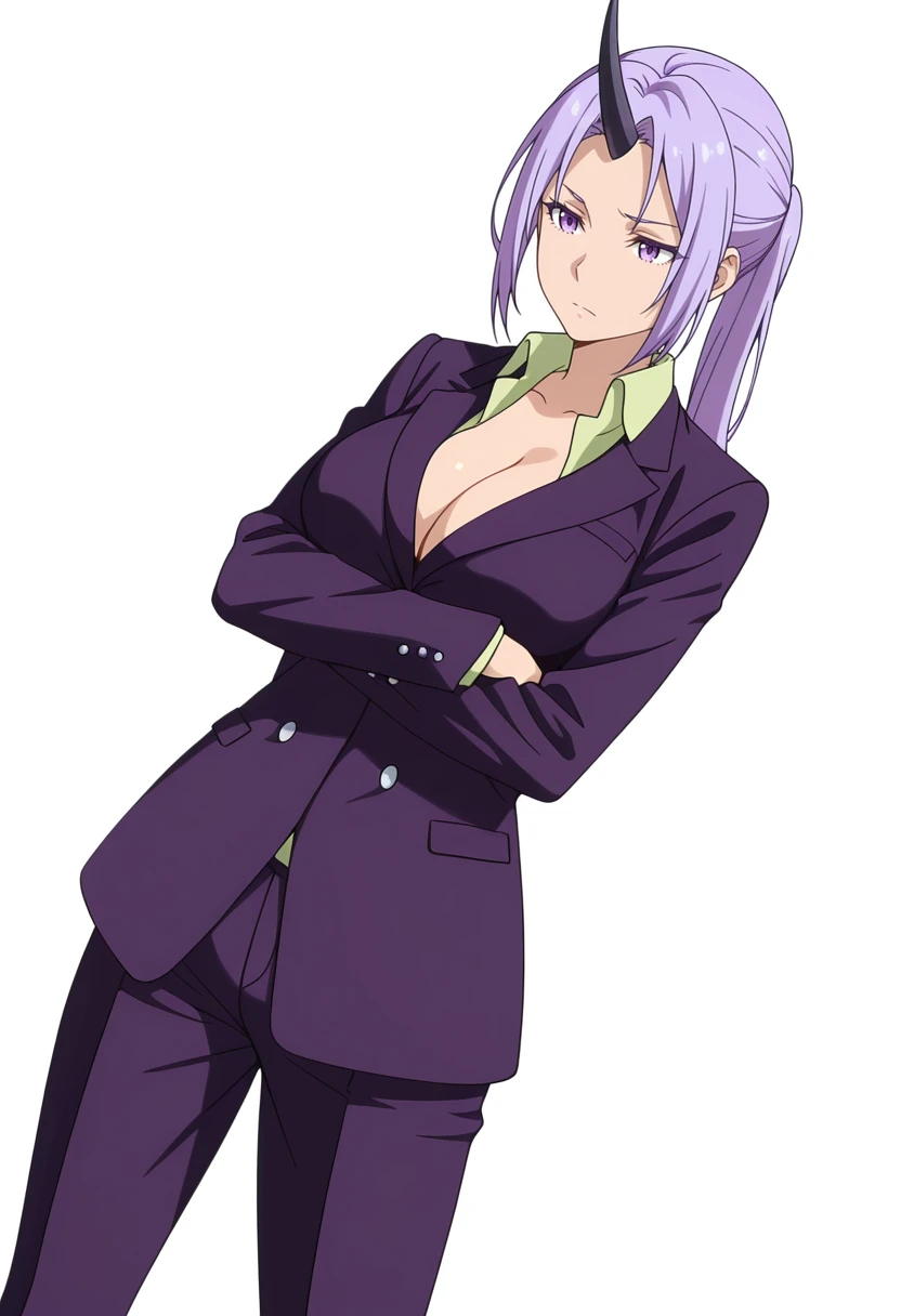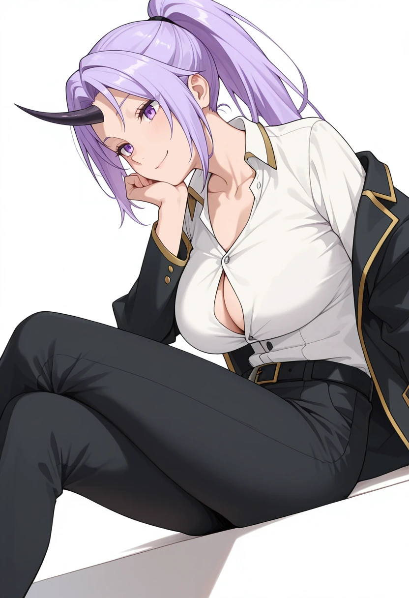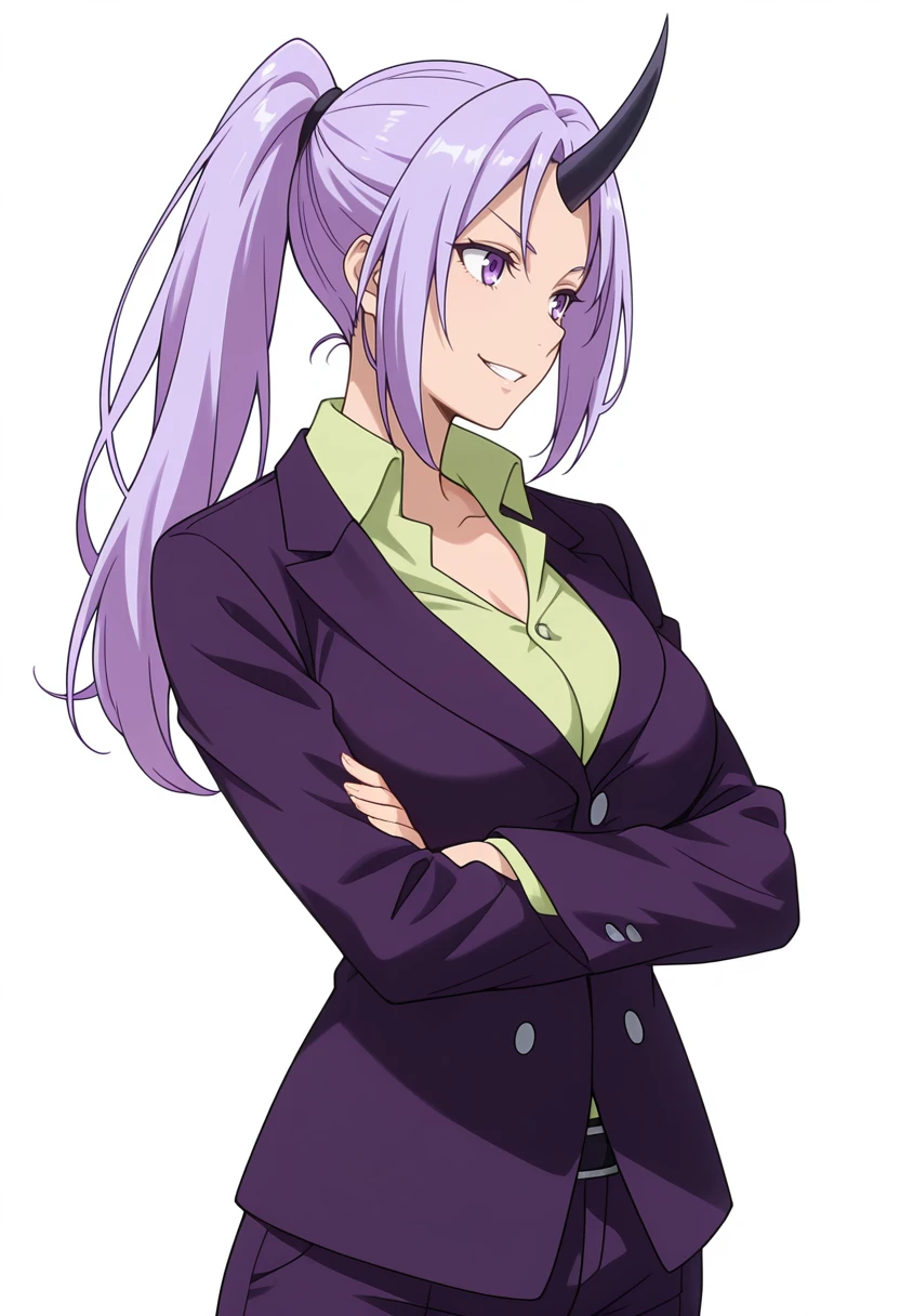shion_cnr, 1girl, purple hair, long hair, ponytail, large breasts, single horn, Default outfit
