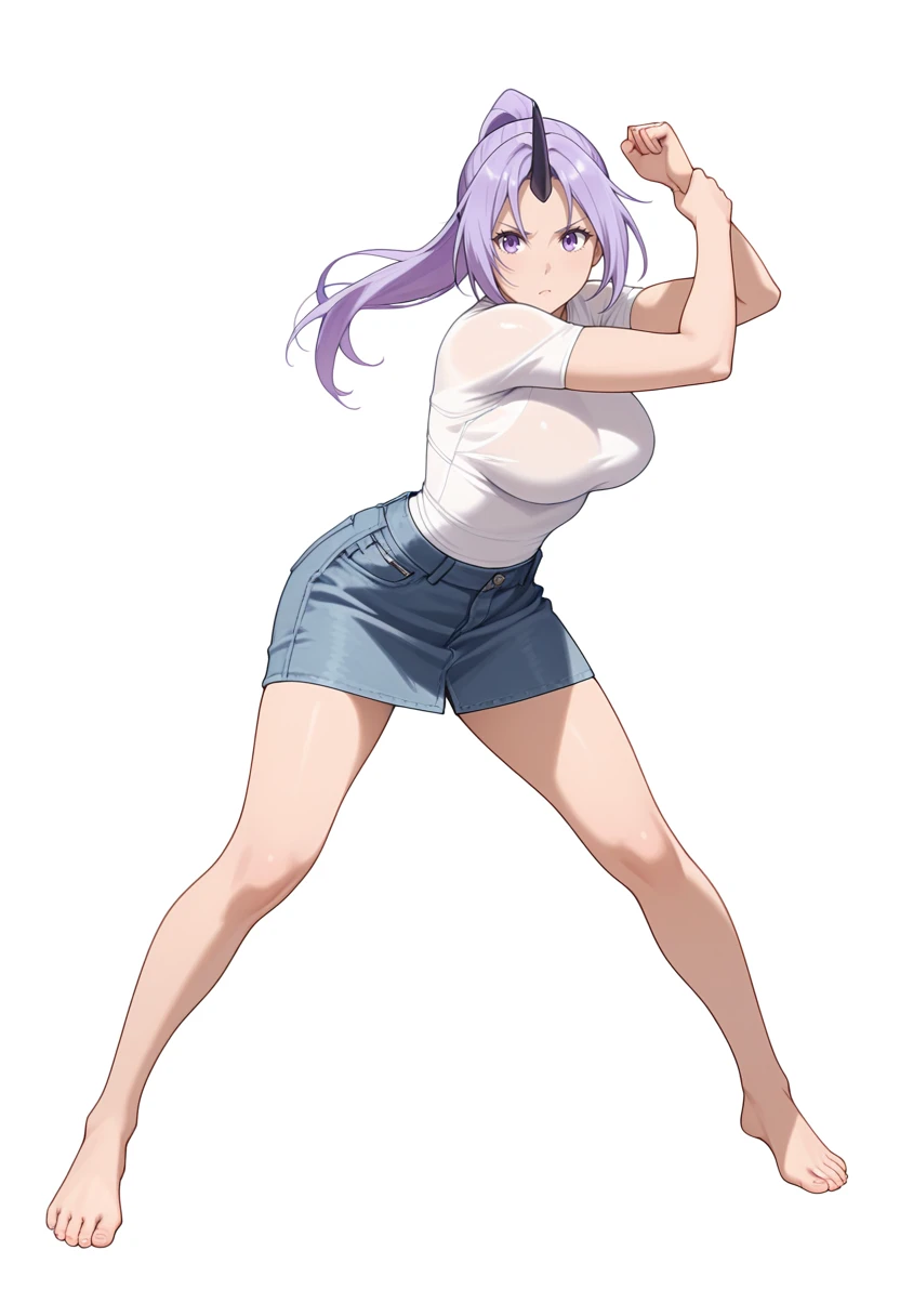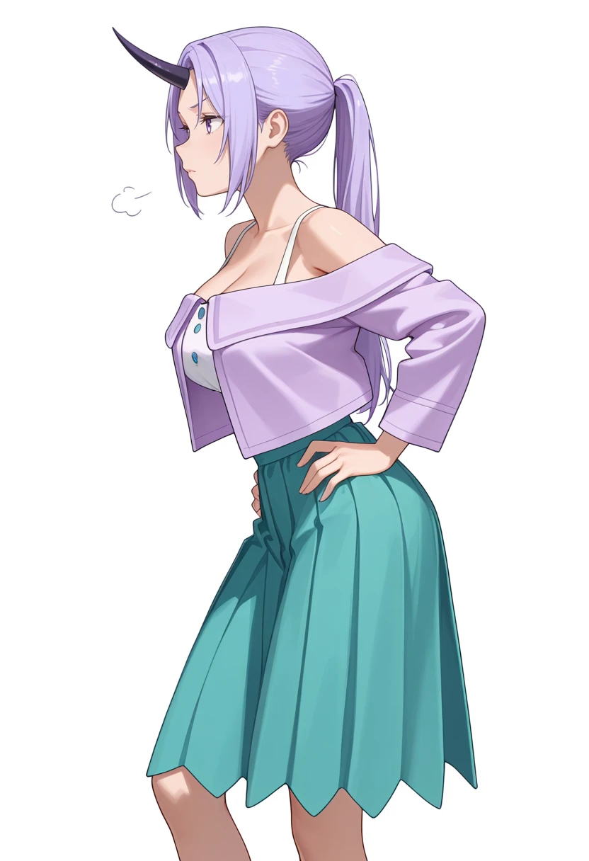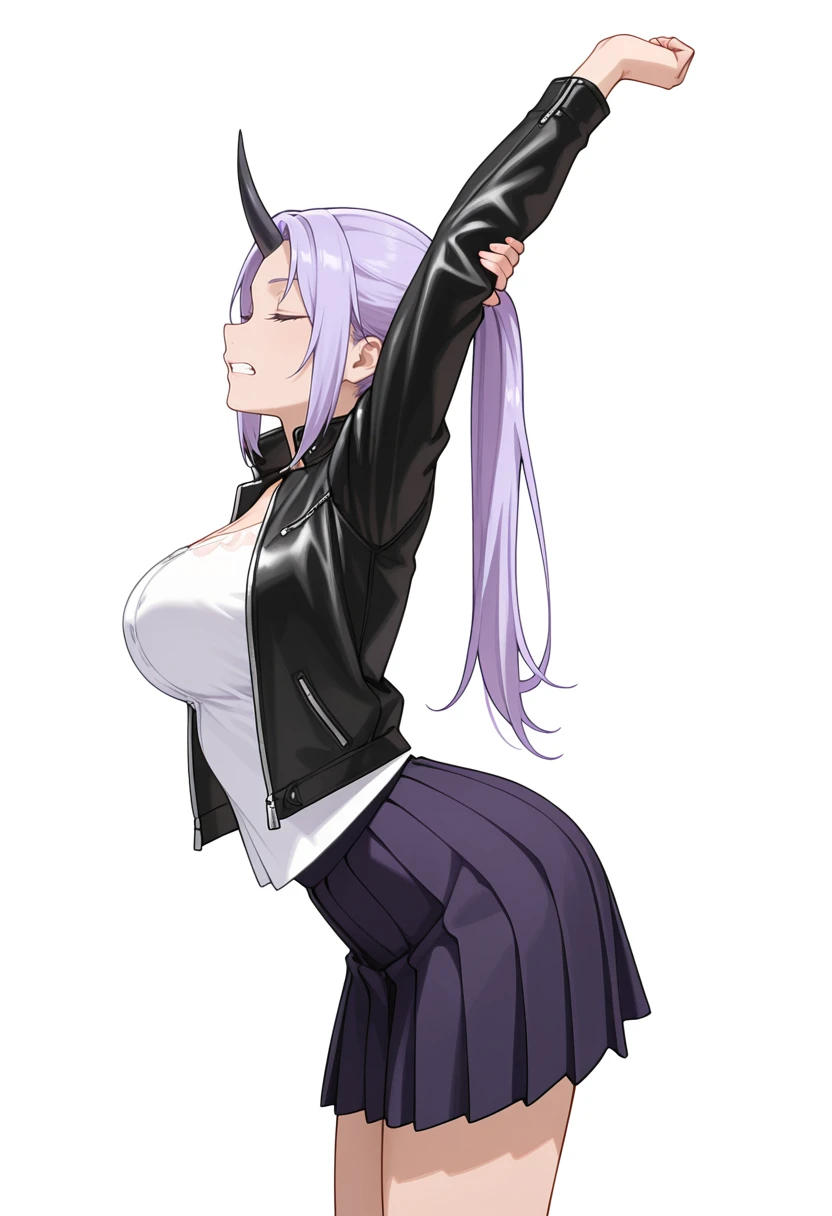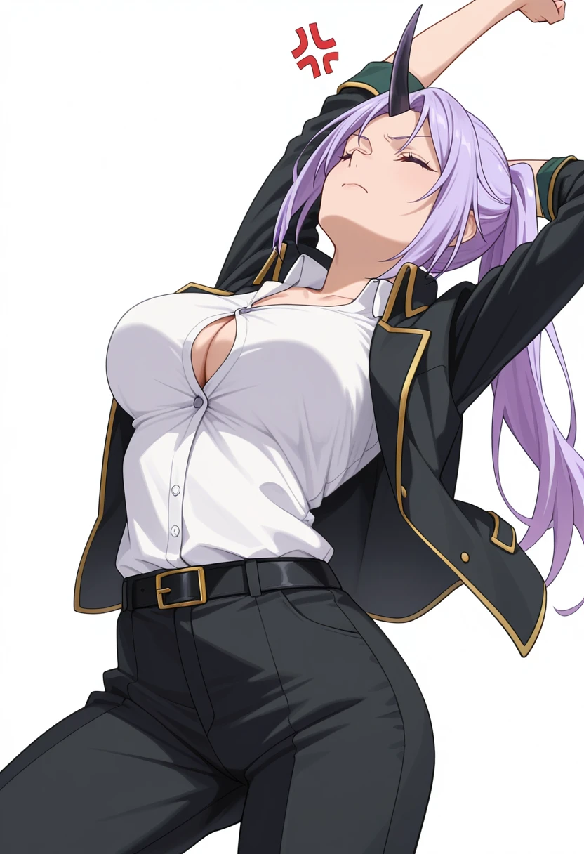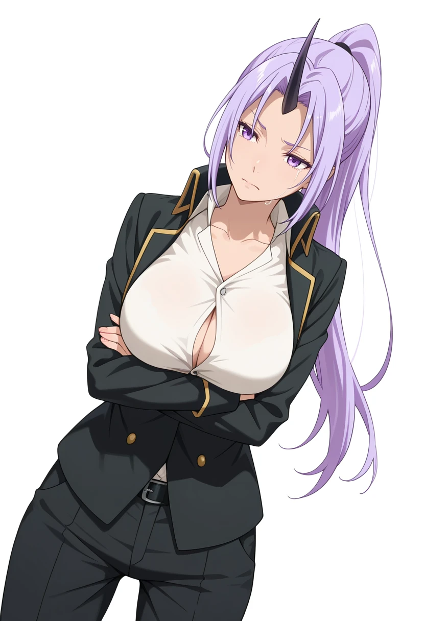 shion_cnr, 1girl, purple hair, long hair, ponytail, large breasts, single horn, Default outfit