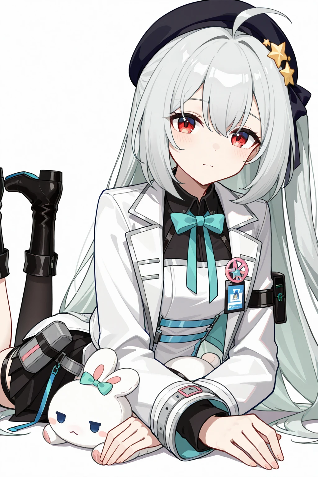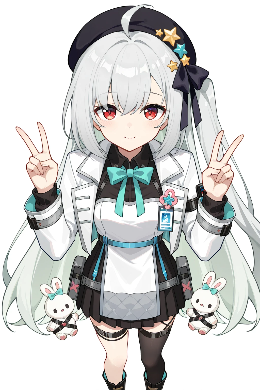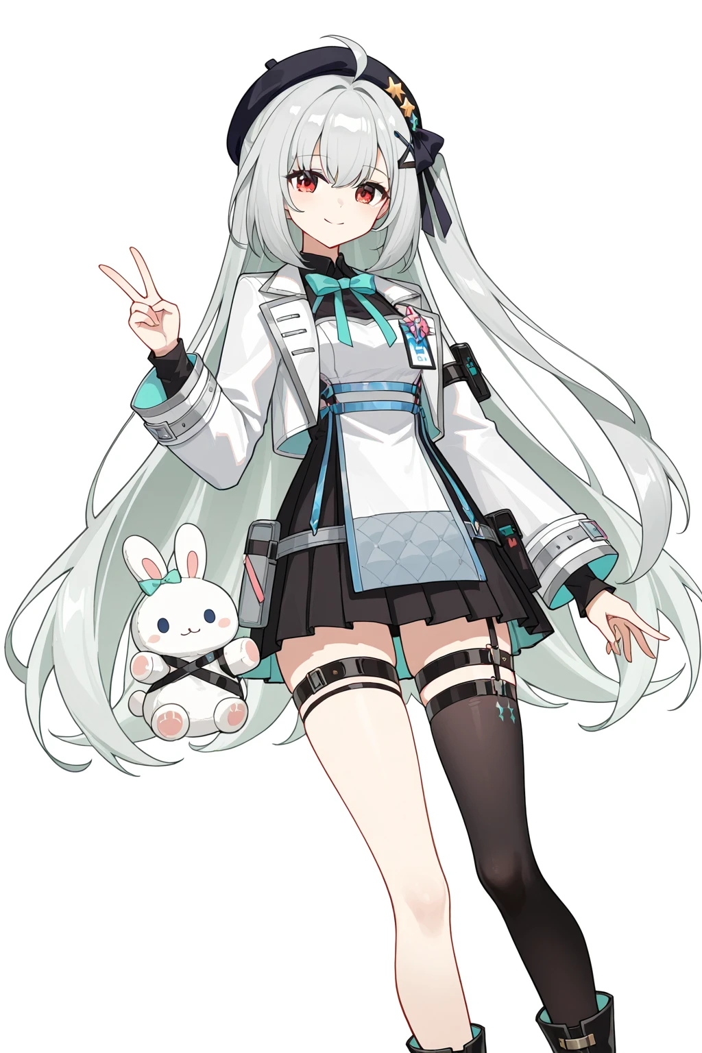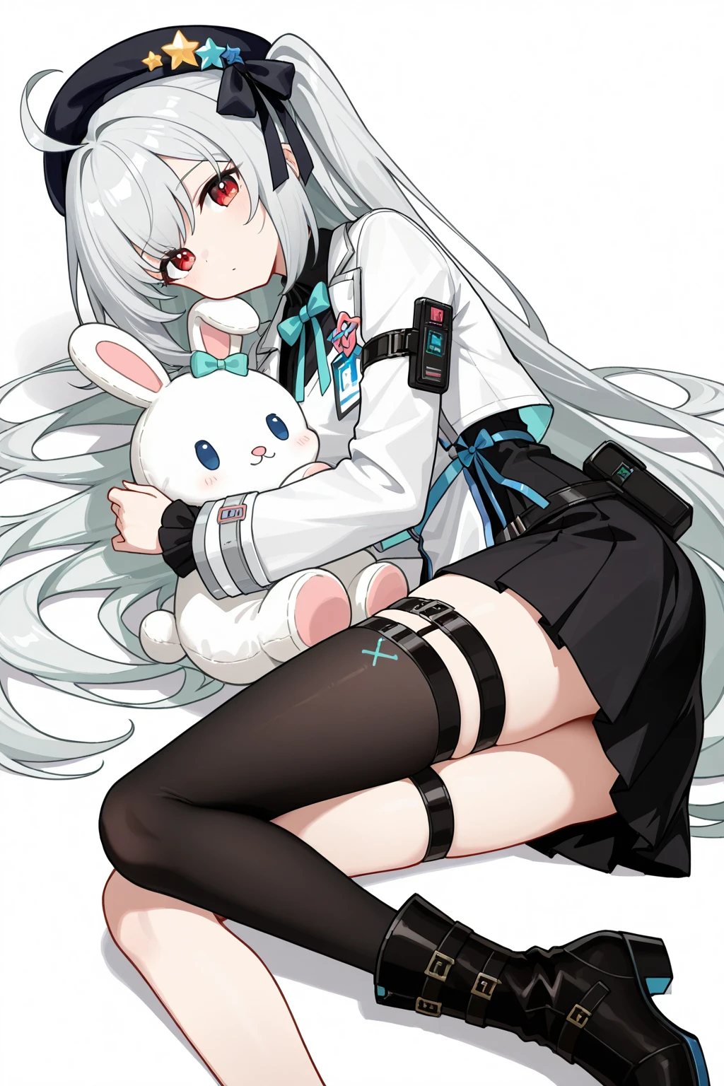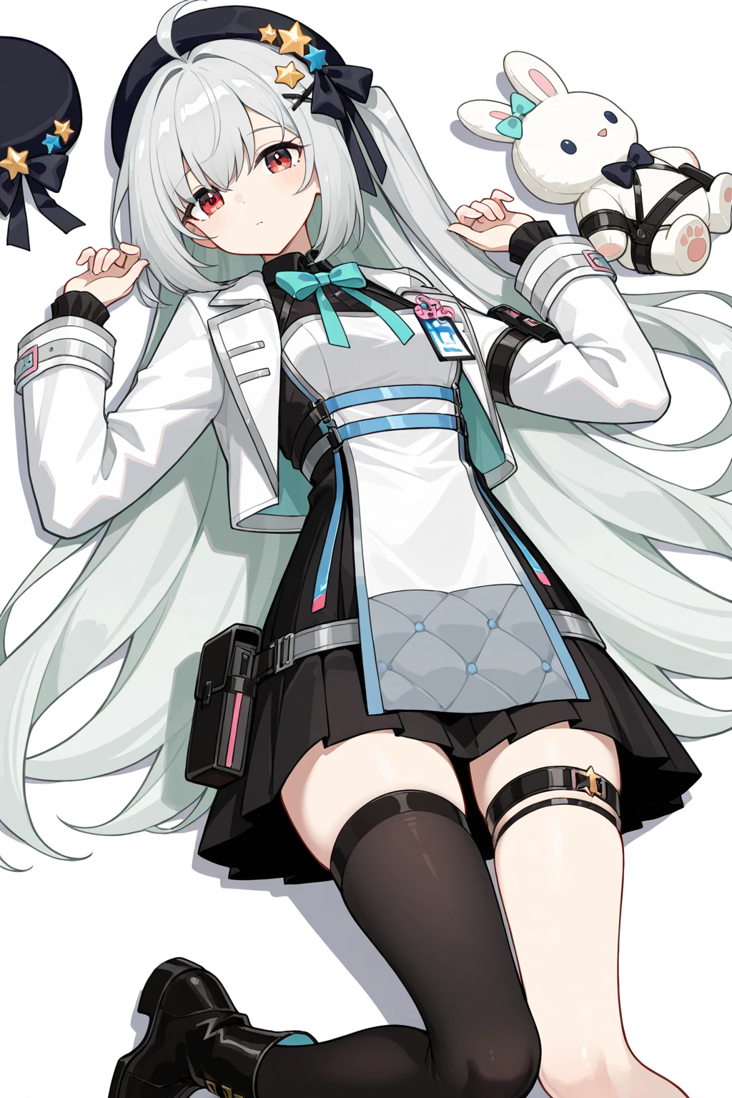kalujiang,ahoge,single thighhigh,long hair,boots,beret,red eyes,black thighhigh,bow,black hatbow,jacket,thigh strap, long sleeves,white jacket, bowtie,belt,green belt,green bow, one side up, grey hair,stuffed toy, dress,two-color dress,id card, waist pack, arm bag,white dress,star-shaped hat decoration,black shirt,black skirt,dress decoration,