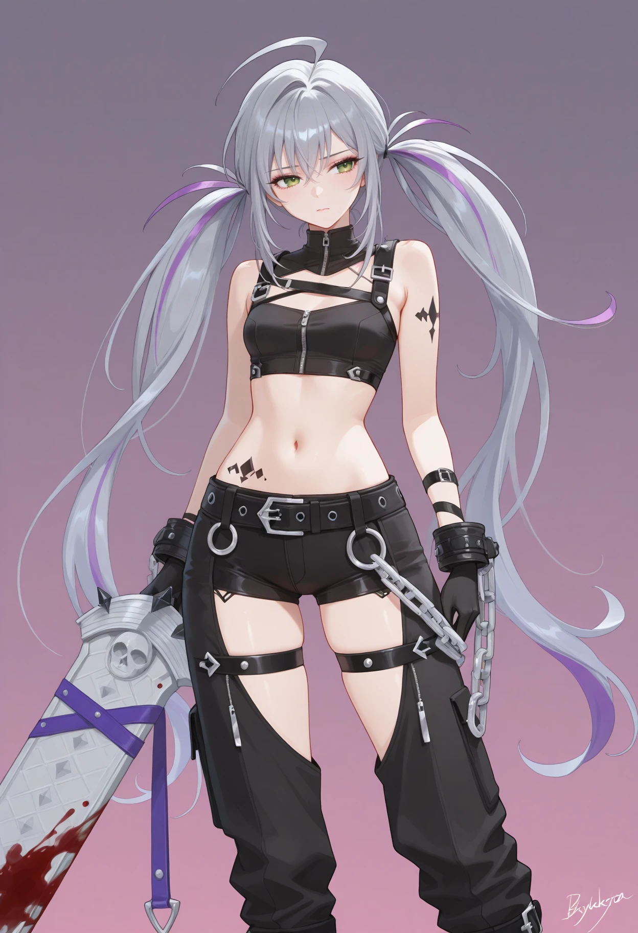 角色触发词:GRT/BS,1girl,long hair,red eyes,hair between eyes,jewelry,ahoge,grey hair,blood,,navel, shoulders,very long hair,small ,boots,shorts,sleeveless,midriff,belt,pants,crop top,black shirt,tattoo,chain,black shorts,black pants,spikes,bangs,gloves,twintails,black gloves,black footwear,thigh strap,cuffs,pants,