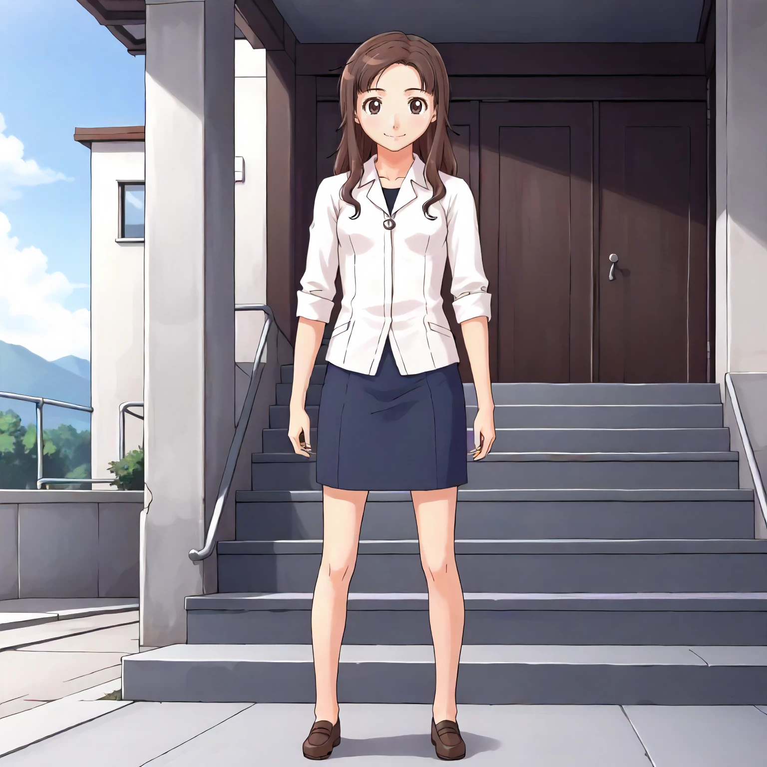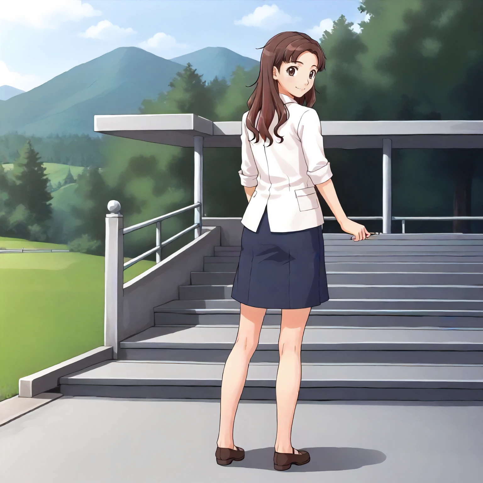white jacket,sleeves rolled up, blue skirt,pencil_skirt,