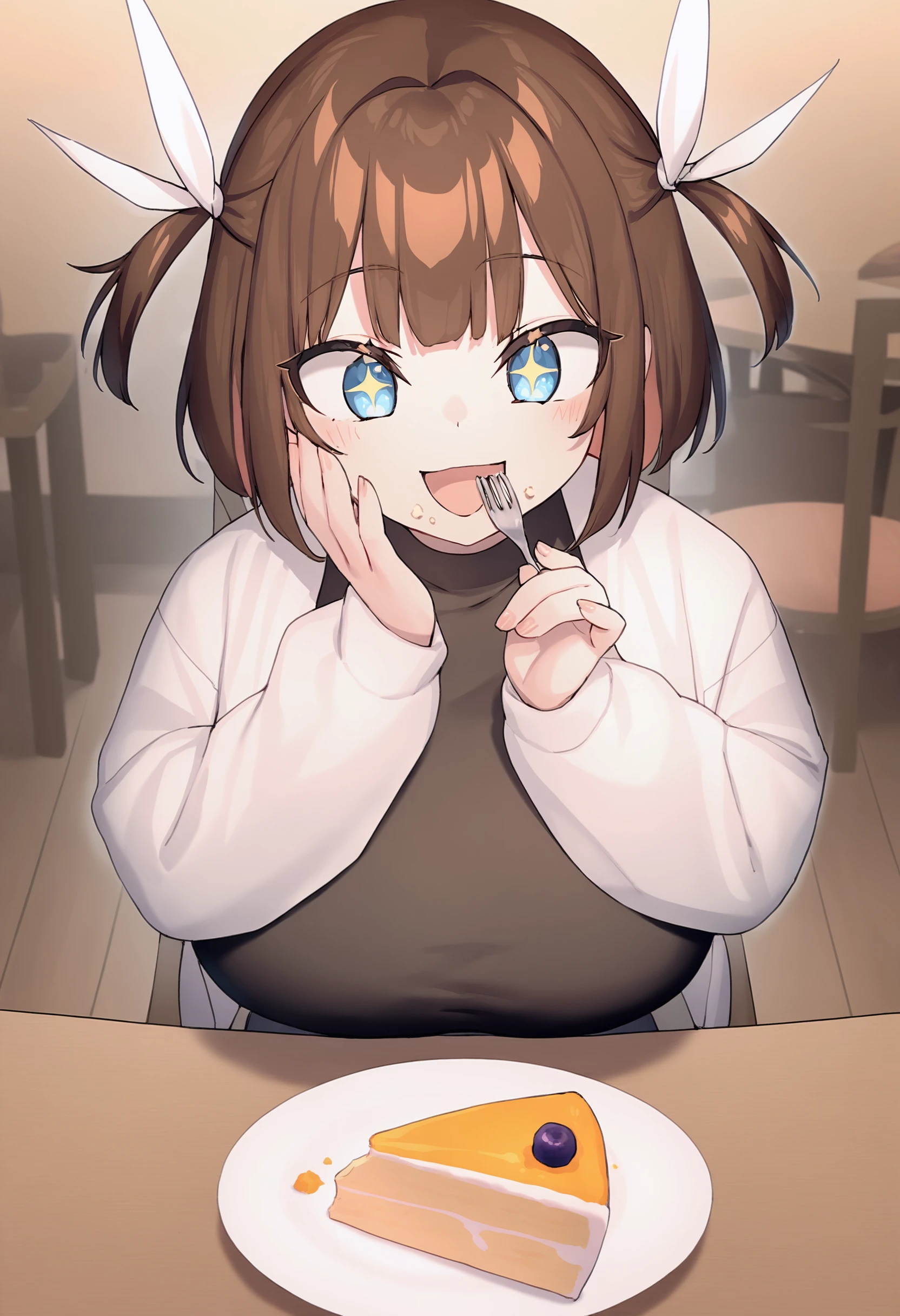 brown hair, blue eyes, two side up, short twintails, white ribbon, hair ribbon, blue collar, belt collar, leash