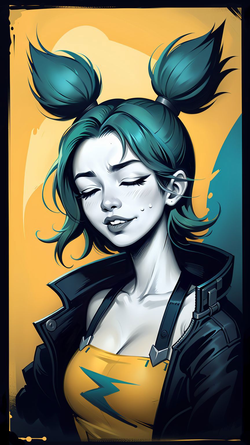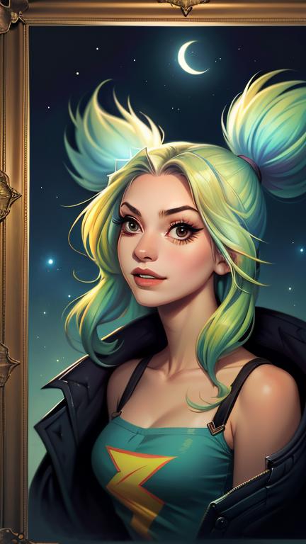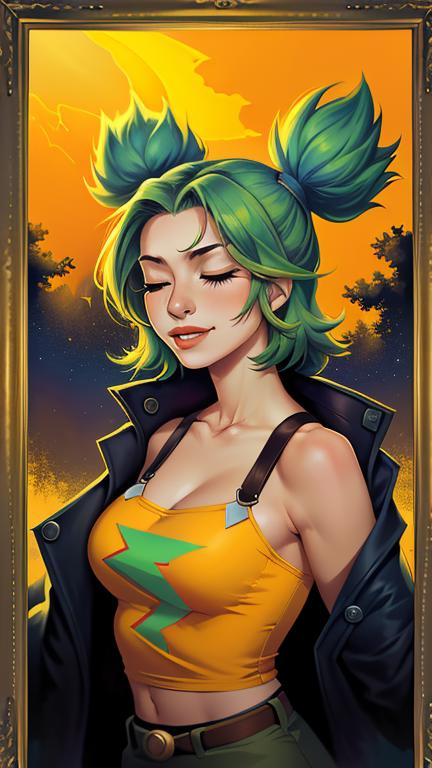 zeri, green twintails, tank top, jacket,elbow gloves,pants