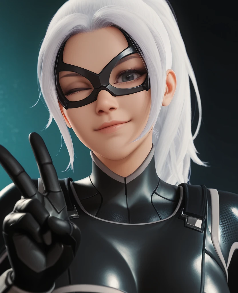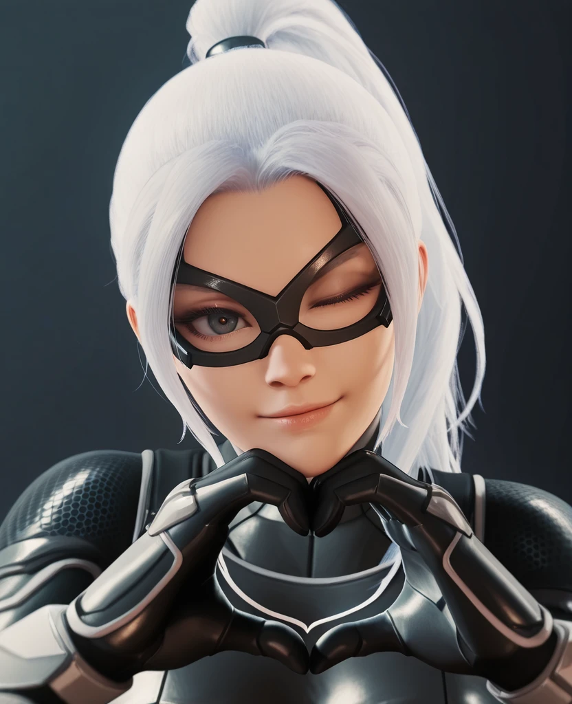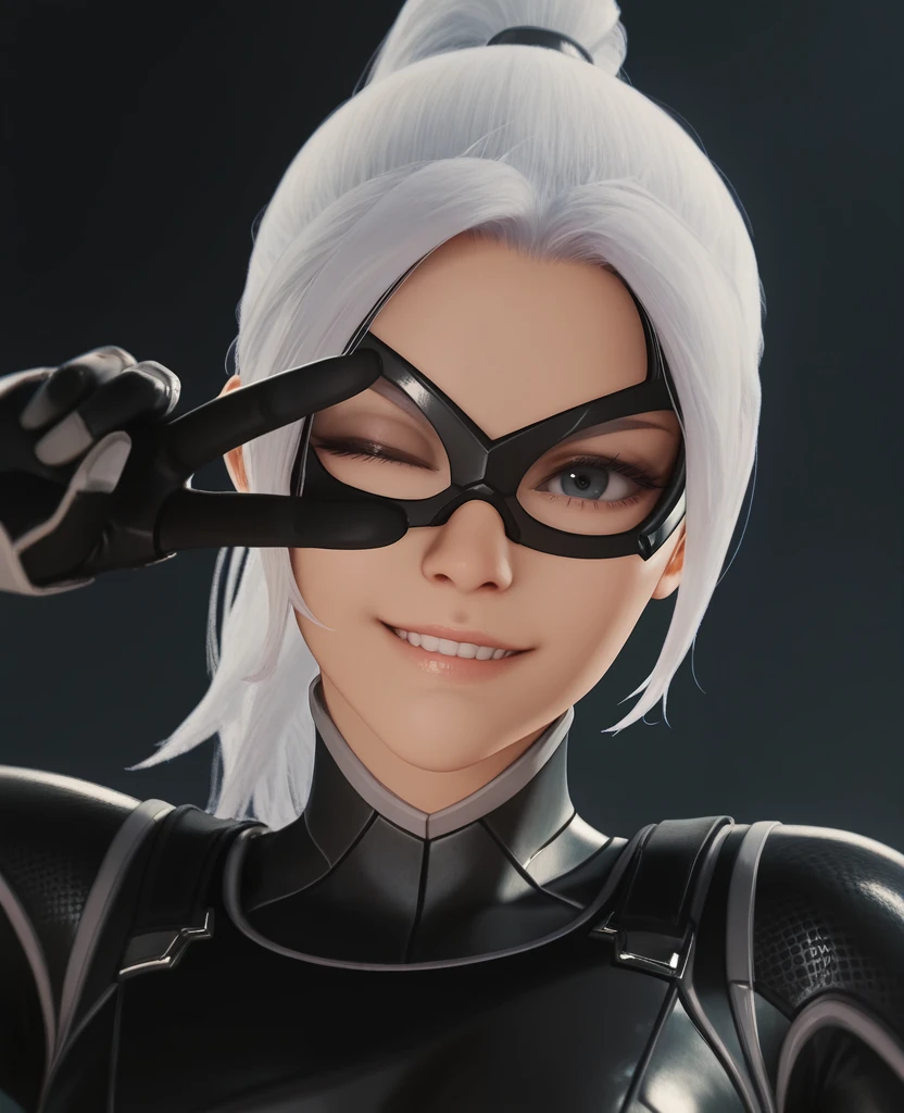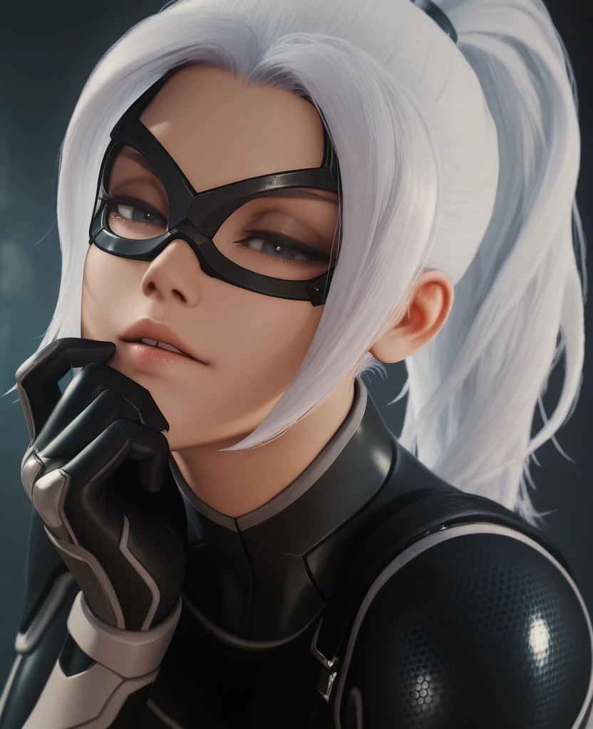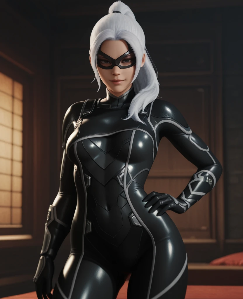 blackcat, 1girl, domino mask, white hair, ponytail, long hair, bodysuit,