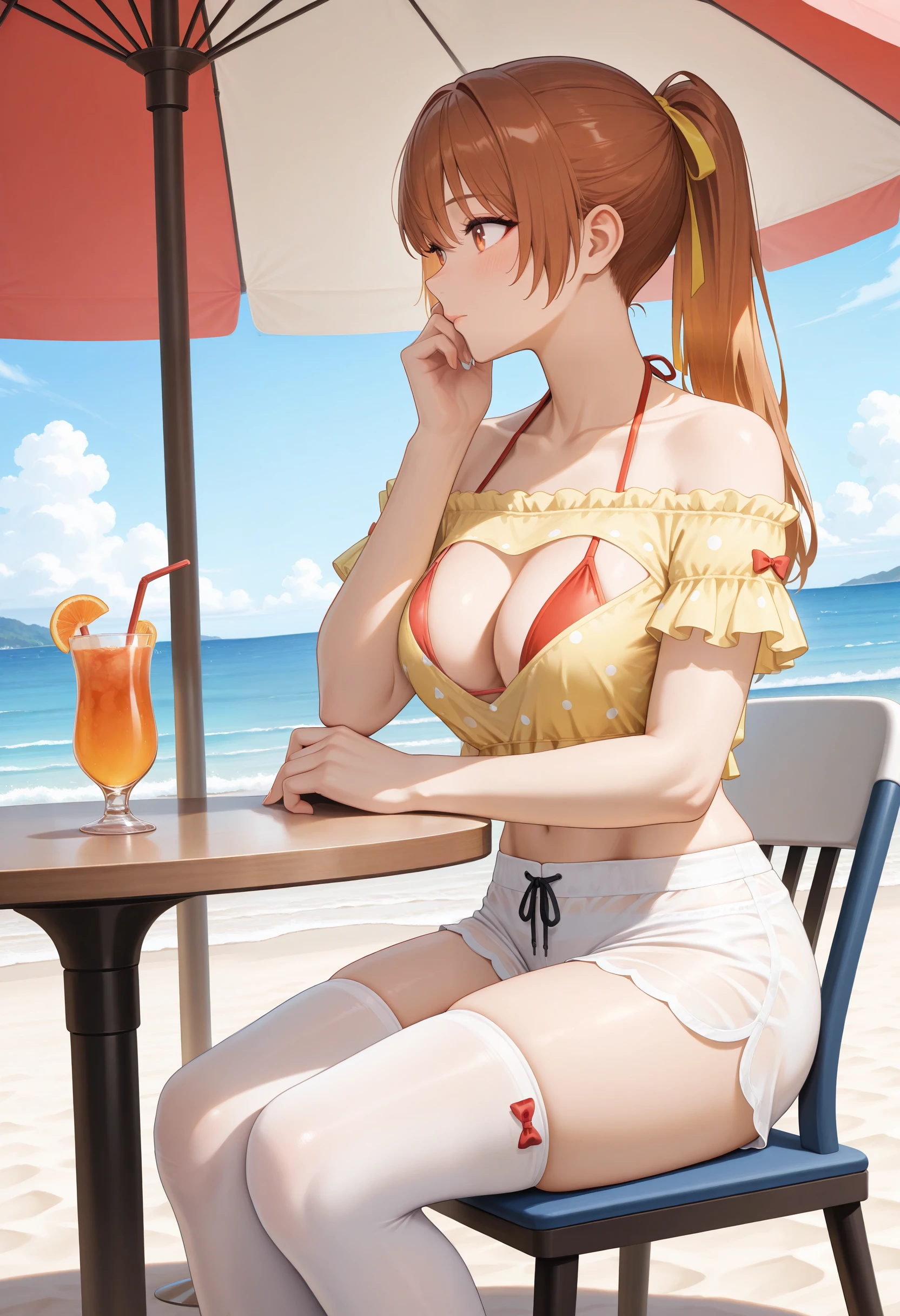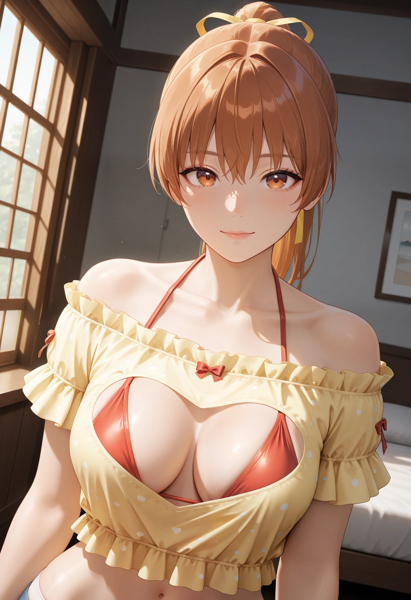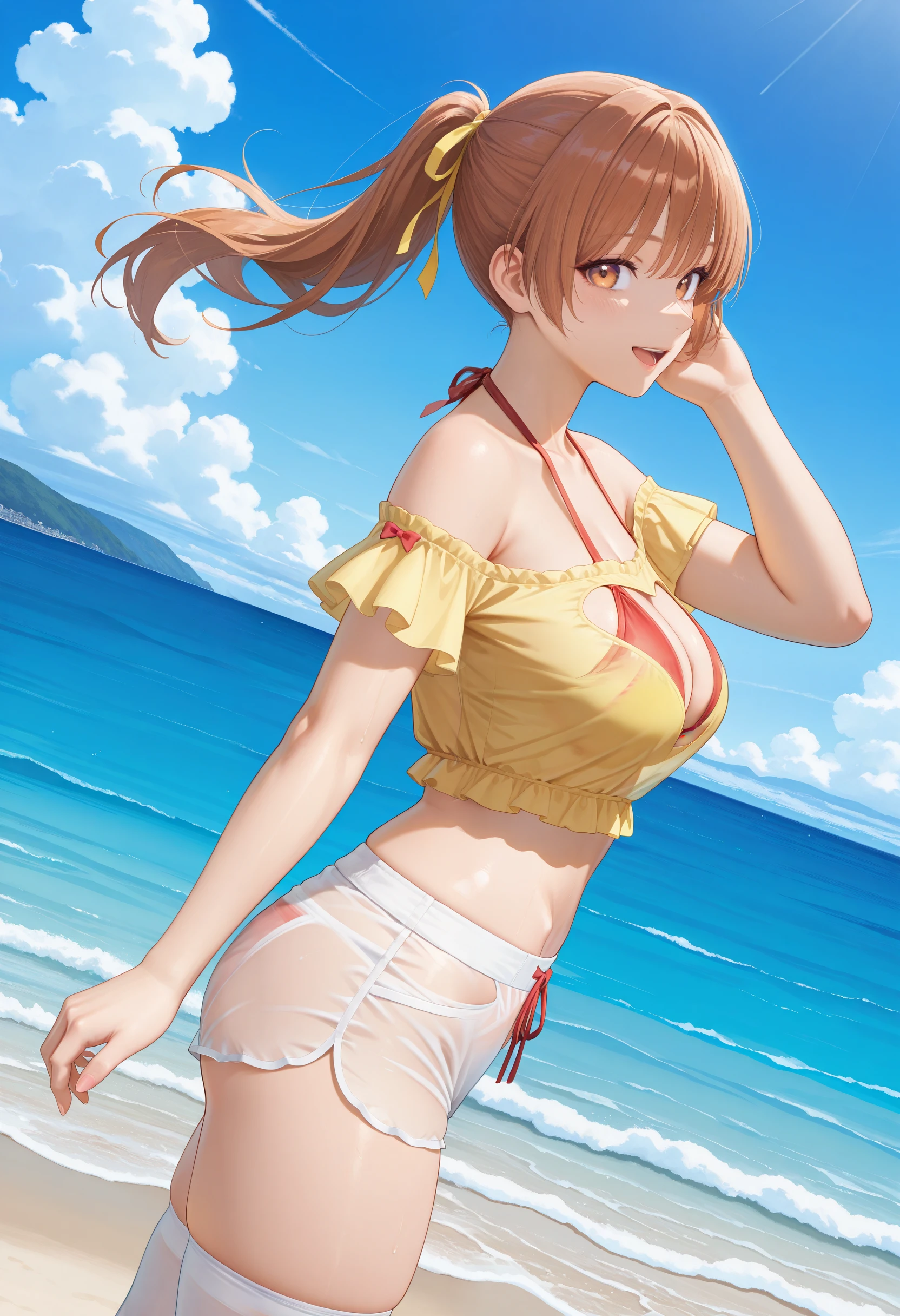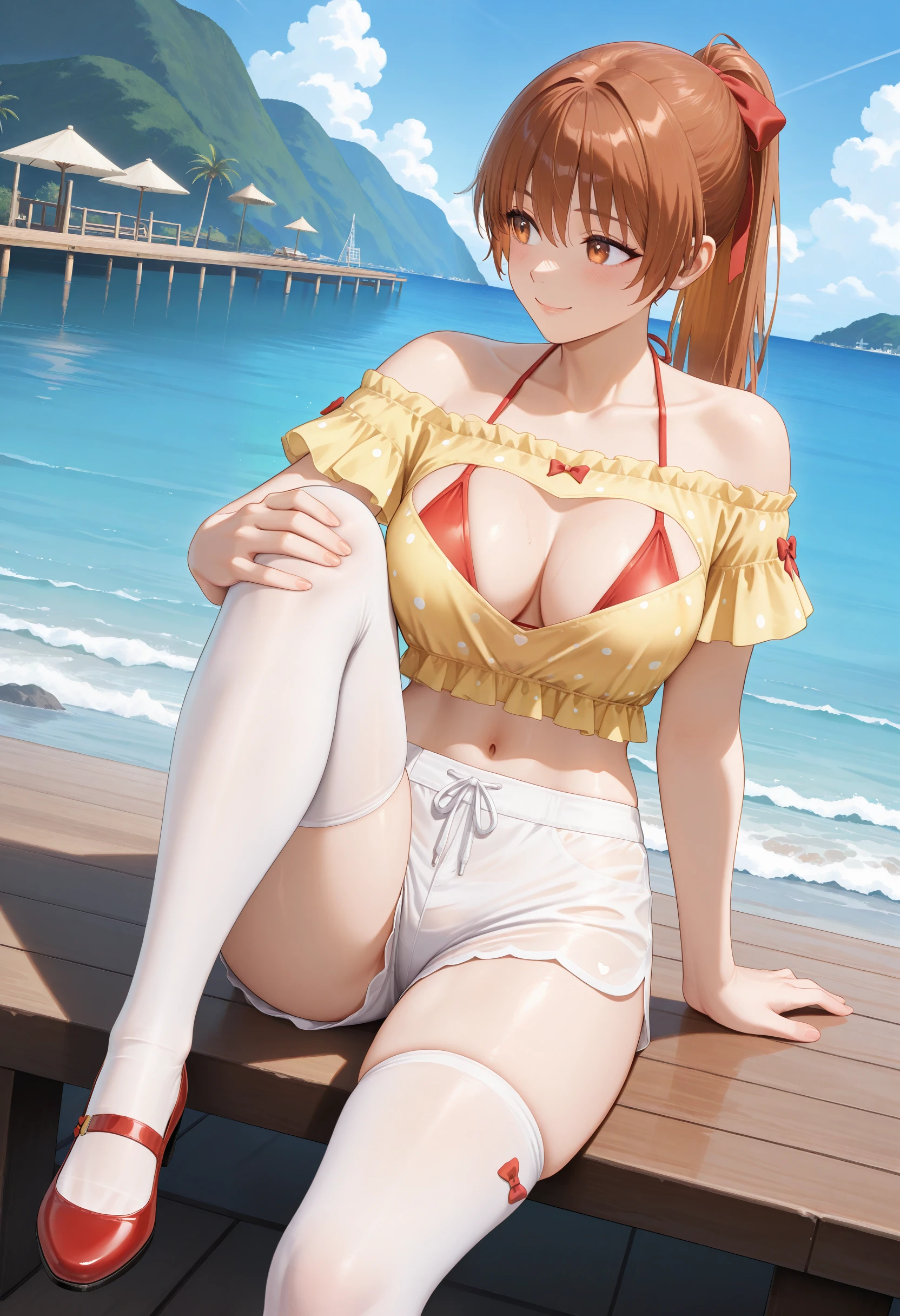 基本プロンプト:"OpenYourHeart_doaxvv,yellow shirt,short sleeves,frills,off-shoulder shirt,shirt with heart cutout,halterneck bikini top,bikini under clothes,red bow,see-through shorts,underwear bikini,white shorts,white thighhighs,red shoes"