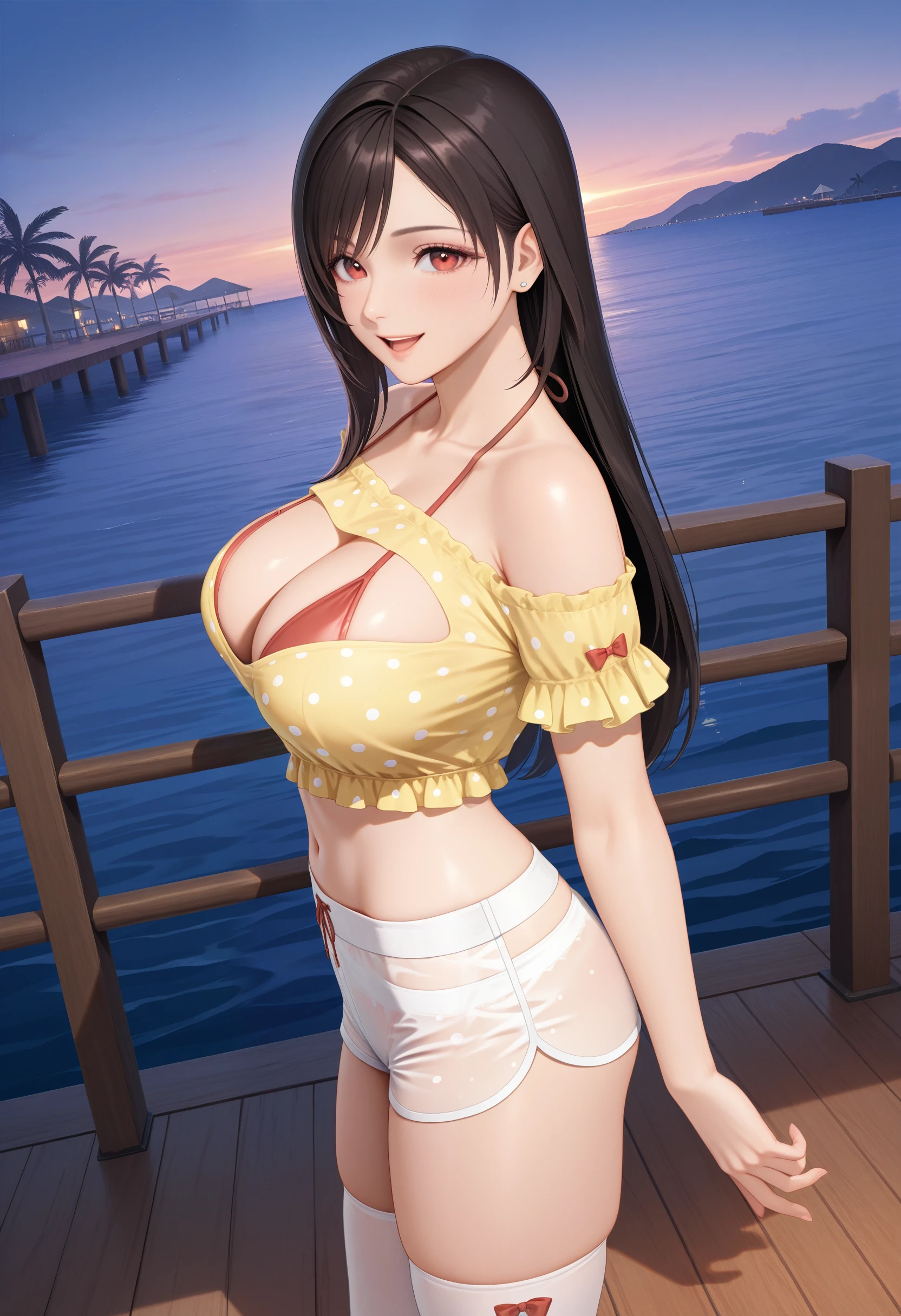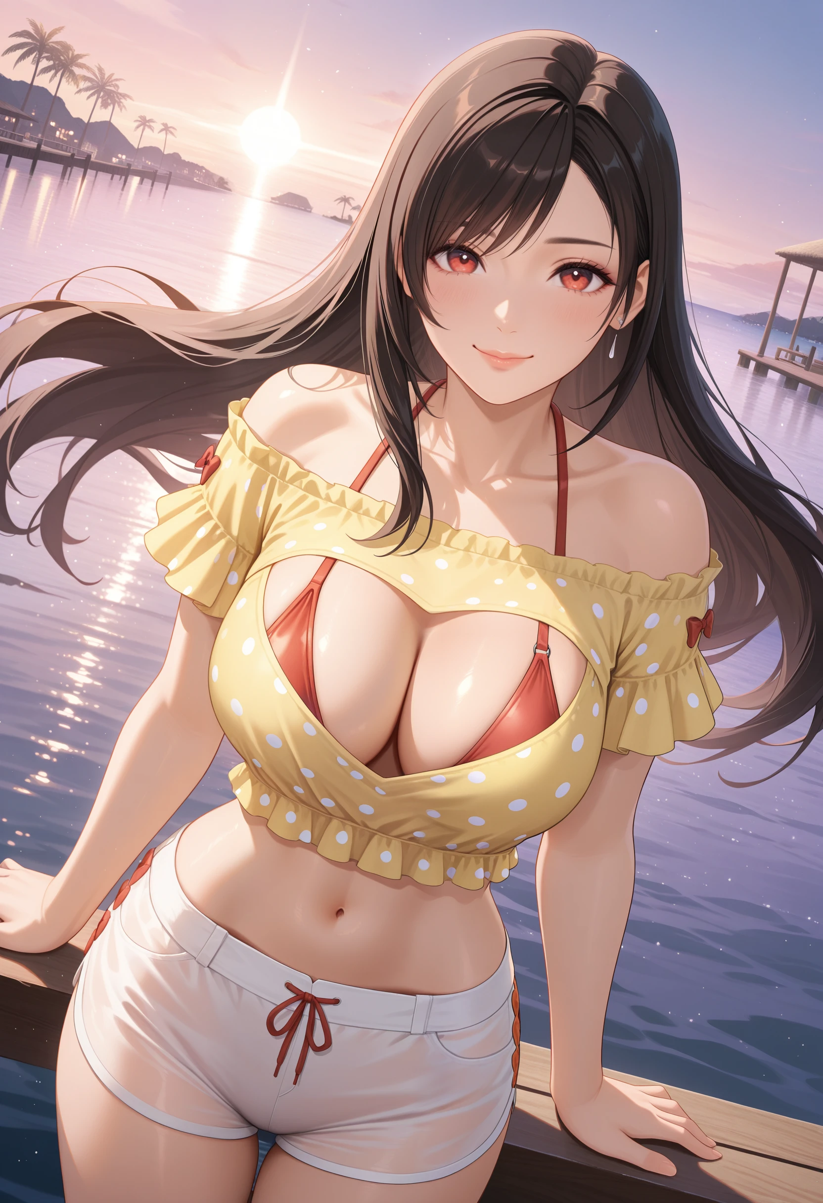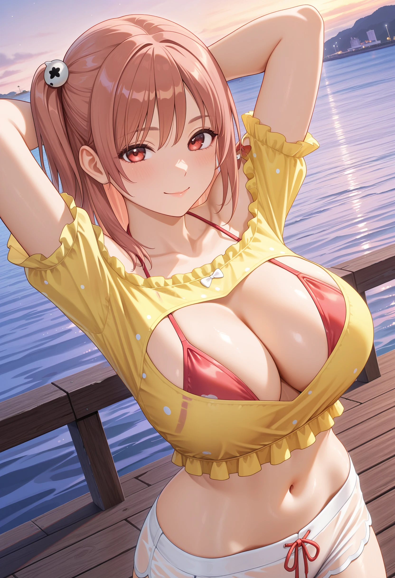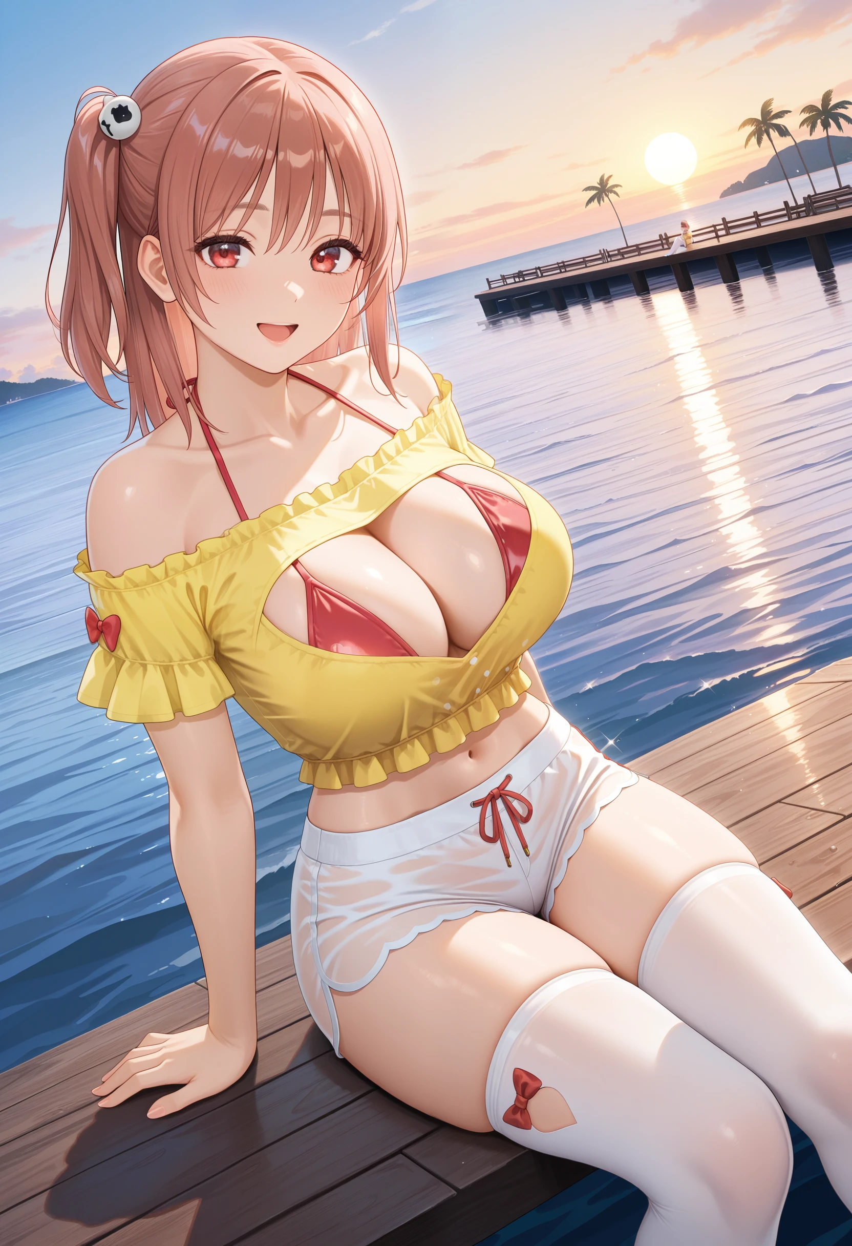 基本プロンプト:"OpenYourHeart_doaxvv,yellow shirt,short sleeves,frills,off-shoulder shirt,shirt with heart cutout,halterneck bikini top,bikini under clothes,red bow,see-through shorts,underwear bikini,white shorts,white thighhighs,red shoes"