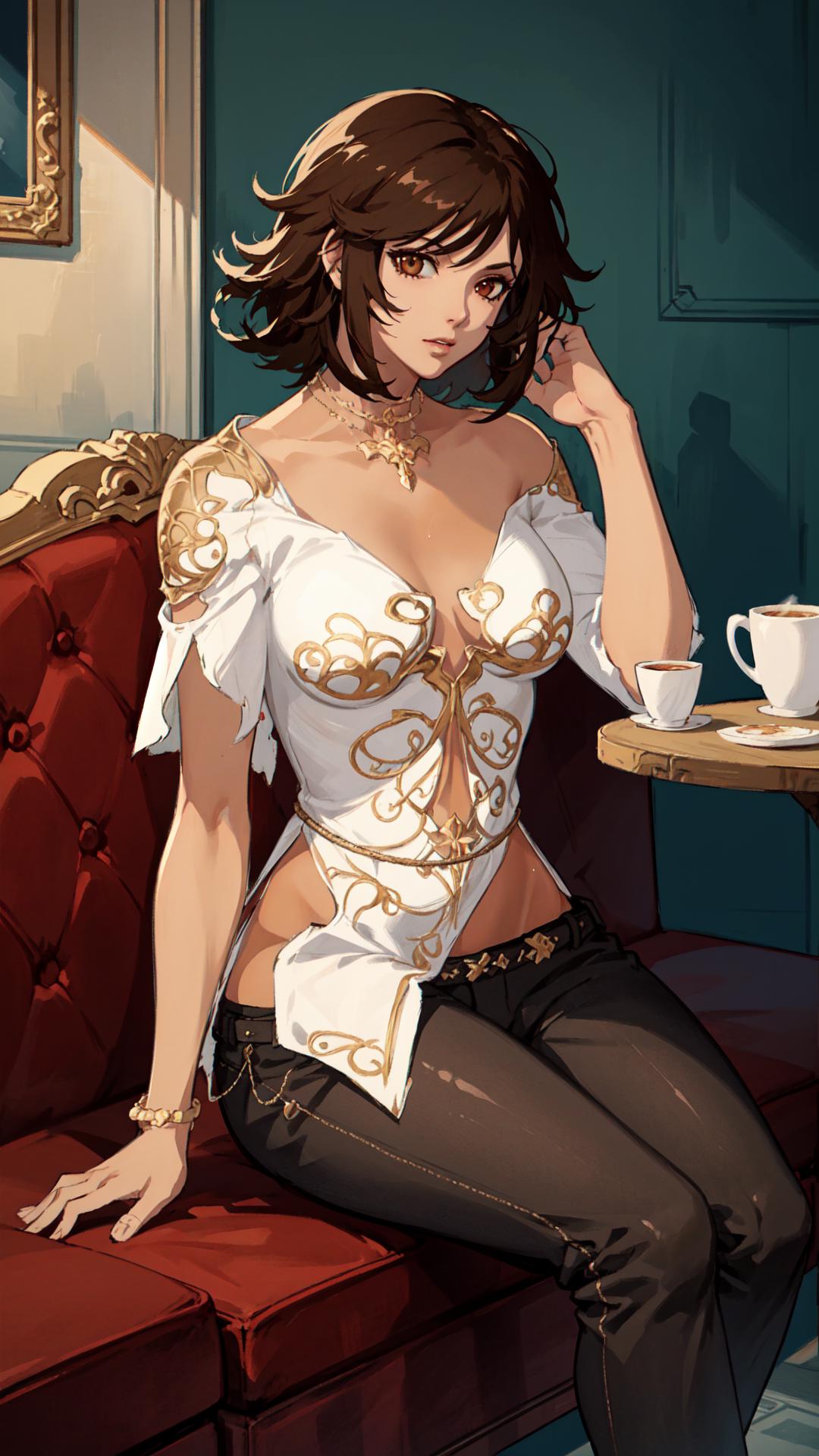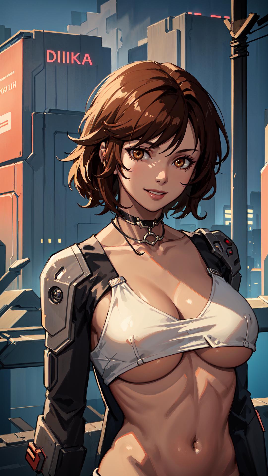 tanned skin, dark red short hair, hazel eyes