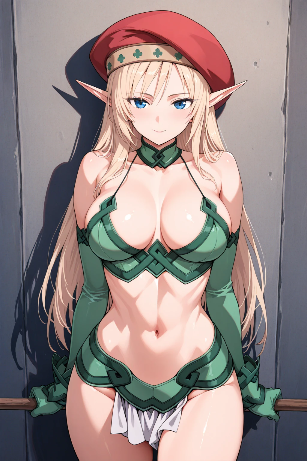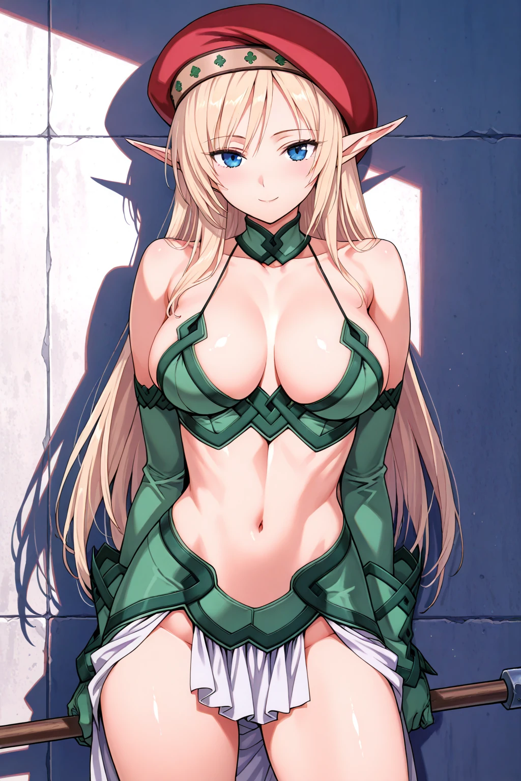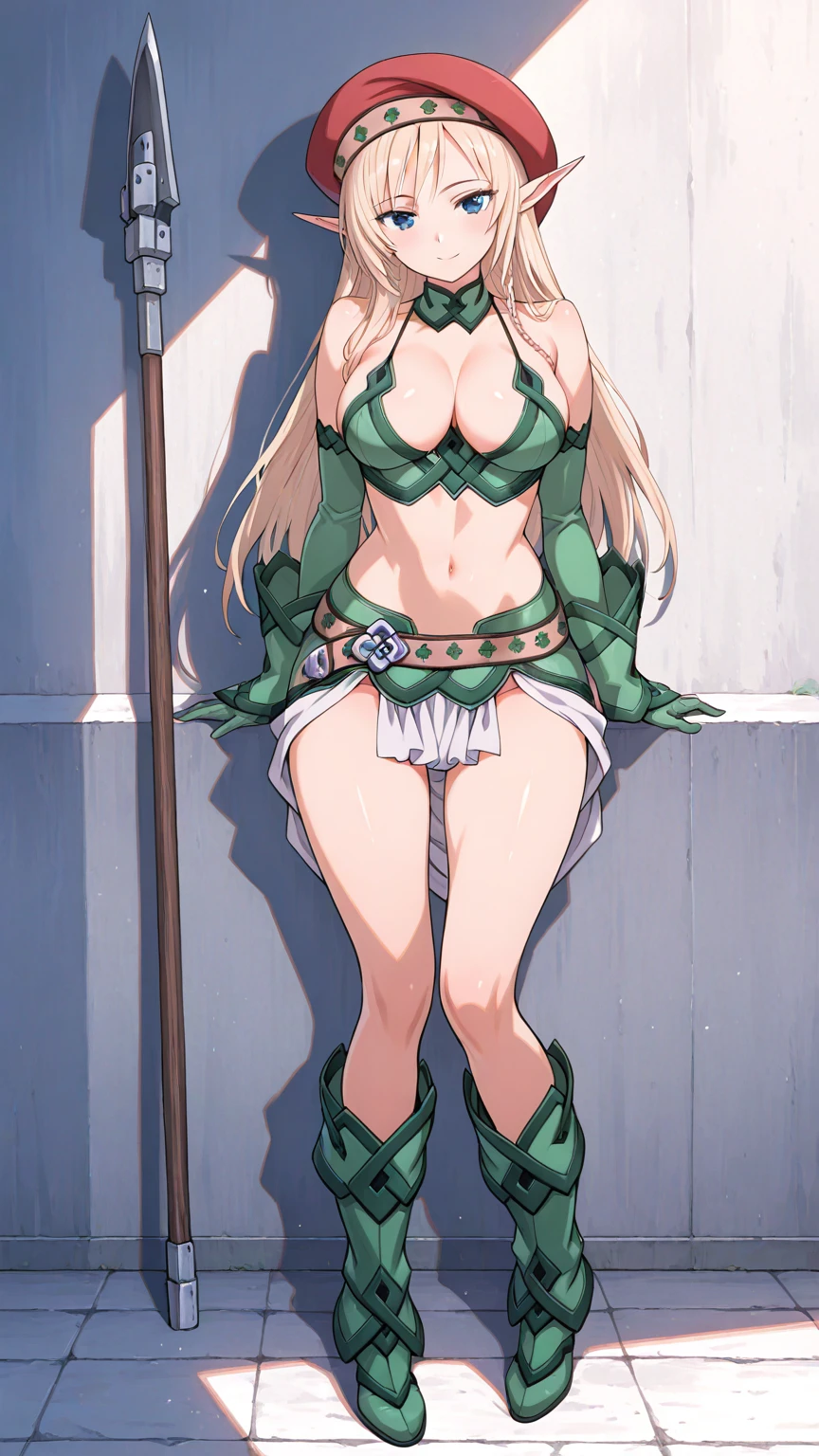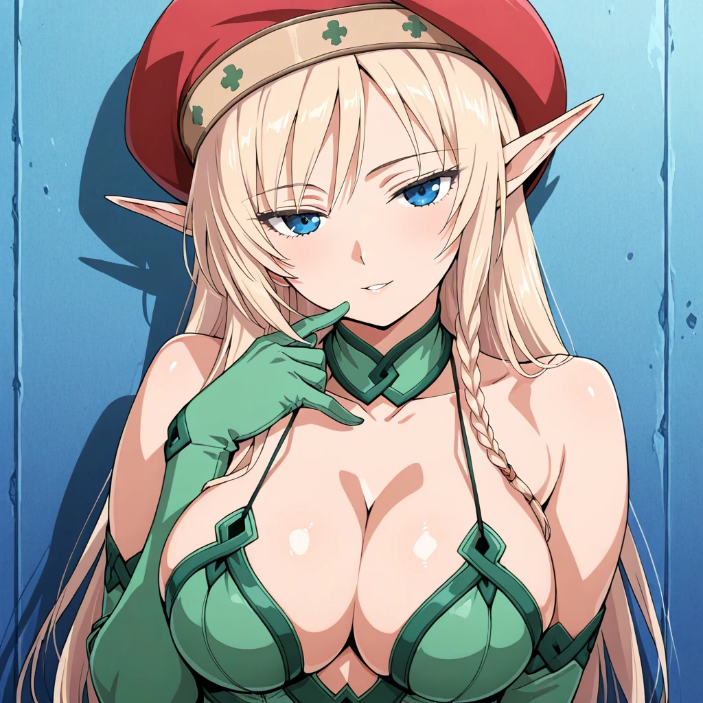 activation tag is "alleyne", outfit tag is "elf, pointy ears, blue eyes, hat, beret, braid, blonde hair, large breasts, long hair, side braid, green footwear, cape, thighhighs"