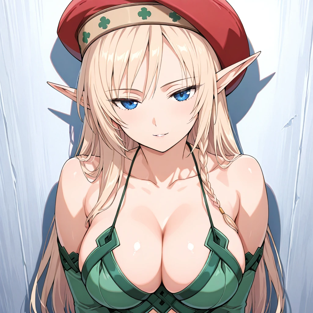 alleyne, 1girl, solo, elf, pointy ears, long hair, blue eyes, single braid, large breasts, blonde hair,