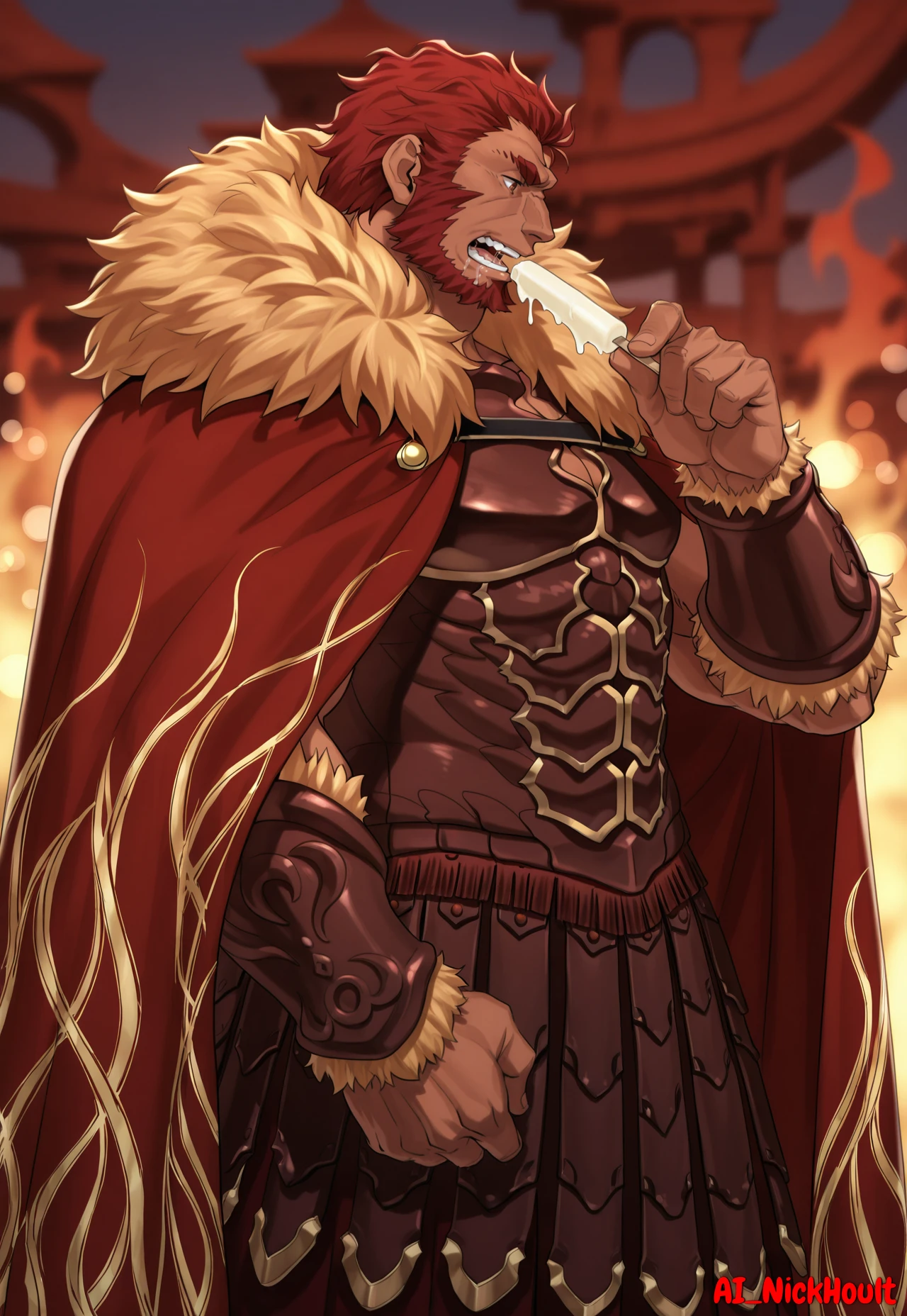 Iskandar, mature man, muscular build, short spiky red hair, facial hair, red beard, orange eyes, fair skin,Large red cloak, thick fur collar, gold flame patterns on cloak, ornate bronze breastplate, layered leather faulds, pteryges skirt, dark brown undertunic, bronze bracers with fur trim,Description