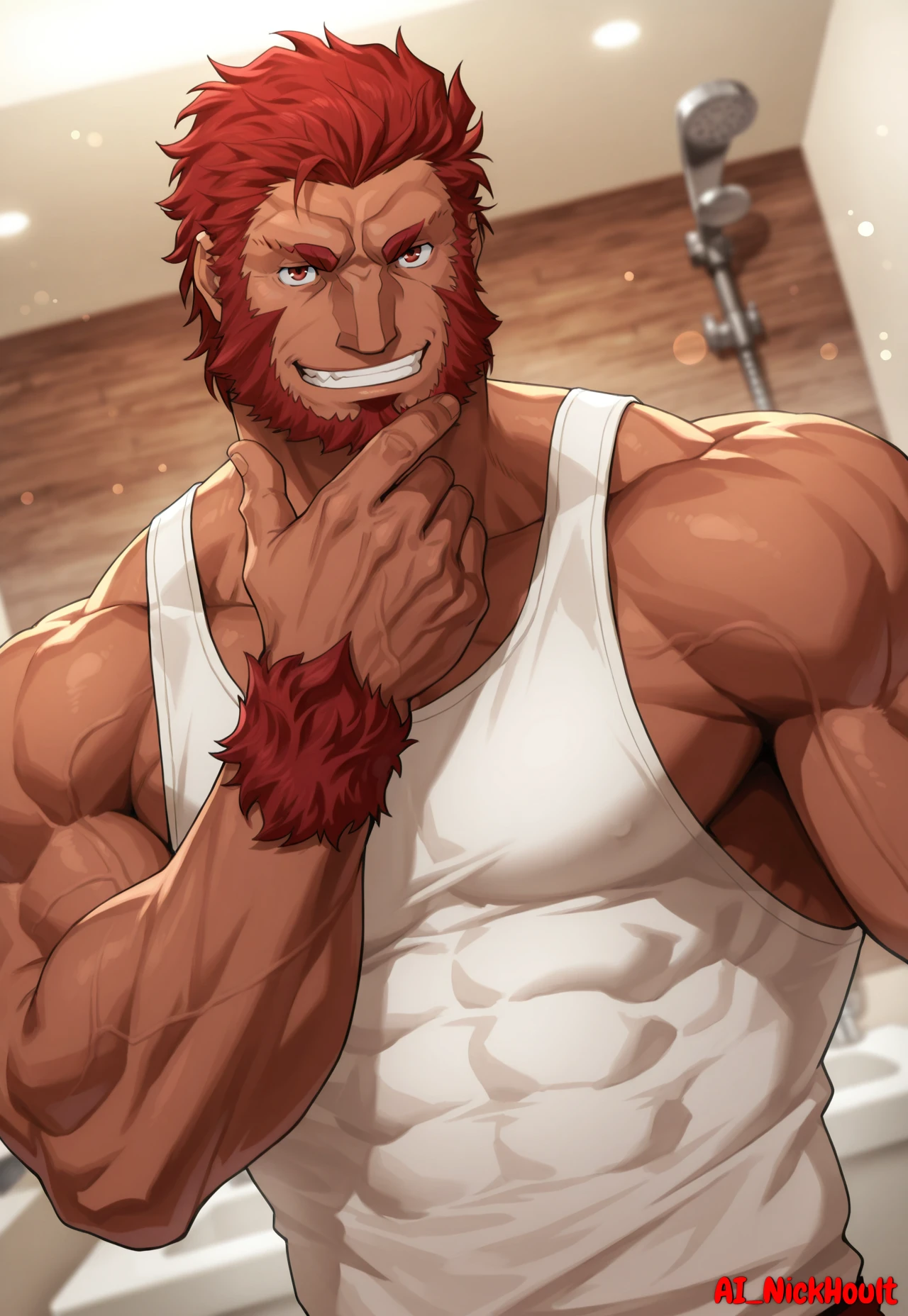 Iskandar, mature man, muscular build, short spiky red hair, facial hair, red beard, orange eyes, fair skin,