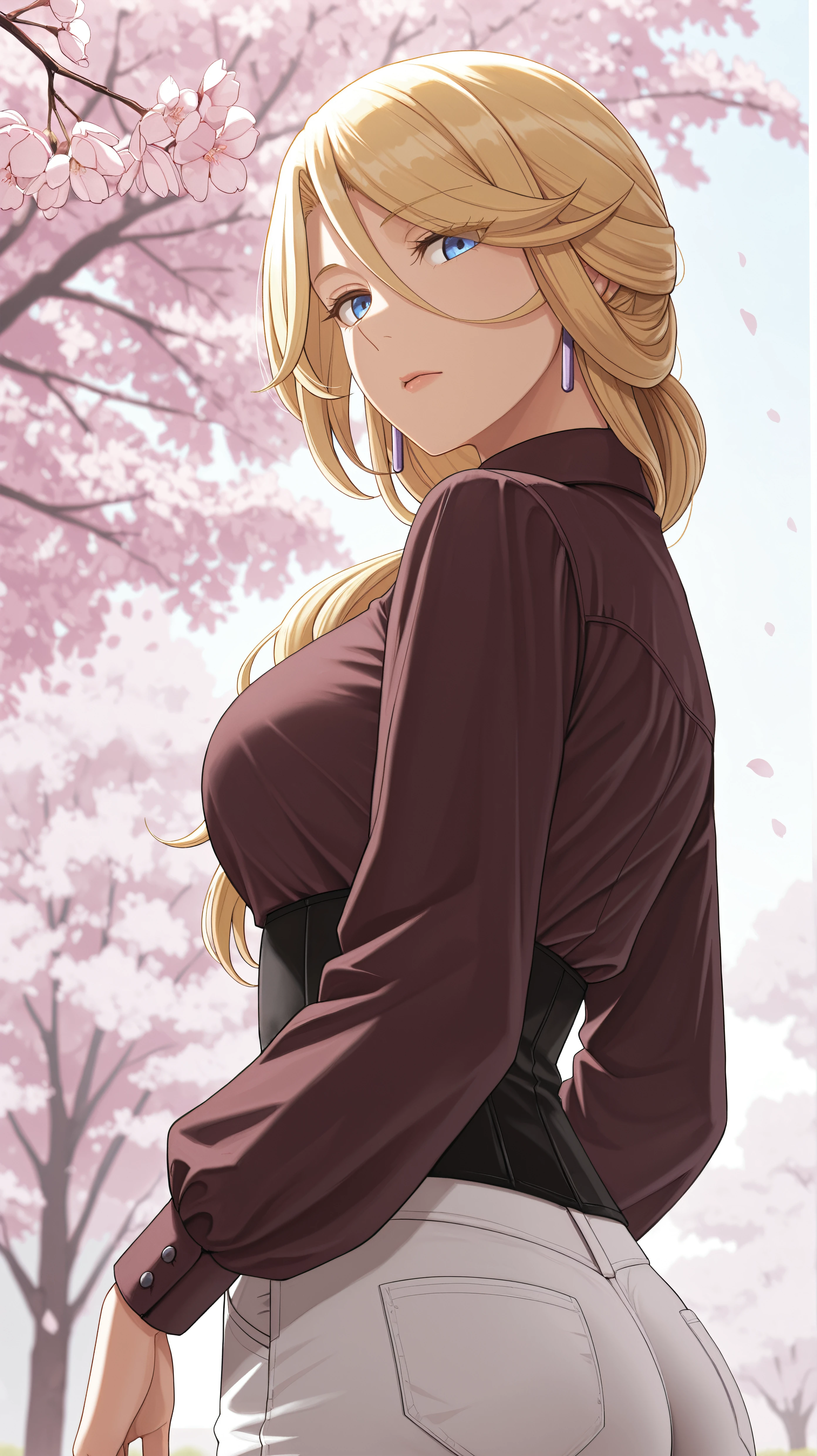 lisa-rembrandt, blonde hair, blue eyes, earrings, blue choker, necklace, blue dress with gold trim, long sleeves, layered sleeves, white bodice, bludress,lisa-rembrandt, long hair, blonde hair, blue eyes, earrings, dark burgundy shirt, collared shirt, black bodice, white pants, brgoutfit,Description