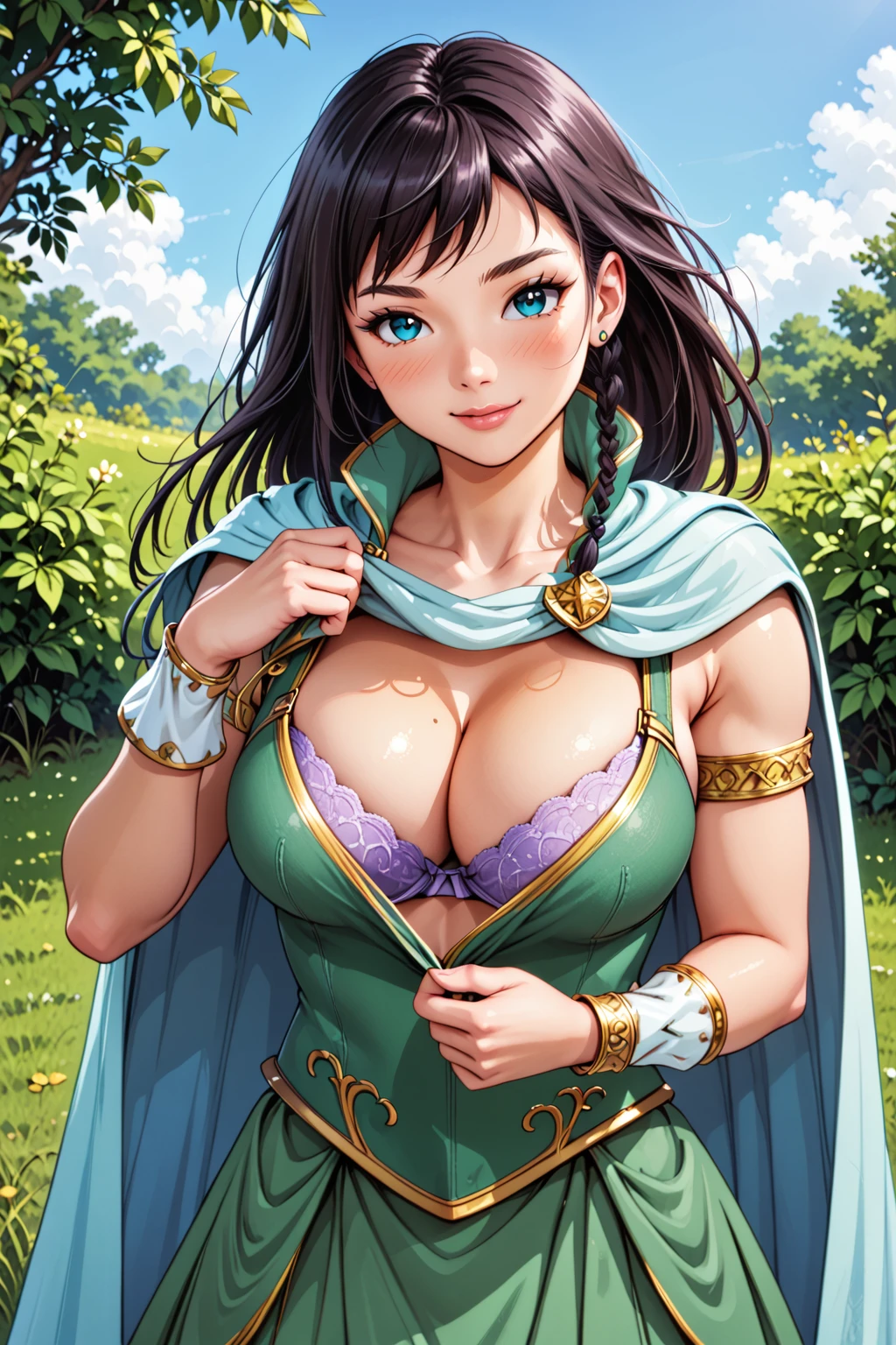 Trigger : kala, long hair, braid, high collar, cleavage, bra, armor, cape, armlet, arm guards, skirt, boots