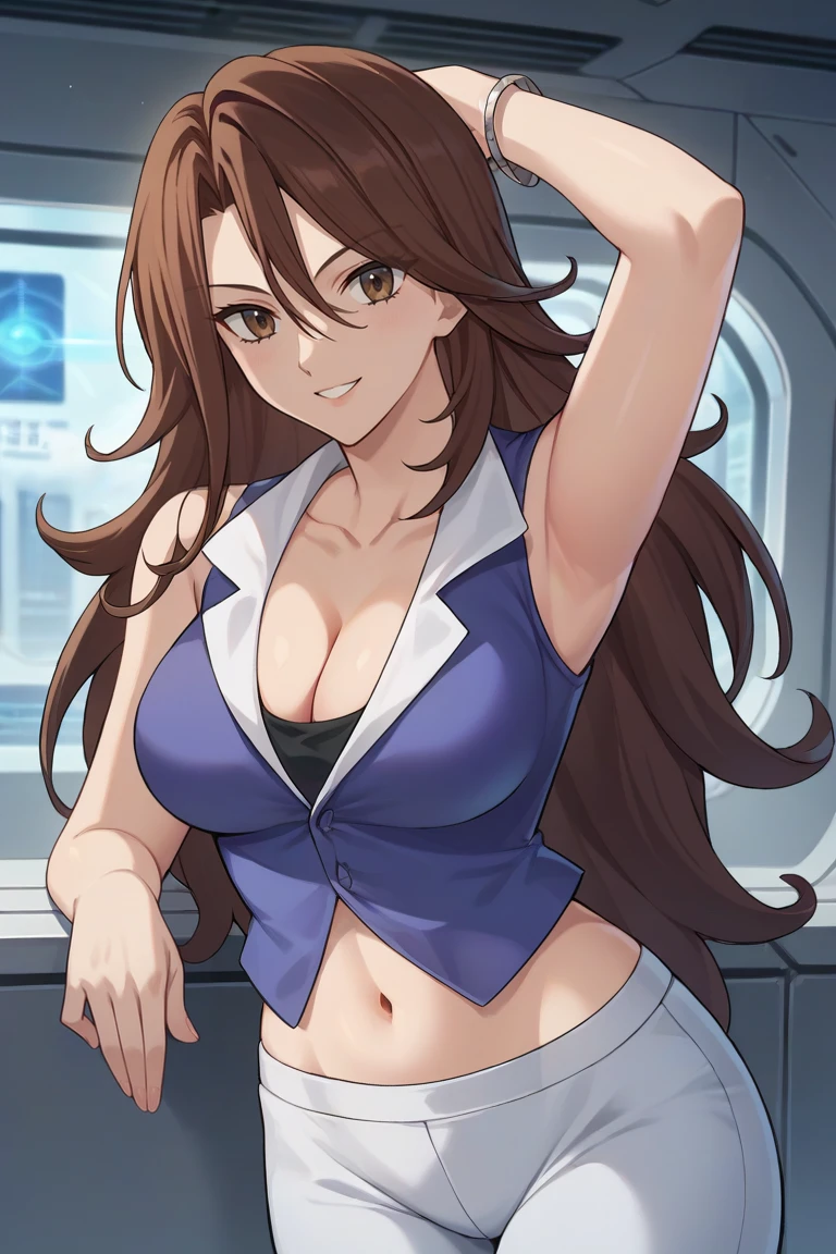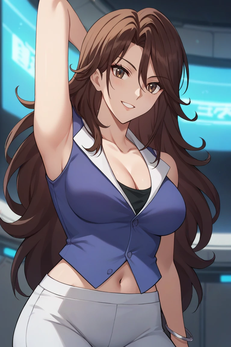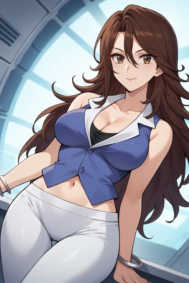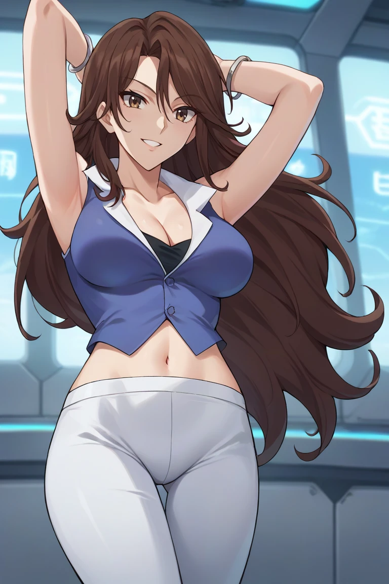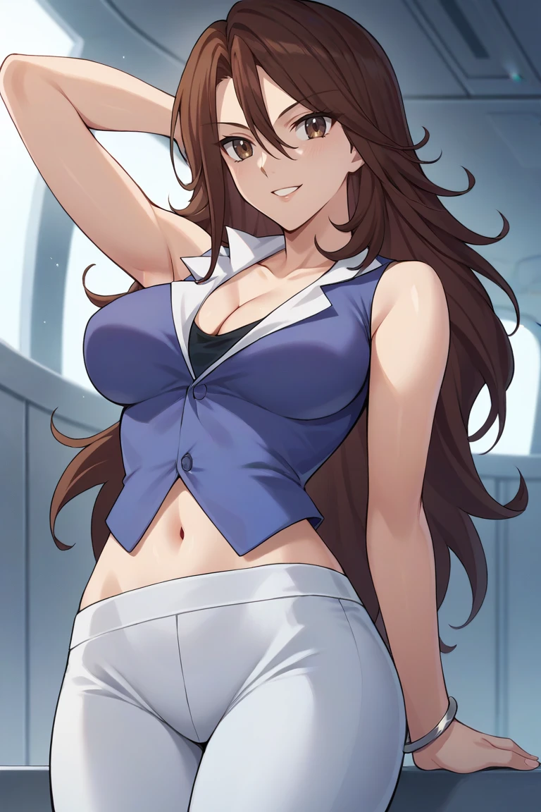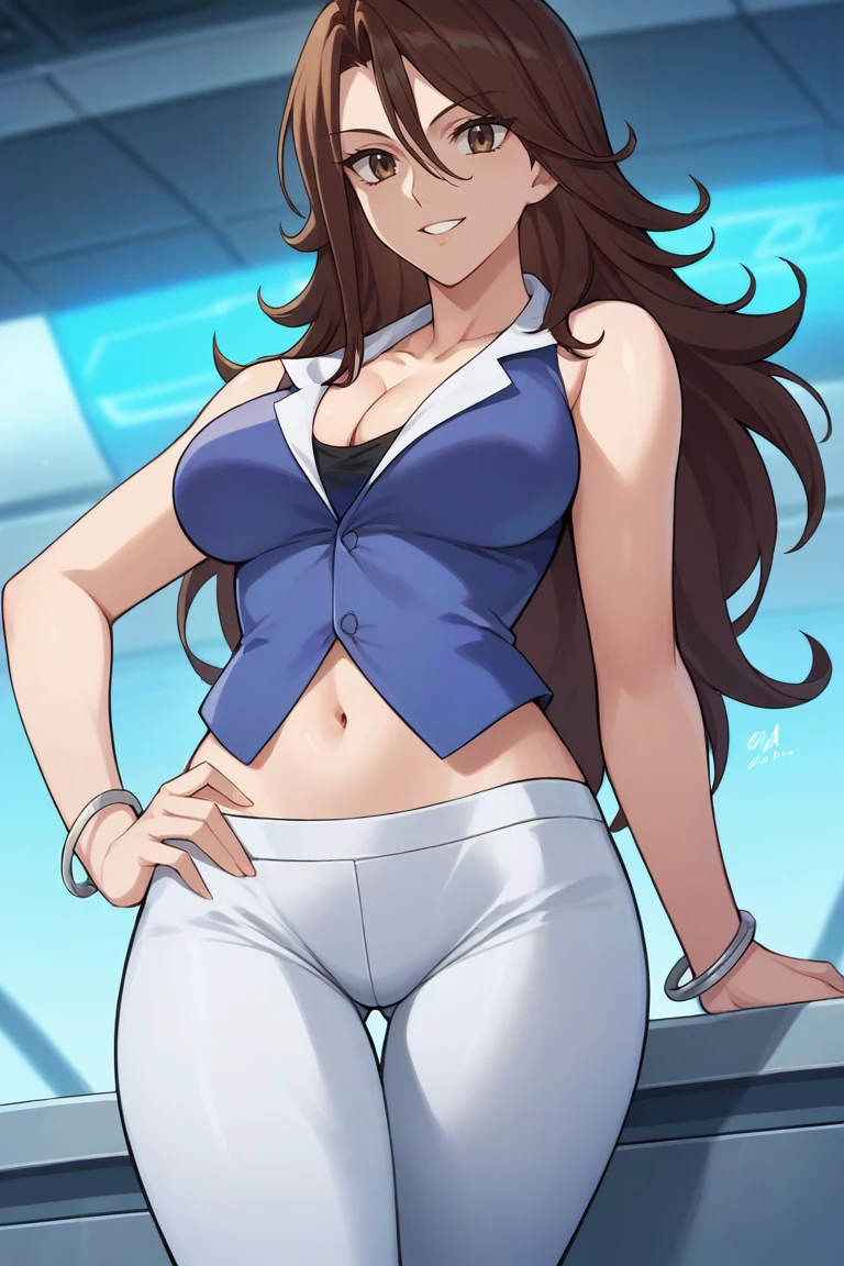 crop top, blue vest, cleavage, sleeveless, midriff, navel, white pants, tight pants