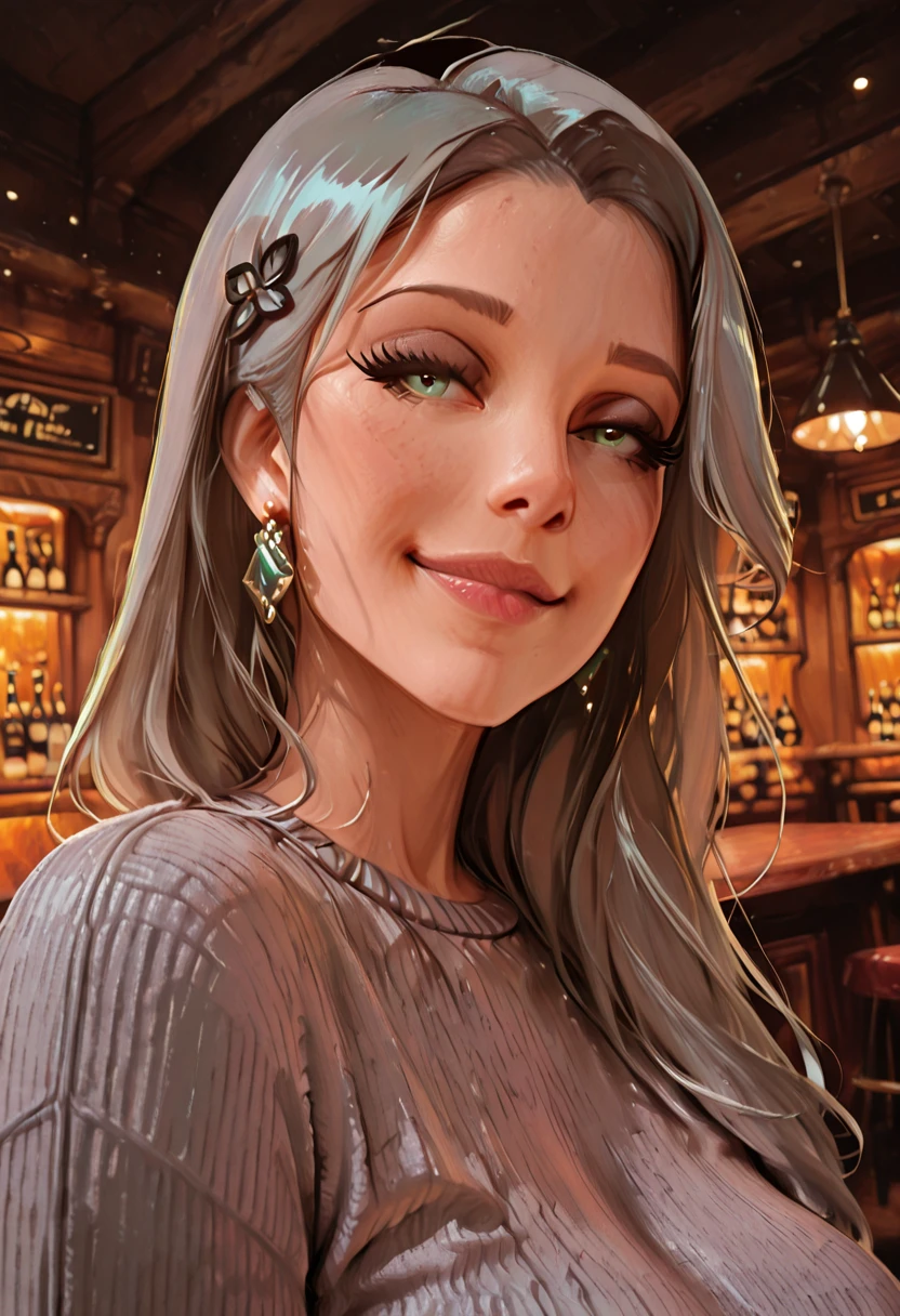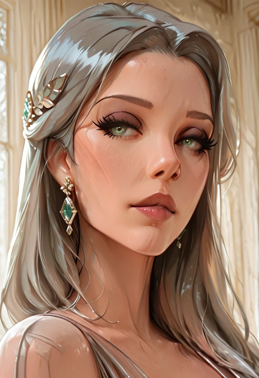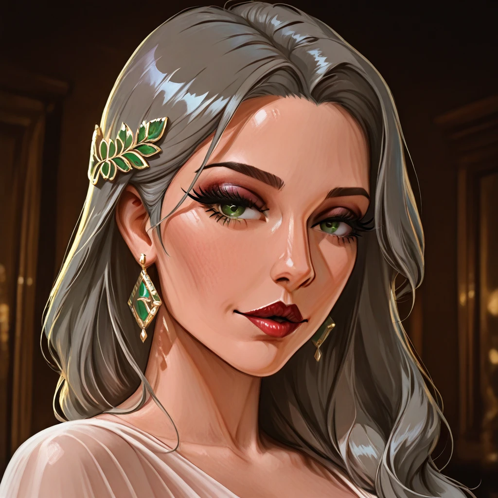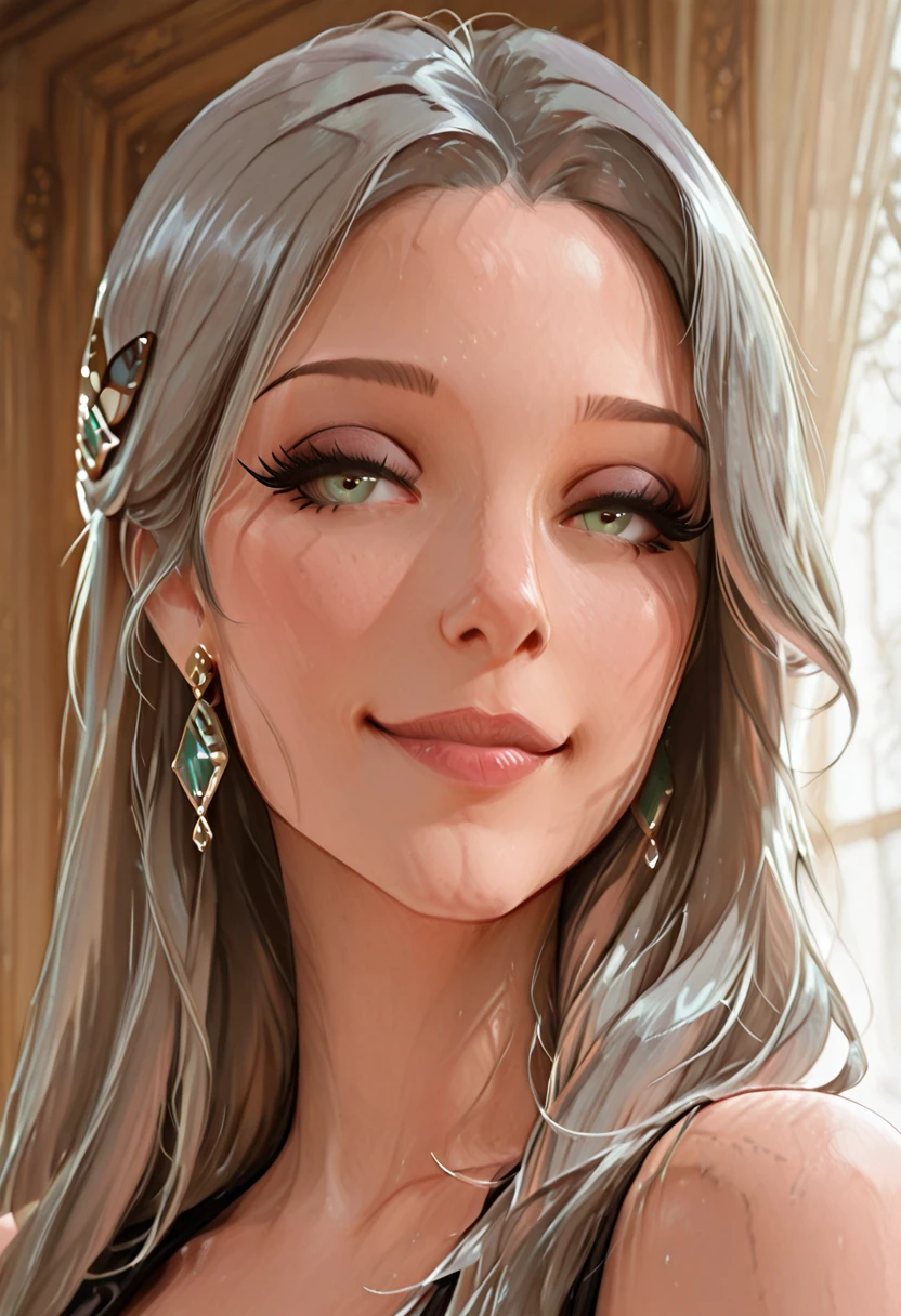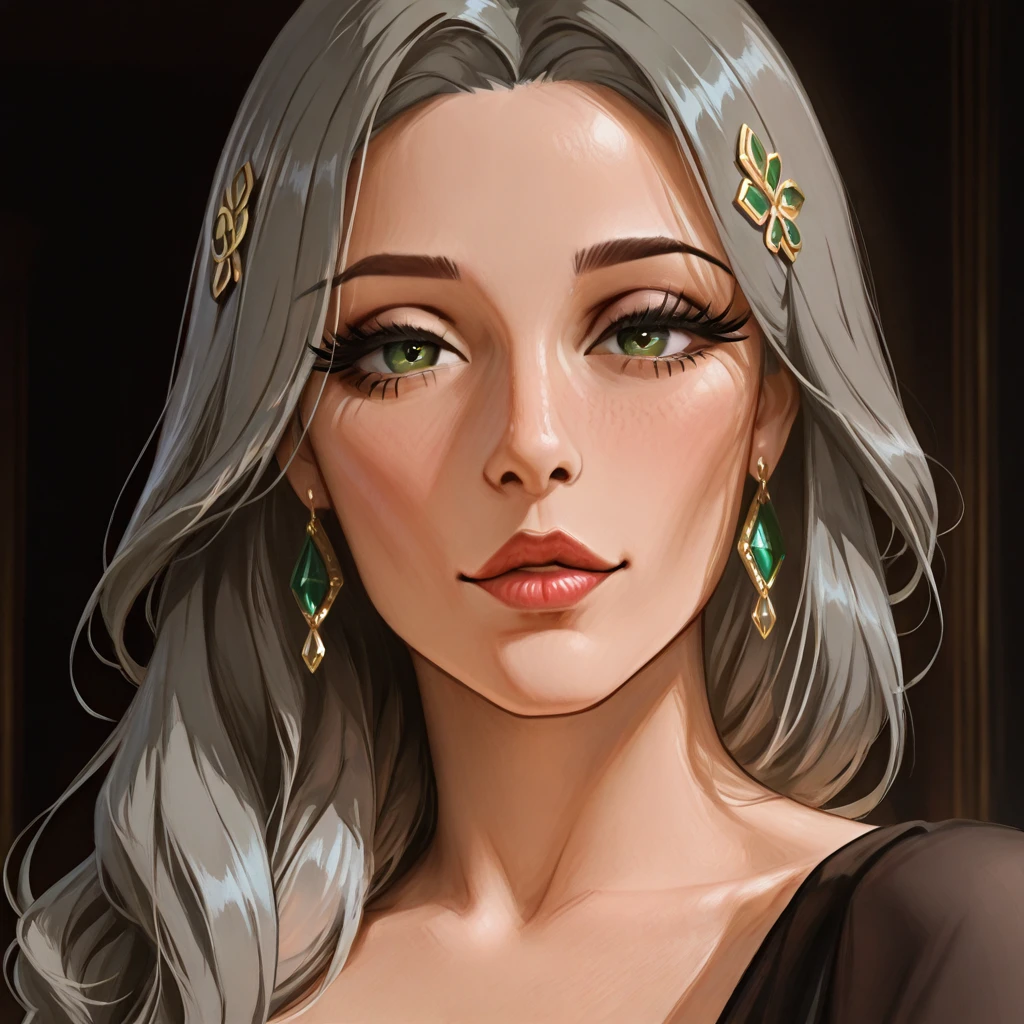 mrseliza, solo, 1girl, adult woman, grey hair, long hair, green eyes,