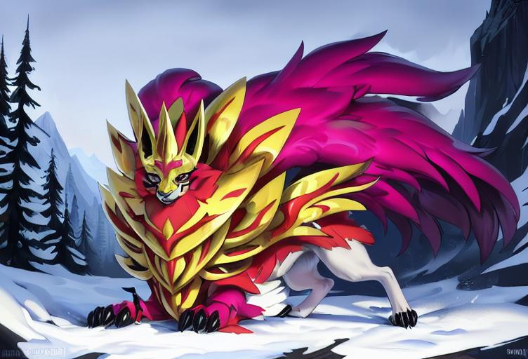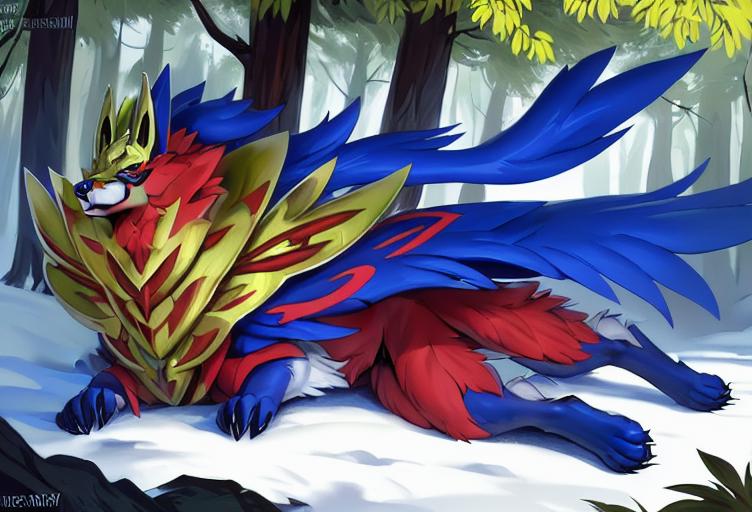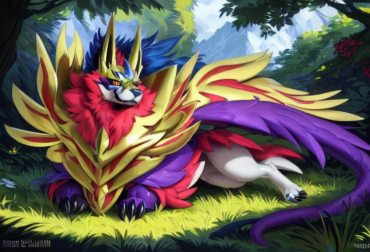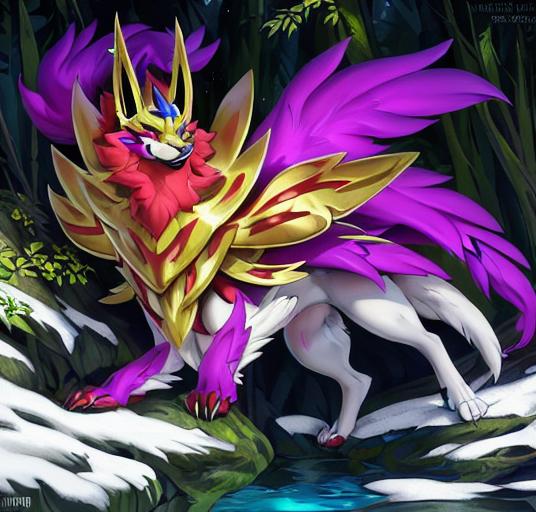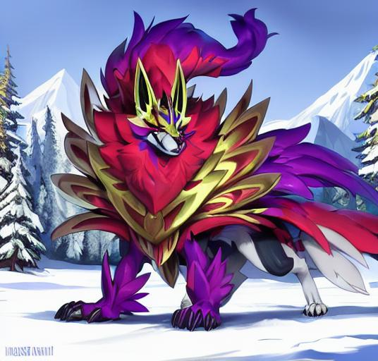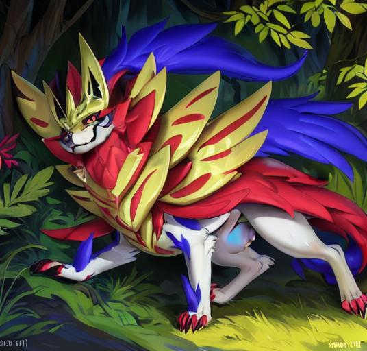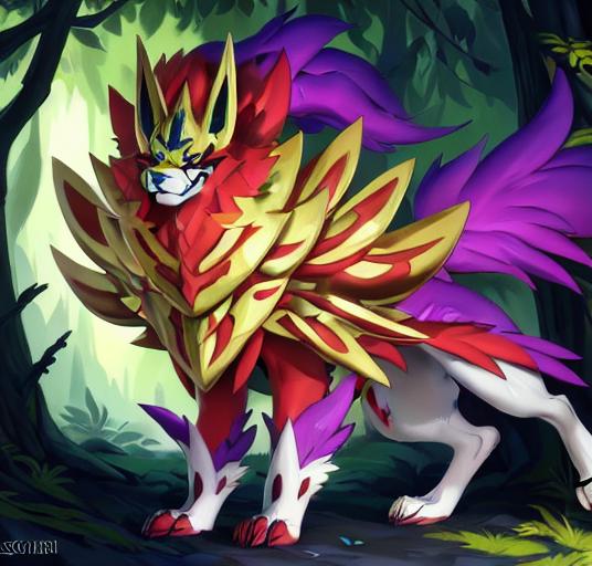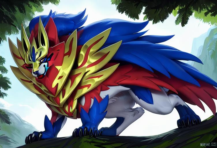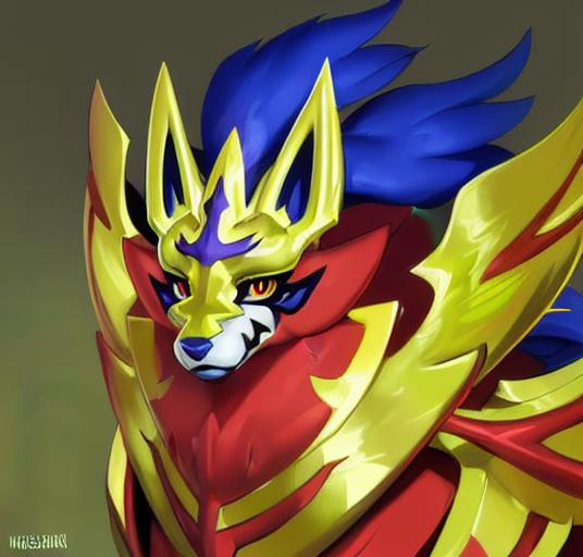 建议添加的描述词有:canine,zamazanta,full body/headshot portrait,pokemon, claws, armor, standing等等