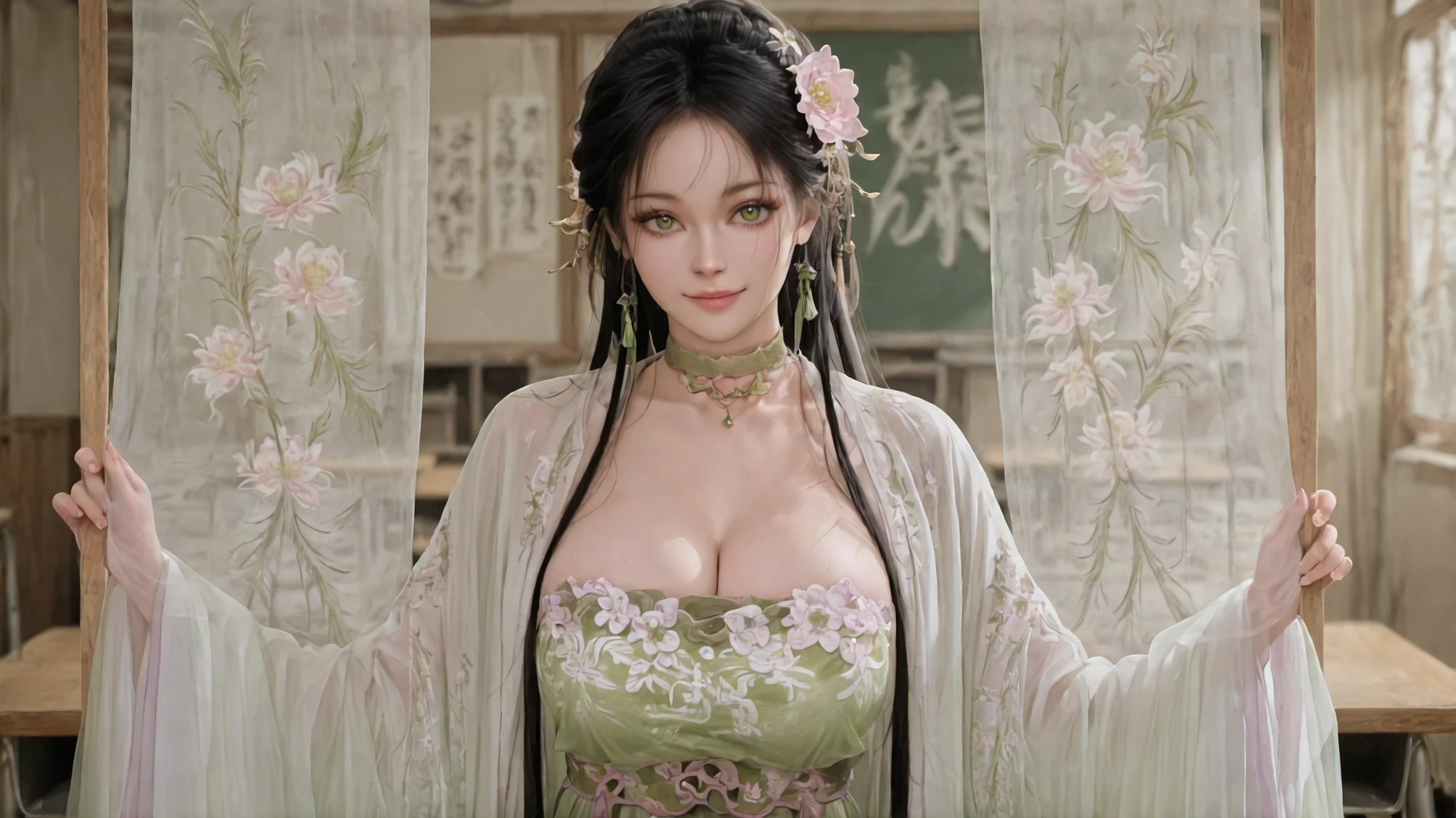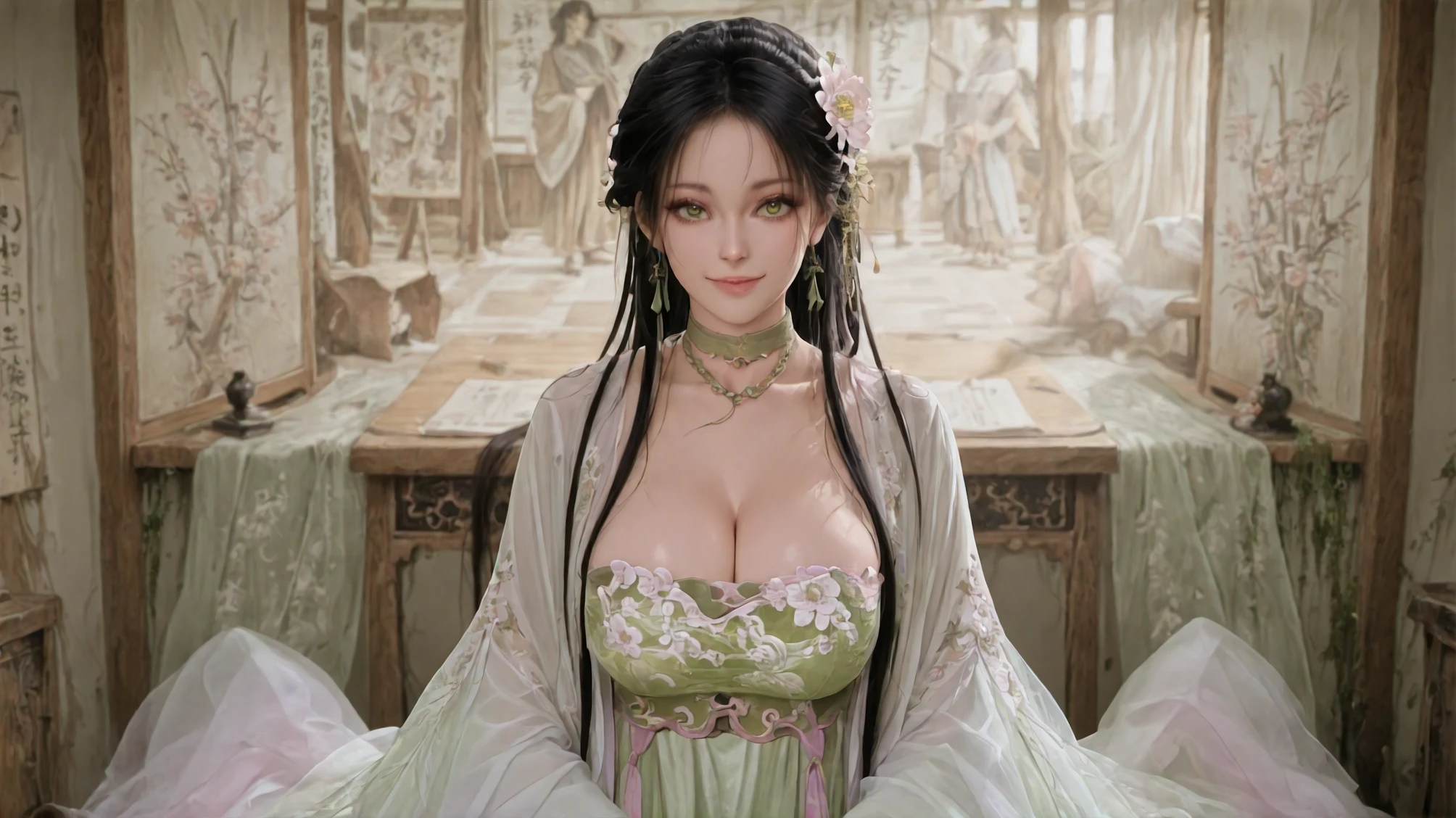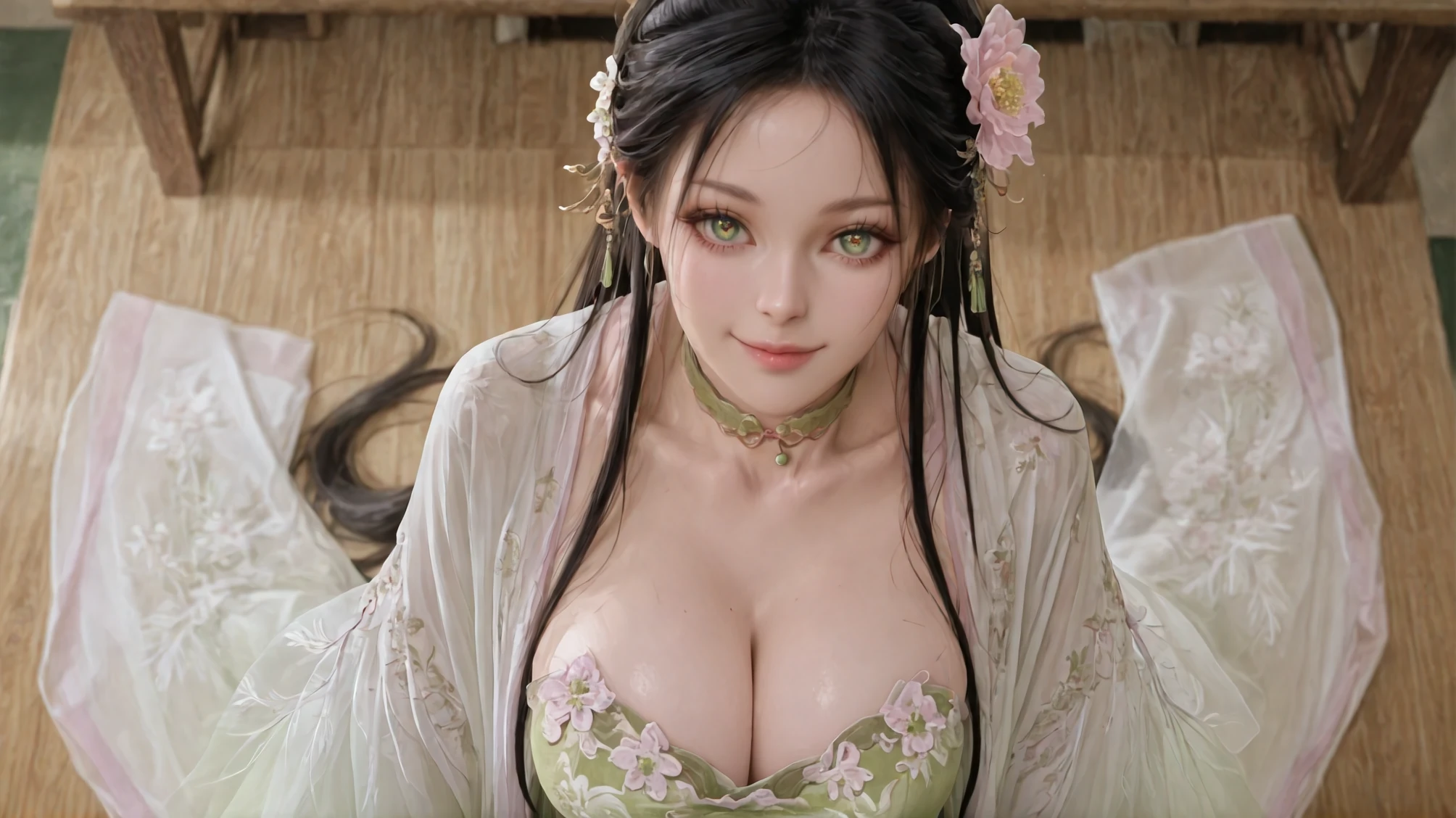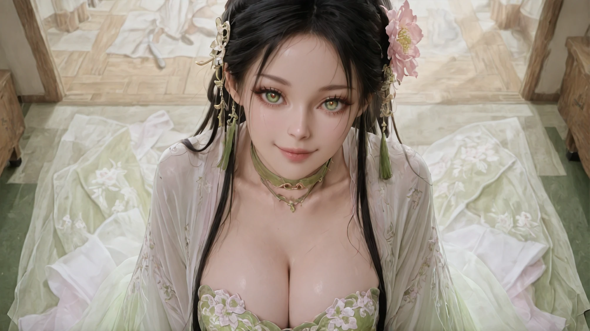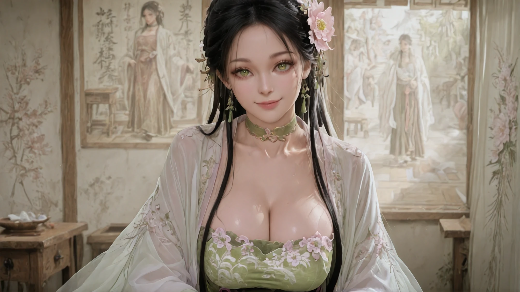 Zephyr Invoked: Where Wind Unseals Spring's Sigil,dress,chinese clothes,jewelry,hanfu,green dress,choker,hair flower,long sleeves,hair ornament,beads,white haori,peony \(flower\) print