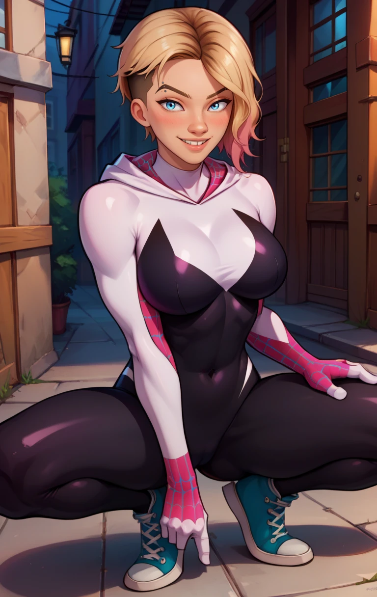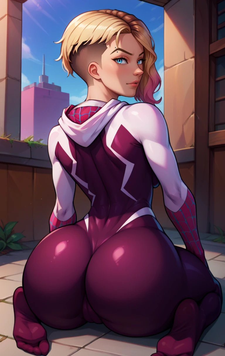 GwenstacySDXL, short hair, blue eyes, blonde hair, piercing, asymmetrical hair, eyebrow piercing