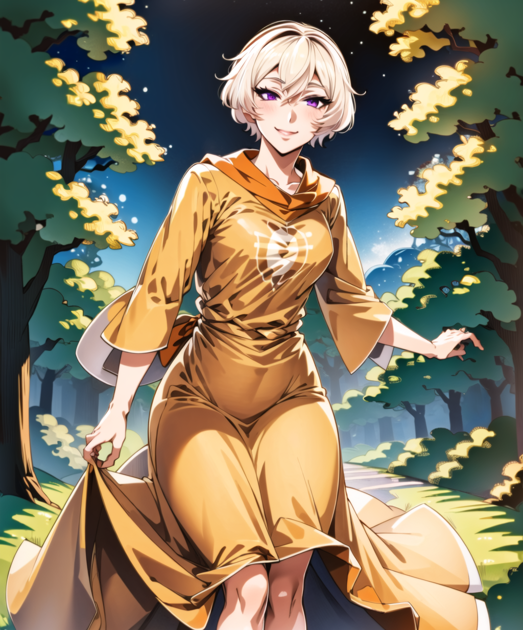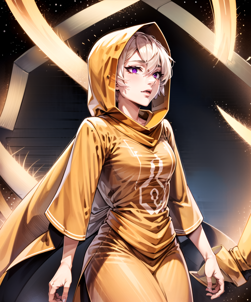 "Godtier, orange dress" Brings out her Godtier outfit (and "hood" brings out the hood!)