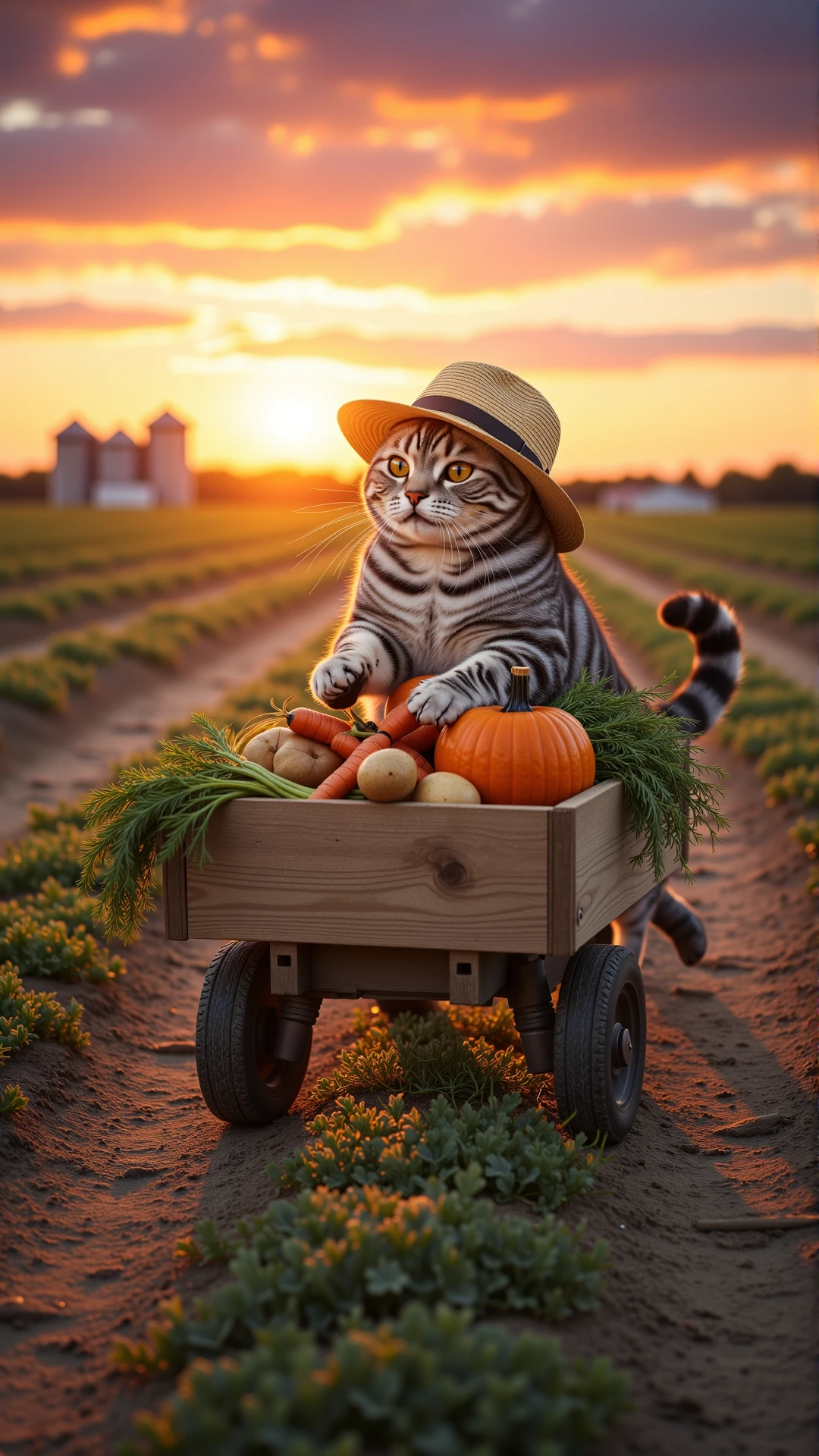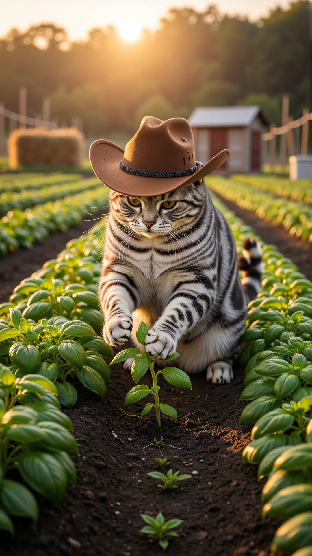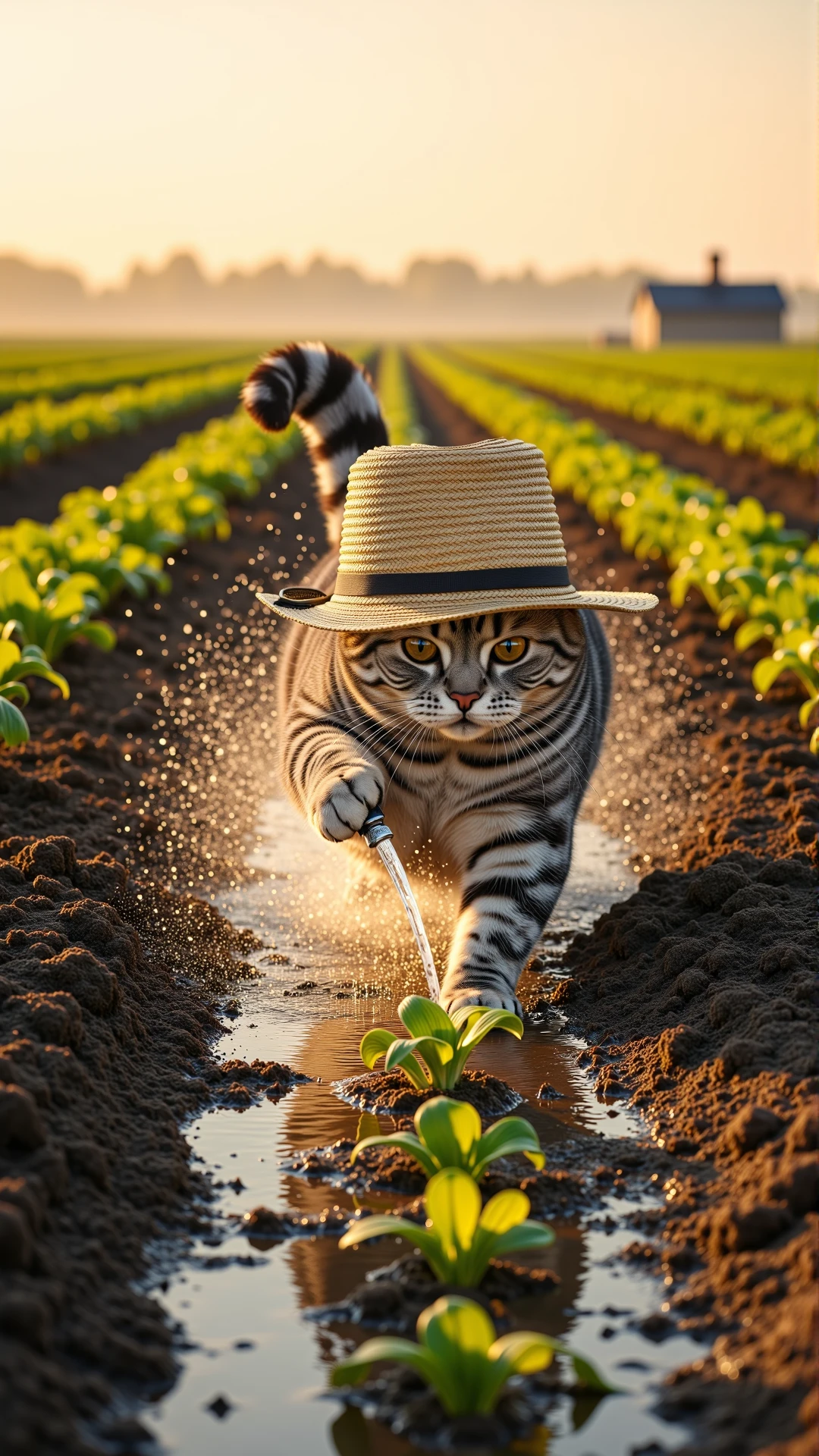 A hyperrealistic, cinematic photograph of a chubby American Shorthair cat, wearing a straw hat, diligently working in a sun-drenched farm garden during the early morning. The cat, meticulously detailed with its tabby fur, round face, and expressive eyes, is depicted in a natural, slightly hunched posture, one paw gently resting on a miniature, child-sized wheelbarrow filled with freshly picked carrots. Its other paw is delicately placed near a row of newly sprouted seedlings, as if carefully tending to them. The setting is a vibrant, well-tended farm garden, with neat rows of young, green vegetable plants (e.g., lettuce, spinach) stretching into the mid-ground. The rich, dark earth is tilled and fertile, with scattered straw mulch visible between rows. Soft, golden sunlight streams from the top right, creating dappled light and long, ethereal shadows that highlight the textures of the cat's fur and the surrounding plants. The lighting is bright yet diffused, emphasizing realistic details without harsh reflections. The camera framing is a medium close-up, slightly low-angle, capturing the cat at eye level and emphasizing its focused interaction with the plants and wheelbarrow. A shallow depth of field softly blurs the background into a painterly wash of greens and browns, hinting at distant farm buildings and fields, keeping the cat and the immediate garden in sharp focus. The overall mood is whimsical, serene, and heartwarming, with a fresh, natural color palette dominated by vibrant greens, earthy browns, and the tabby pattern of the cat's fur, accented by the subtle glint of sunlight.
