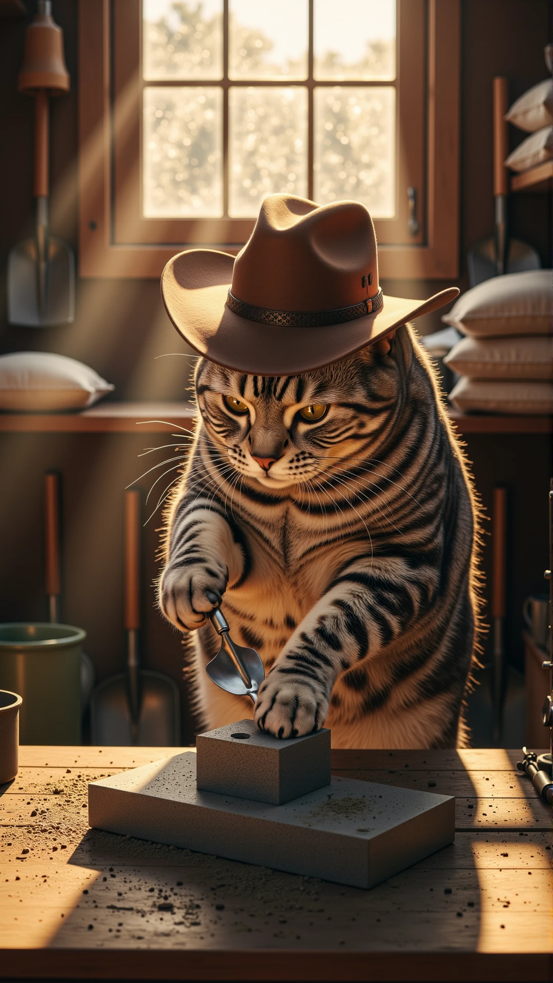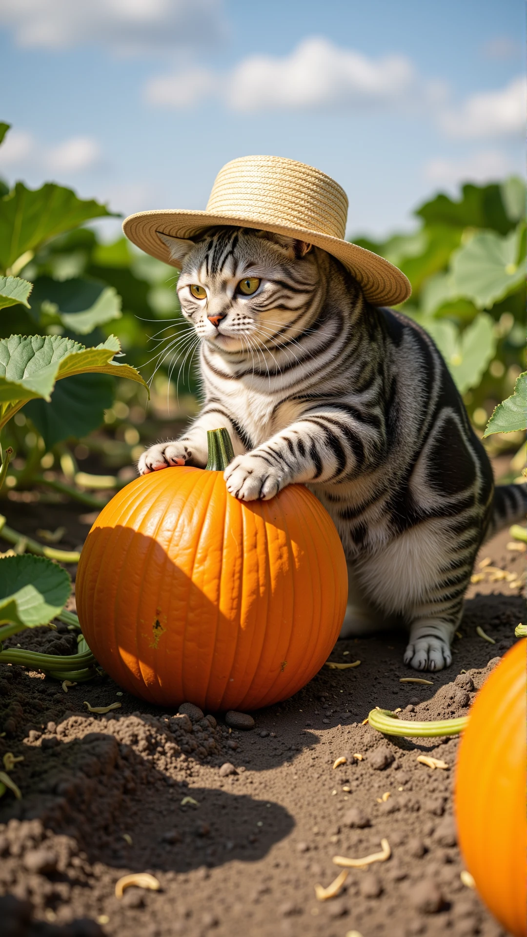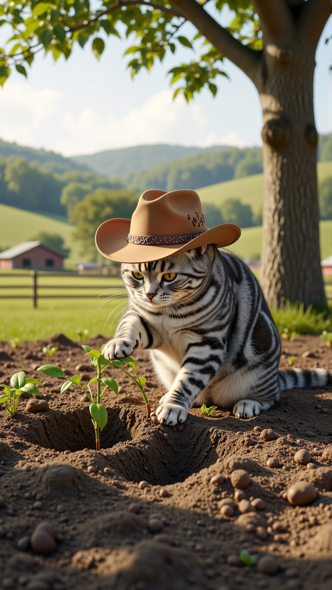 A hyperrealistic, cinematic photograph of a chubby American Shorthair cat, wearing a straw hat, diligently working in a sun-drenched farm garden during the early morning. The cat, meticulously detailed with its tabby fur, round face, and expressive eyes, is depicted in a natural, slightly hunched posture, one paw gently resting on a miniature, child-sized wheelbarrow filled with freshly picked carrots. Its other paw is delicately placed near a row of newly sprouted seedlings, as if carefully tending to them. The setting is a vibrant, well-tended farm garden, with neat rows of young, green vegetable plants (e.g., lettuce, spinach) stretching into the mid-ground. The rich, dark earth is tilled and fertile, with scattered straw mulch visible between rows. Soft, golden sunlight streams from the top right, creating dappled light and long, ethereal shadows that highlight the textures of the cat's fur and the surrounding plants. The lighting is bright yet diffused, emphasizing realistic details without harsh reflections. The camera framing is a medium close-up, slightly low-angle, capturing the cat at eye level and emphasizing its focused interaction with the plants and wheelbarrow. A shallow depth of field softly blurs the background into a painterly wash of greens and browns, hinting at distant farm buildings and fields, keeping the cat and the immediate garden in sharp focus. The overall mood is whimsical, serene, and heartwarming, with a fresh, natural color palette dominated by vibrant greens, earthy browns, and the tabby pattern of the cat's fur, accented by the subtle glint of sunlight.