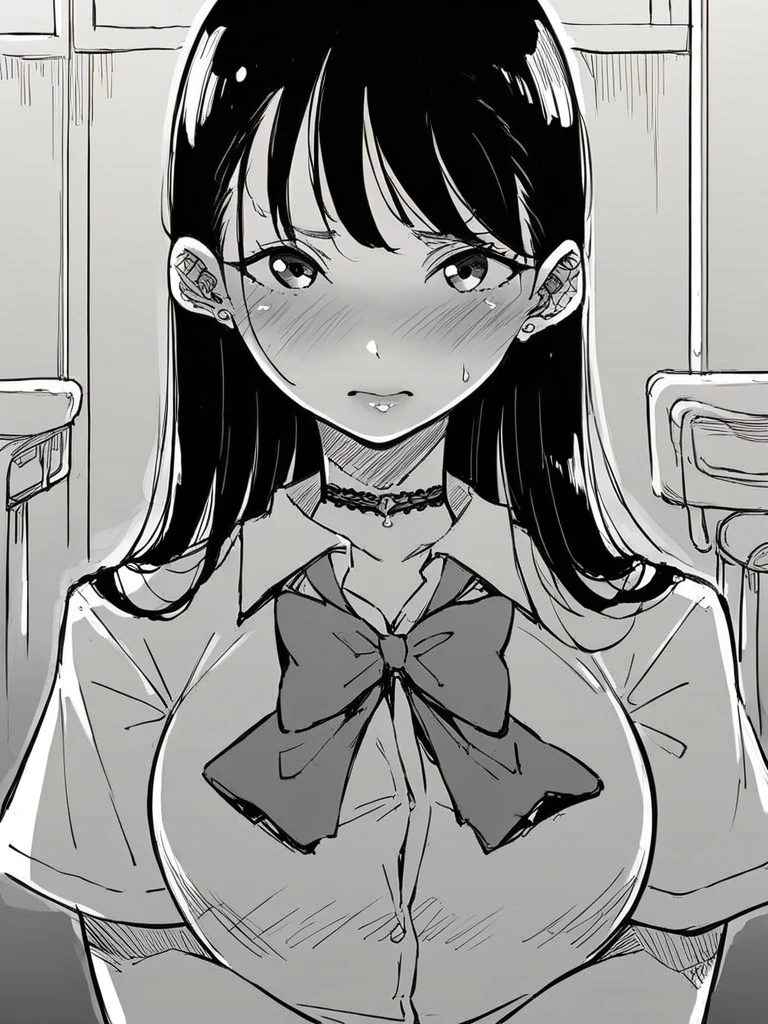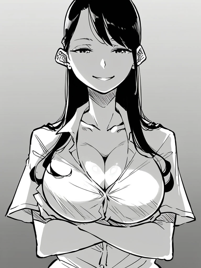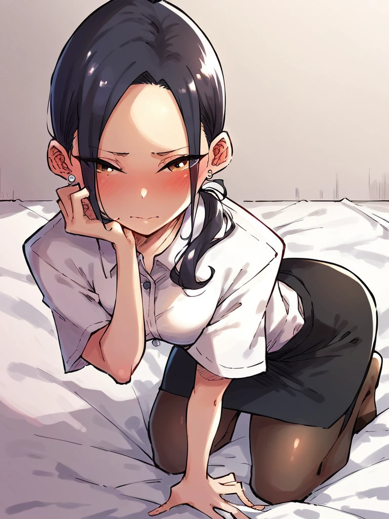 shibata chie, black hair, low ponytail, earrings,