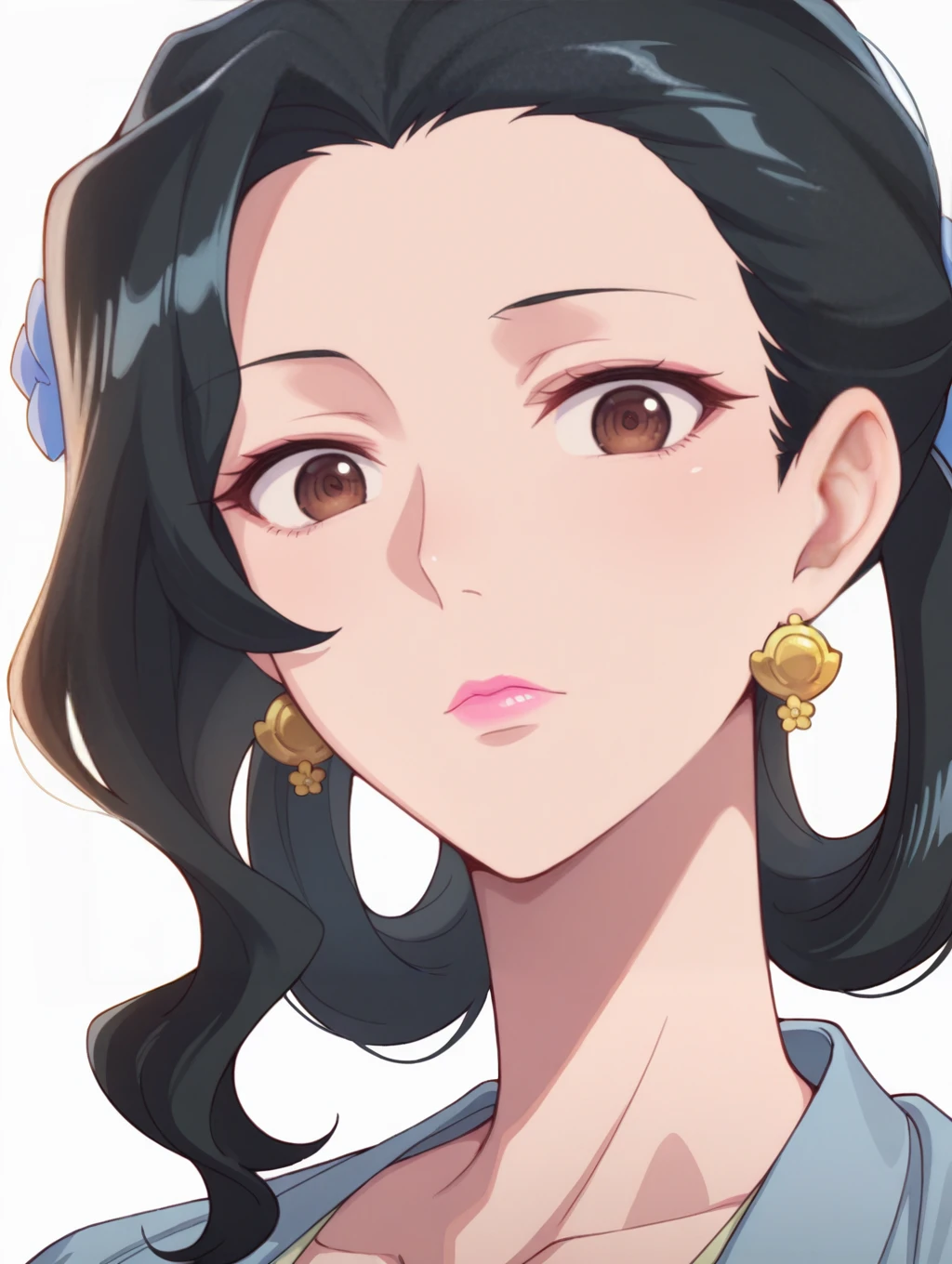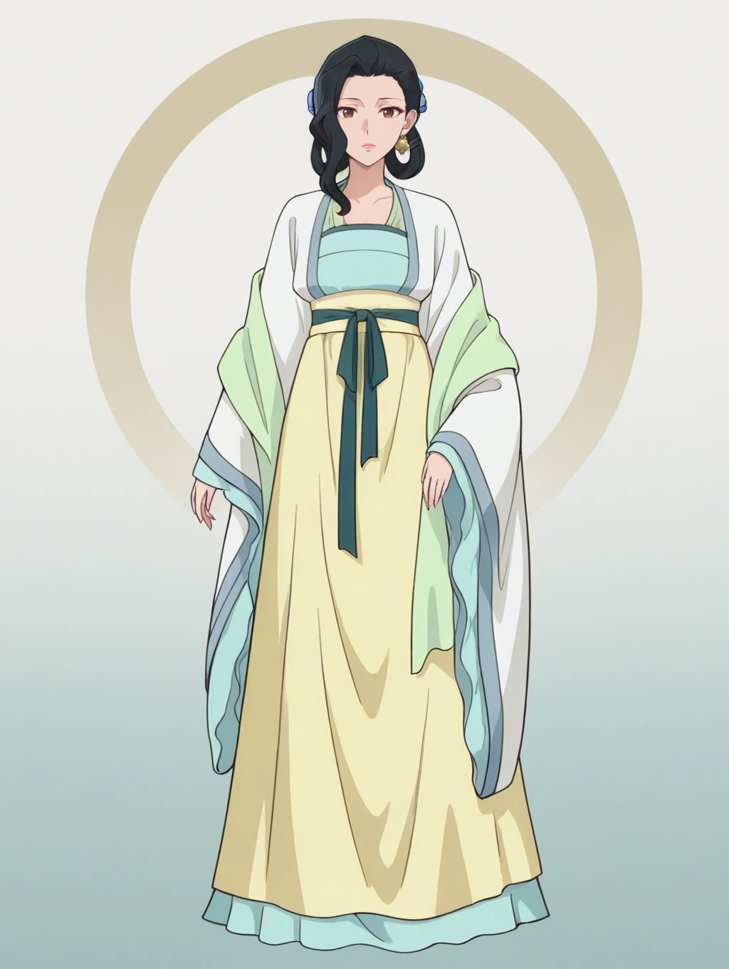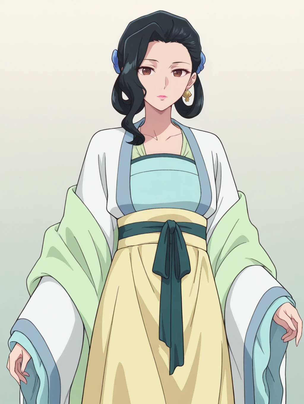 ywhenan,brown eyes,black hair,single sidelock,hair flower,hair rings,pink lips,earrings,white hanfu,wide sleeves,green shawl,green sash,yellow skirt,