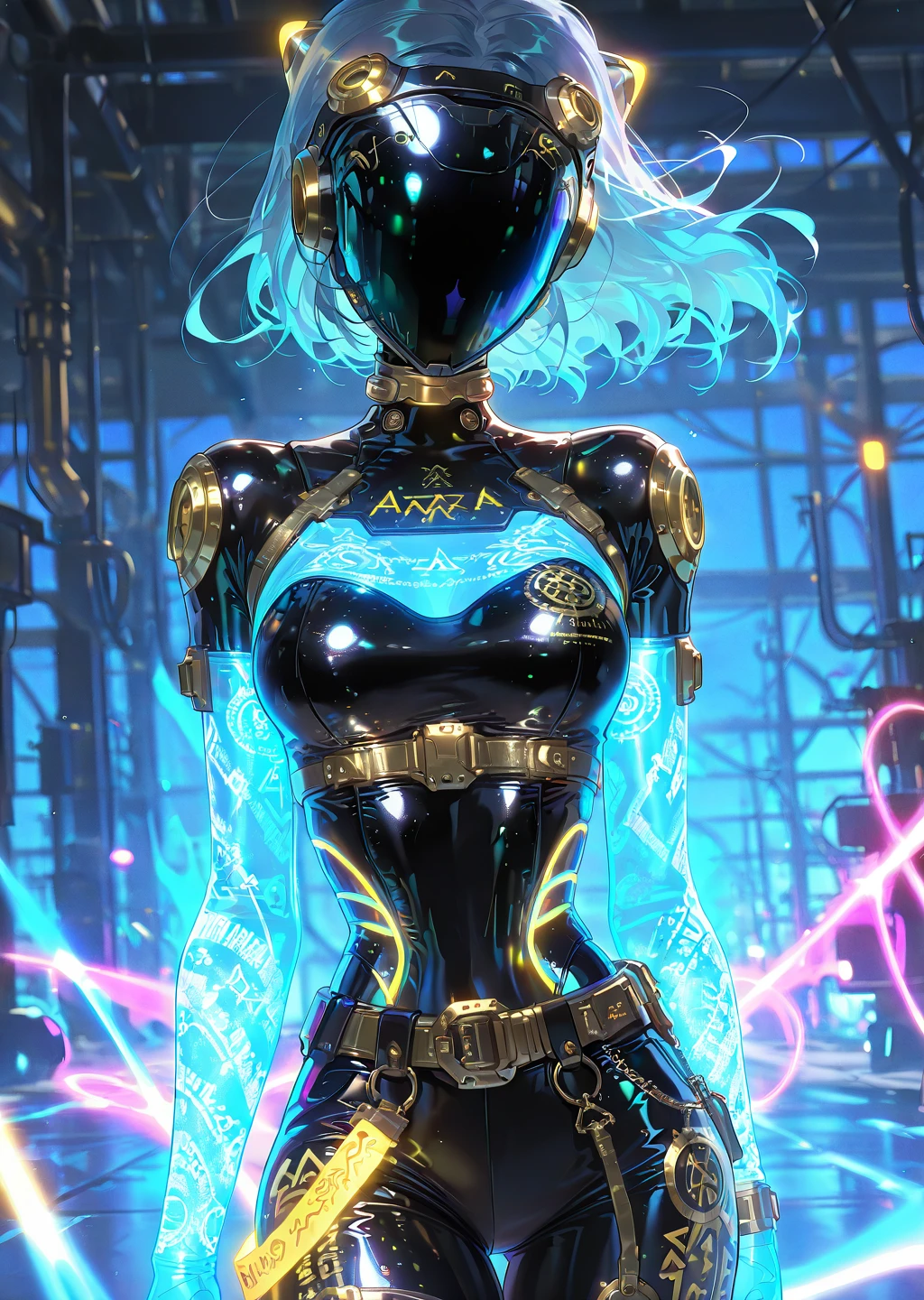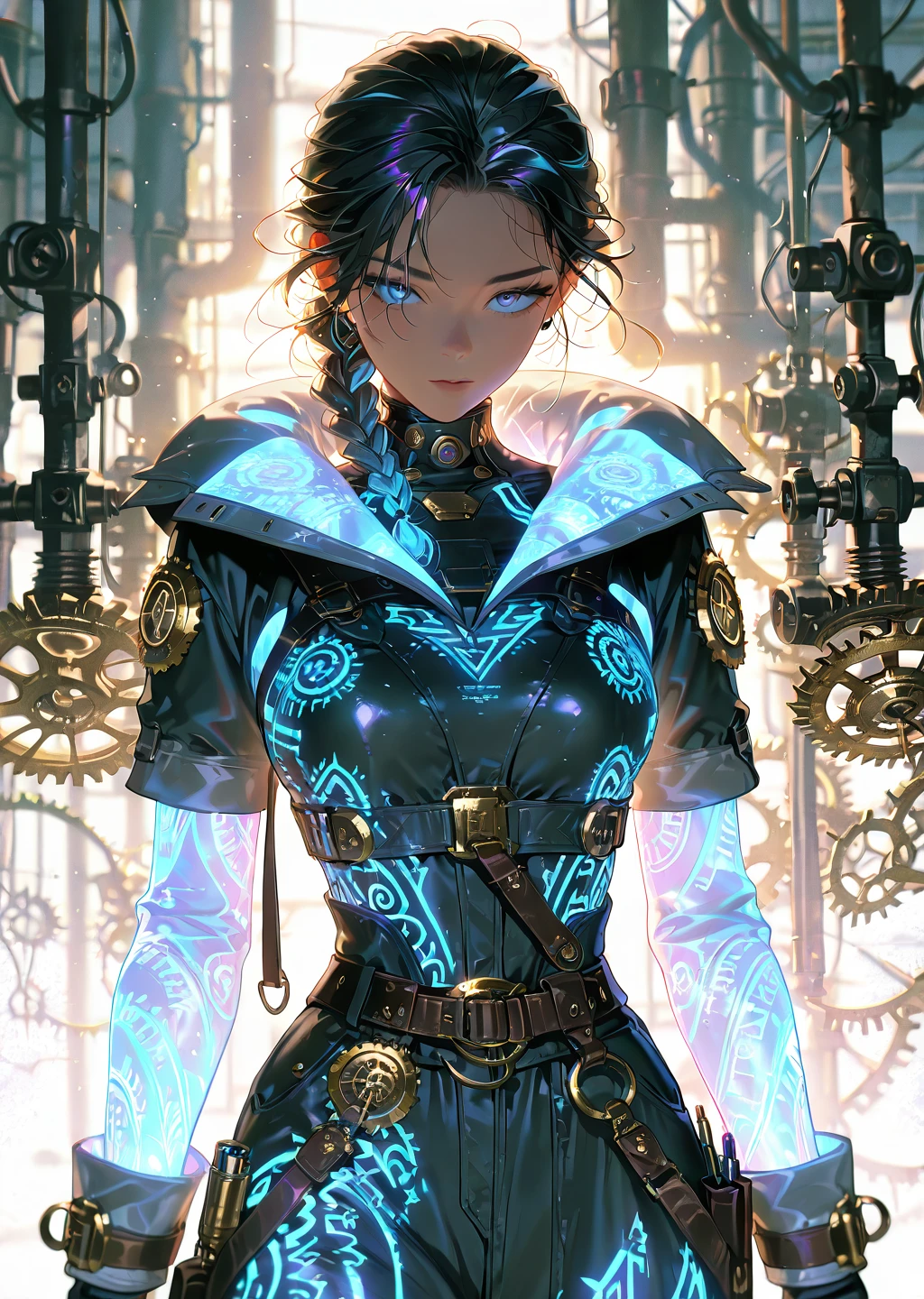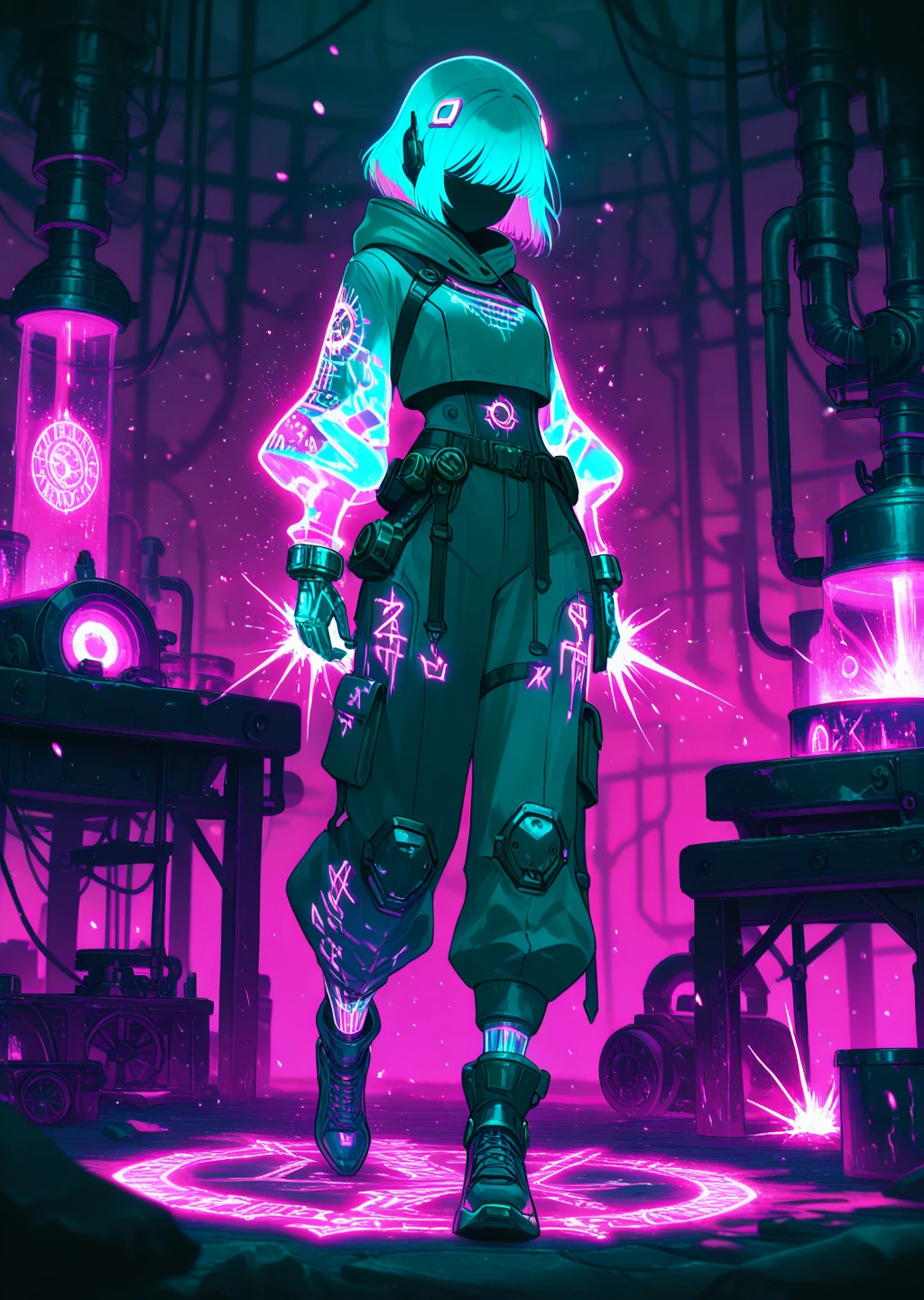 neon_style,neon glow,cyberpunk,arcane symbols,futuristic attire,glowing runes,vibrantDescription: A high-tech, glowing aesthetic with neon cyan and pink accents. The neon style is all about bright glowing arcane symbols and high contrast with the surrounding environment. Ideal for arcane engineers working with cutting-edge magical technology. The outfits have a sleek, high-tech vibe with dynamic glowing effects.